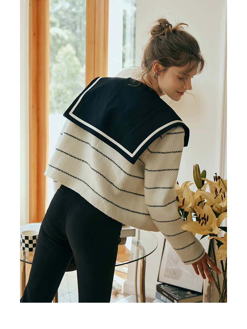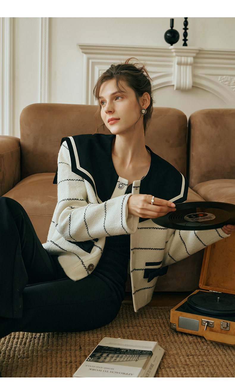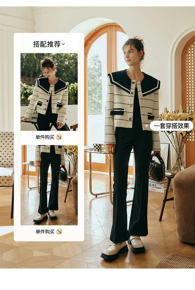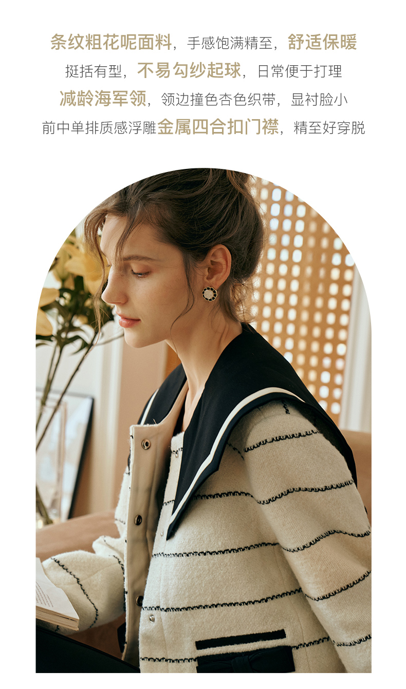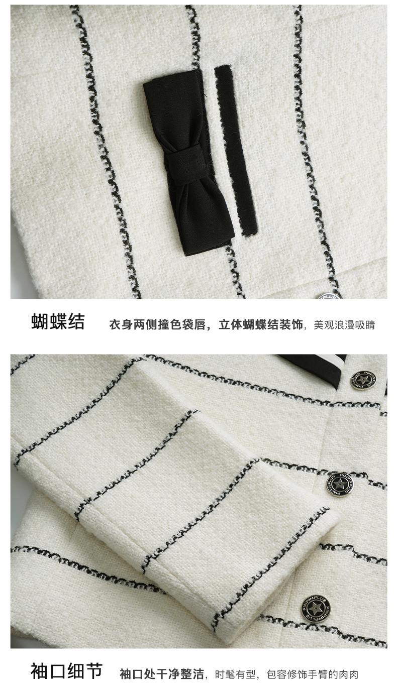 OLrain欧芮儿小香风短外套初秋2023新款减龄海军领条纹粗花呢上衣