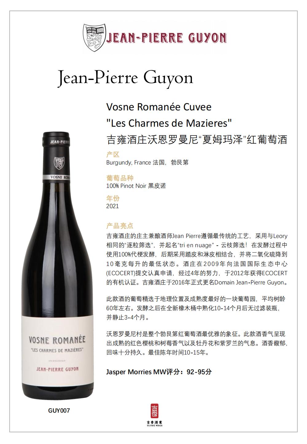 吉雍酒庄沃恩罗曼尼夏姆玛泽红葡萄酒 2021 Vosne Romanee Cuvee "Les Charmes de Mazieres"