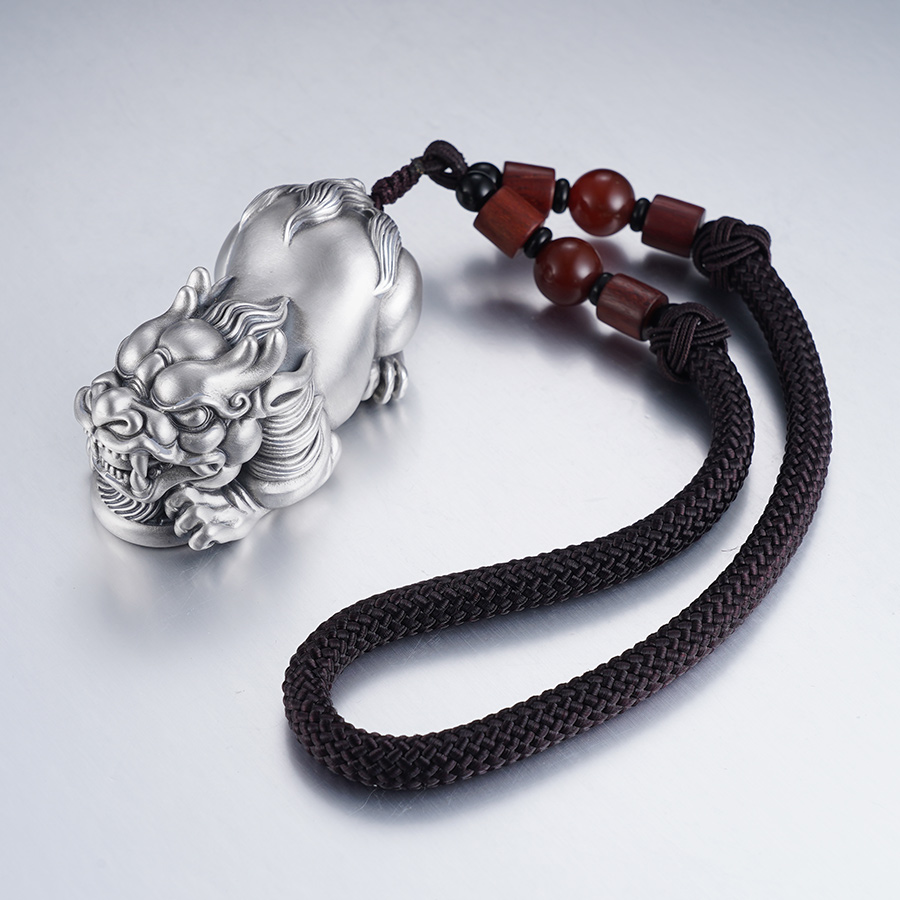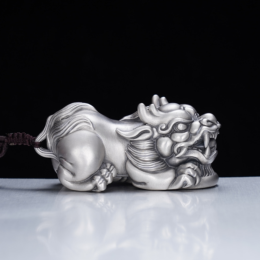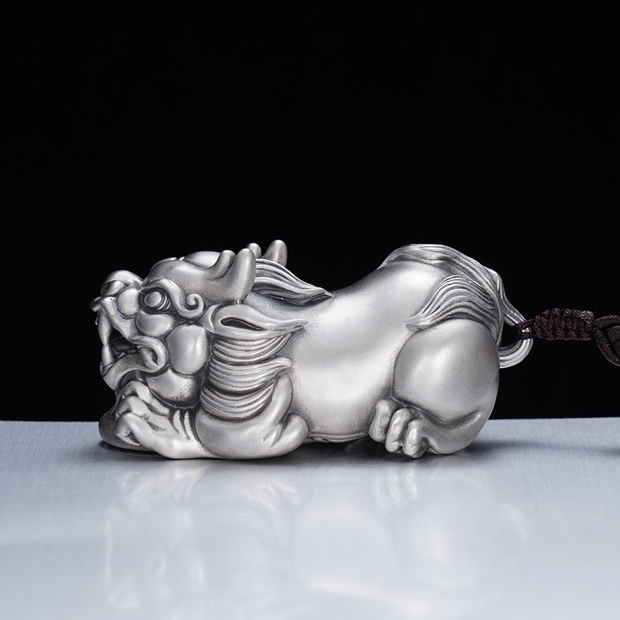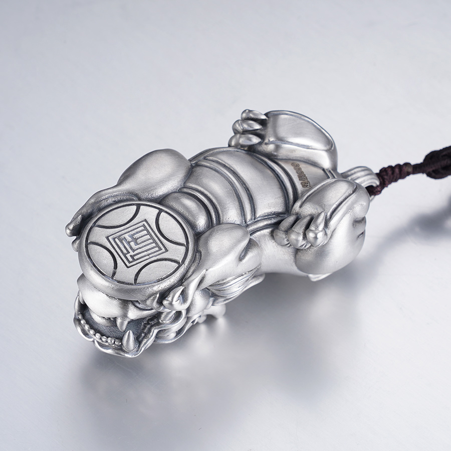 【寓意】:作品灵感源自貔貅,足银材质,錾刻工艺打造。貔貅匍匐于铜钱之上,兼具设计感的同时,寓意招财进宝,吉祥守护。
