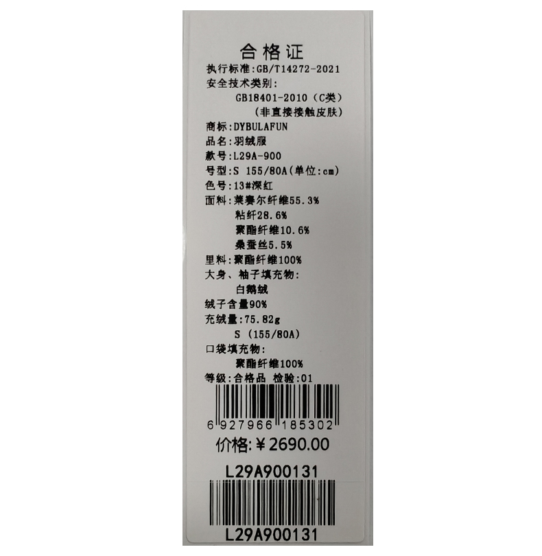 戴布拉芬羽绒服L29A900