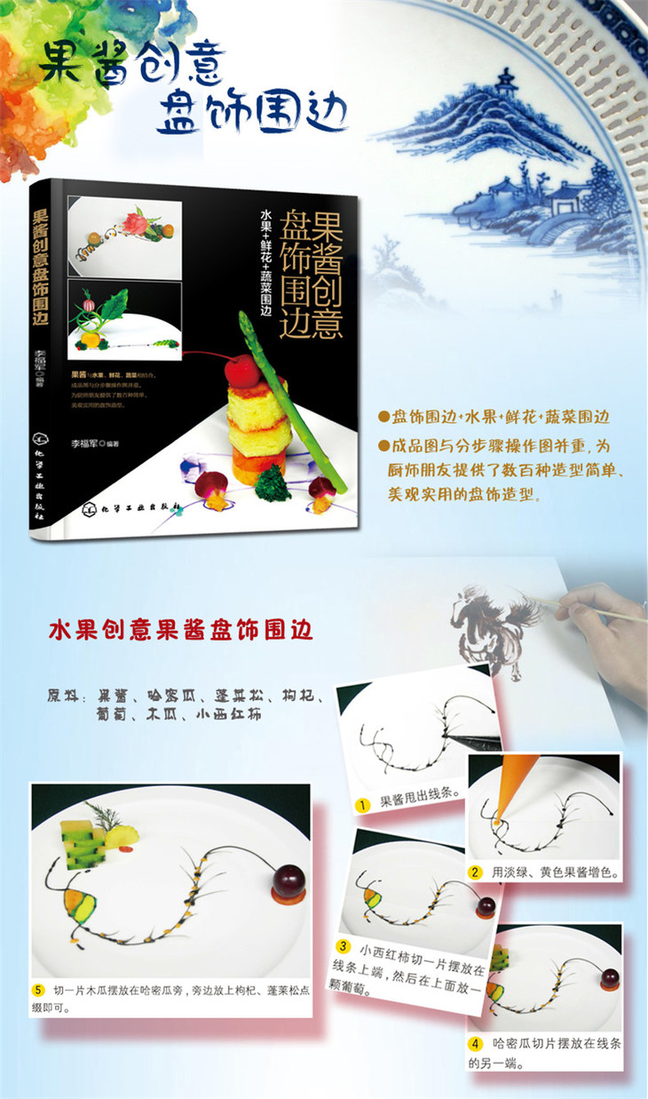 《果酱创意盘饰围边》,将果酱与水果、鲜花、蔬菜相结合,成品图与分步骤操作图并重,为厨师朋友提供了数百种造型简单、美观实用的盘饰造型。