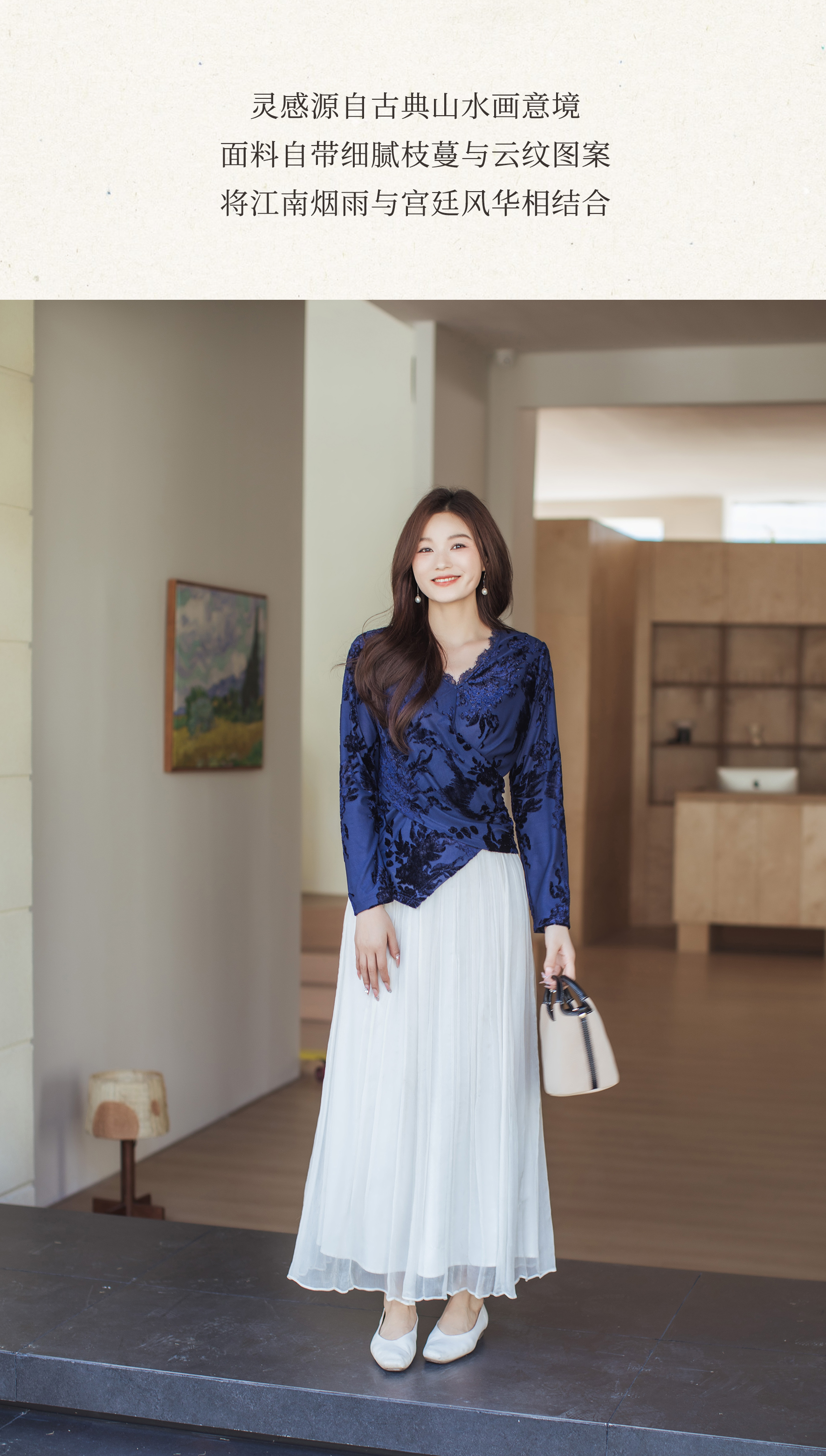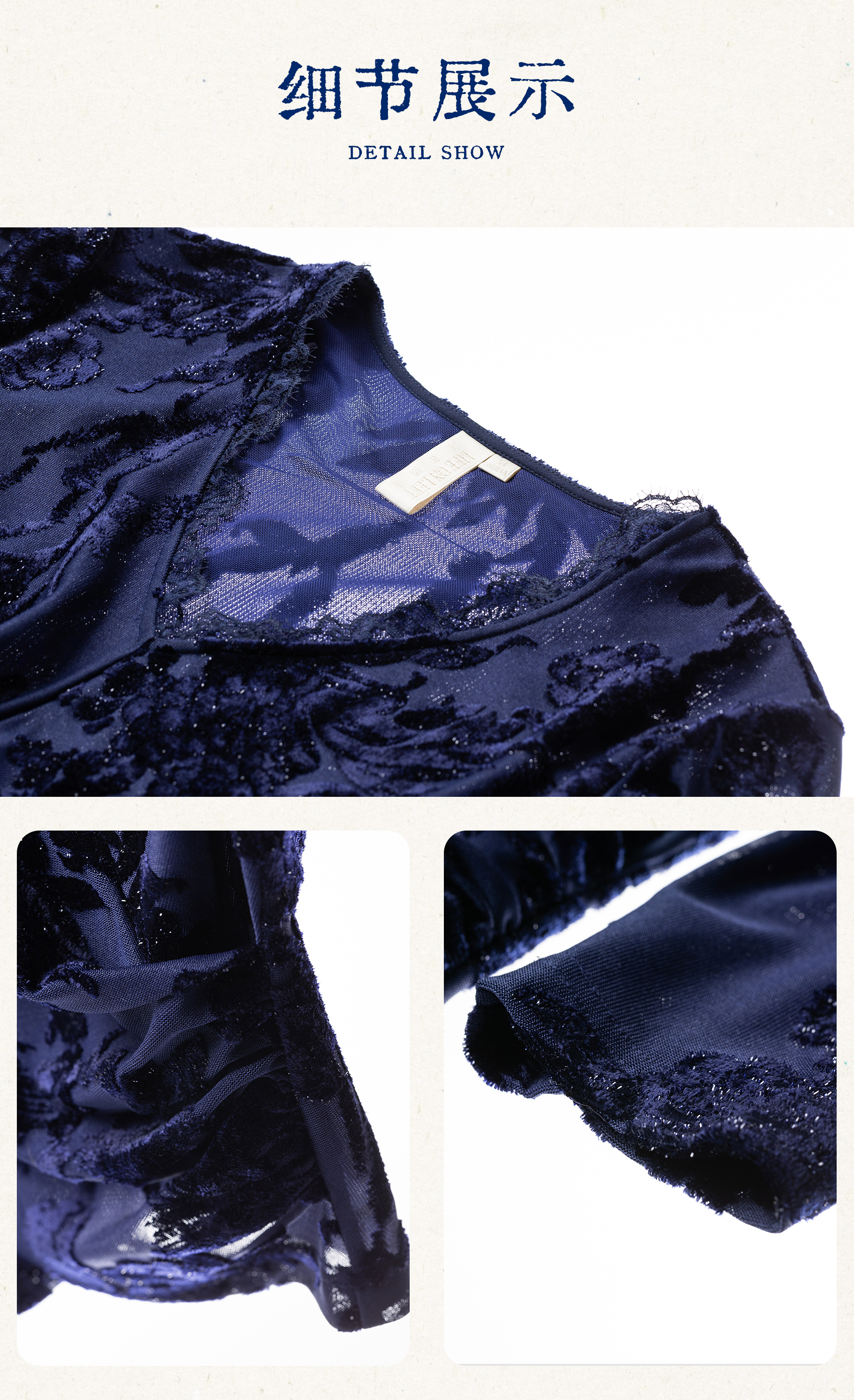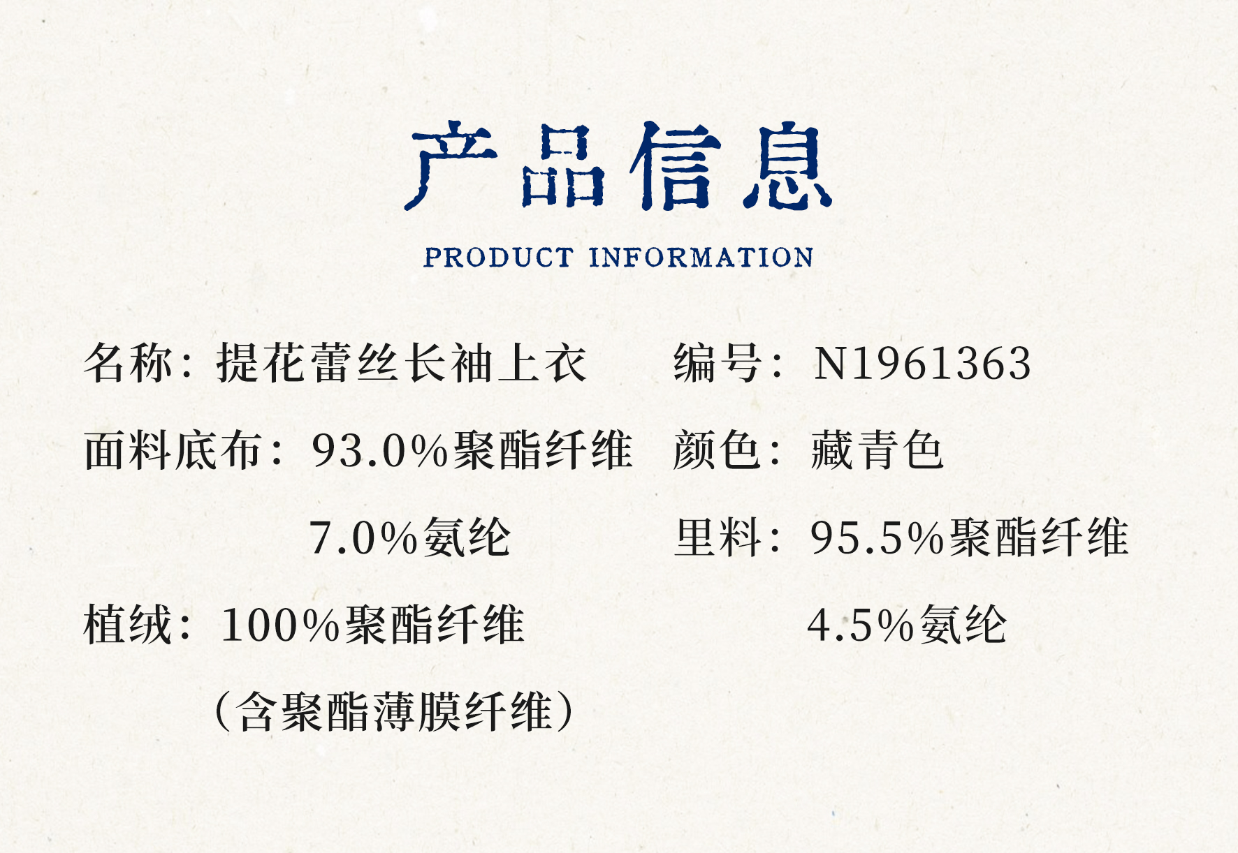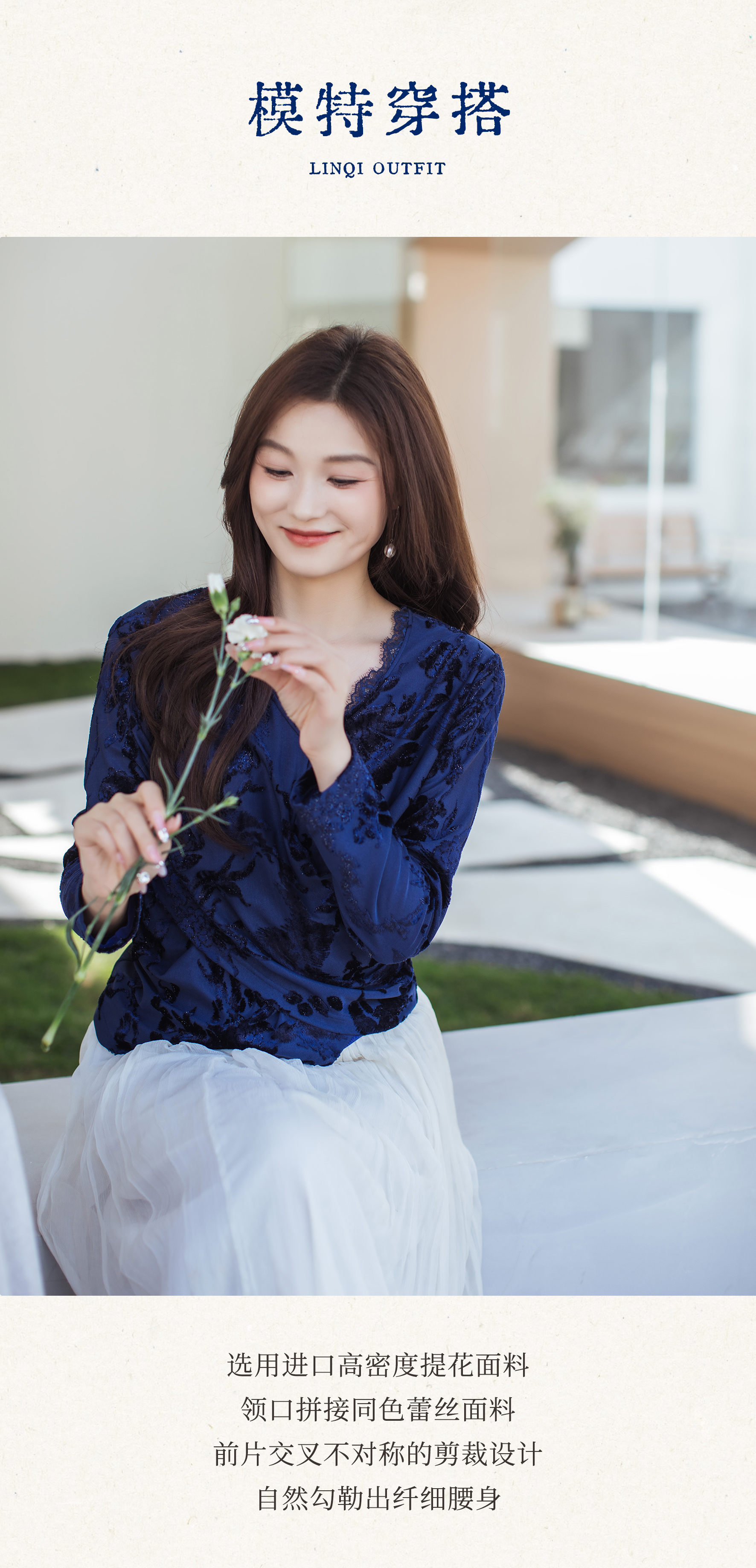 【林栖设计小店】【林栖推荐】2026春季新品藏蓝色提花蕾丝长袖复古上衣N1961363