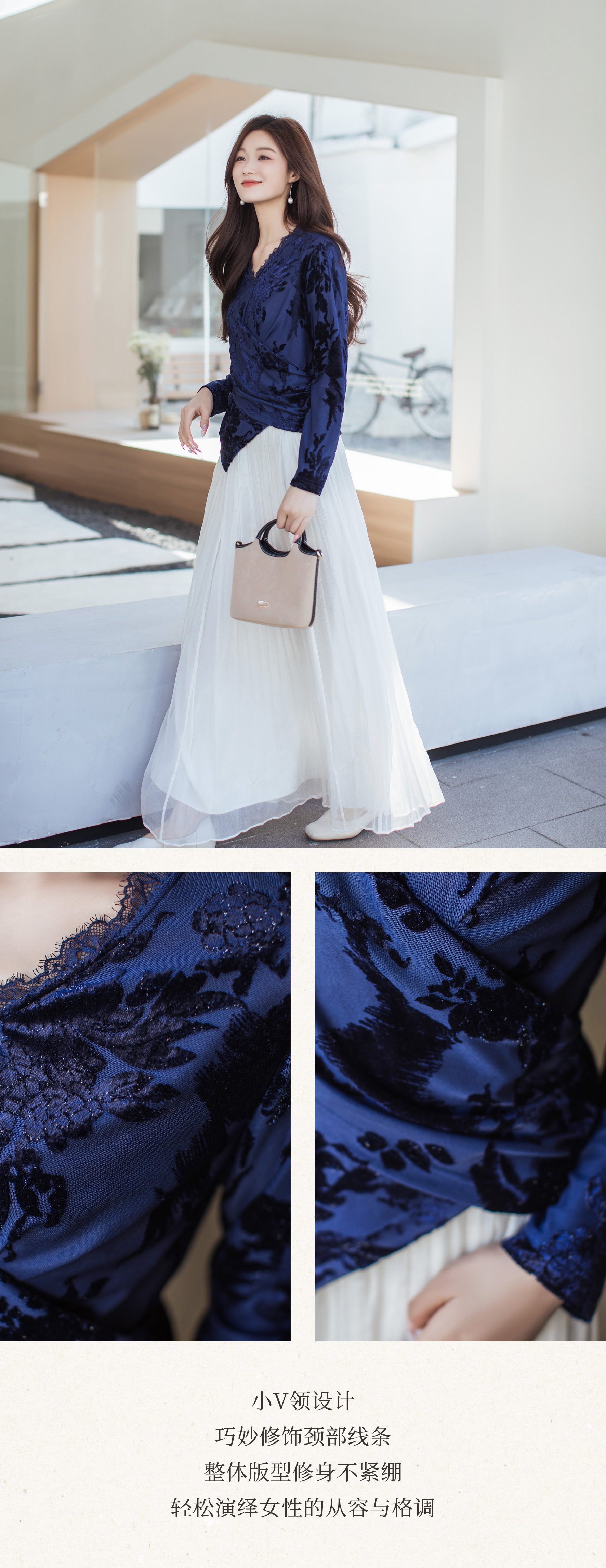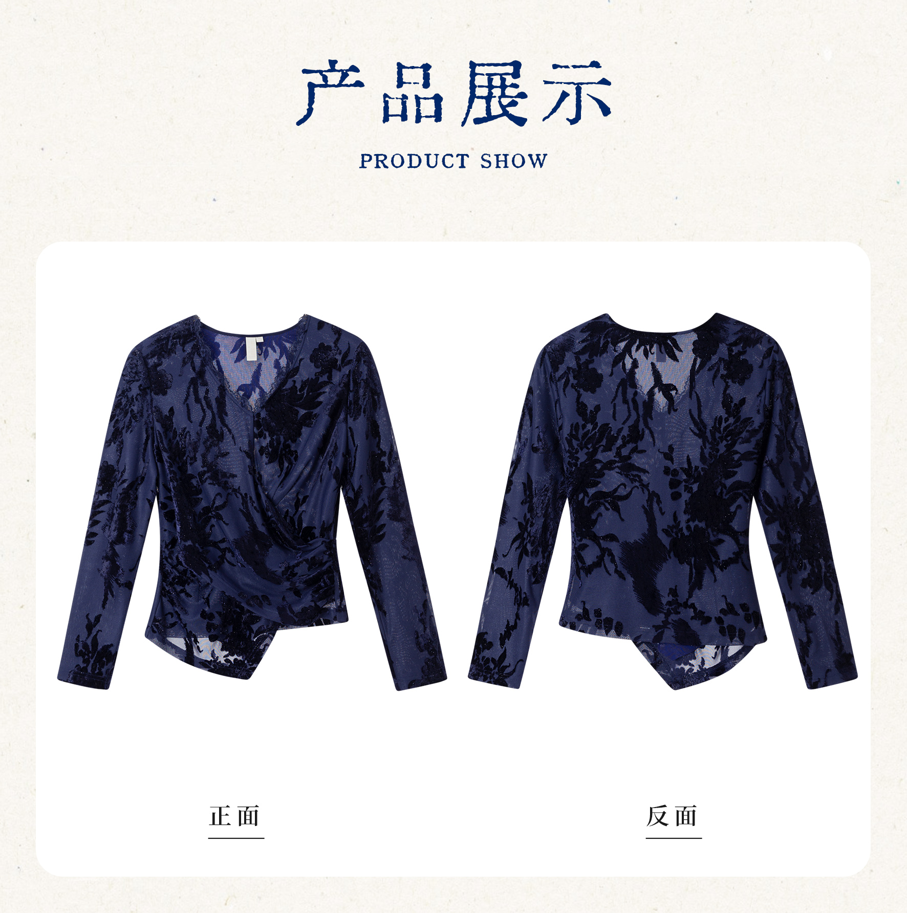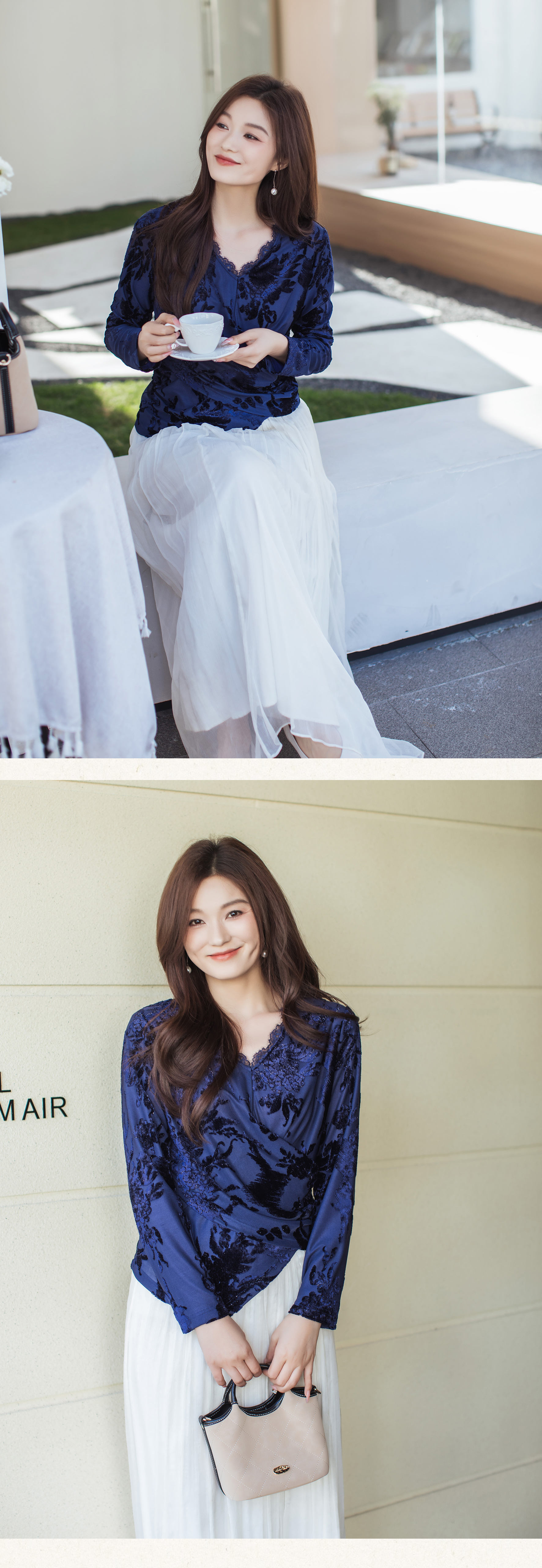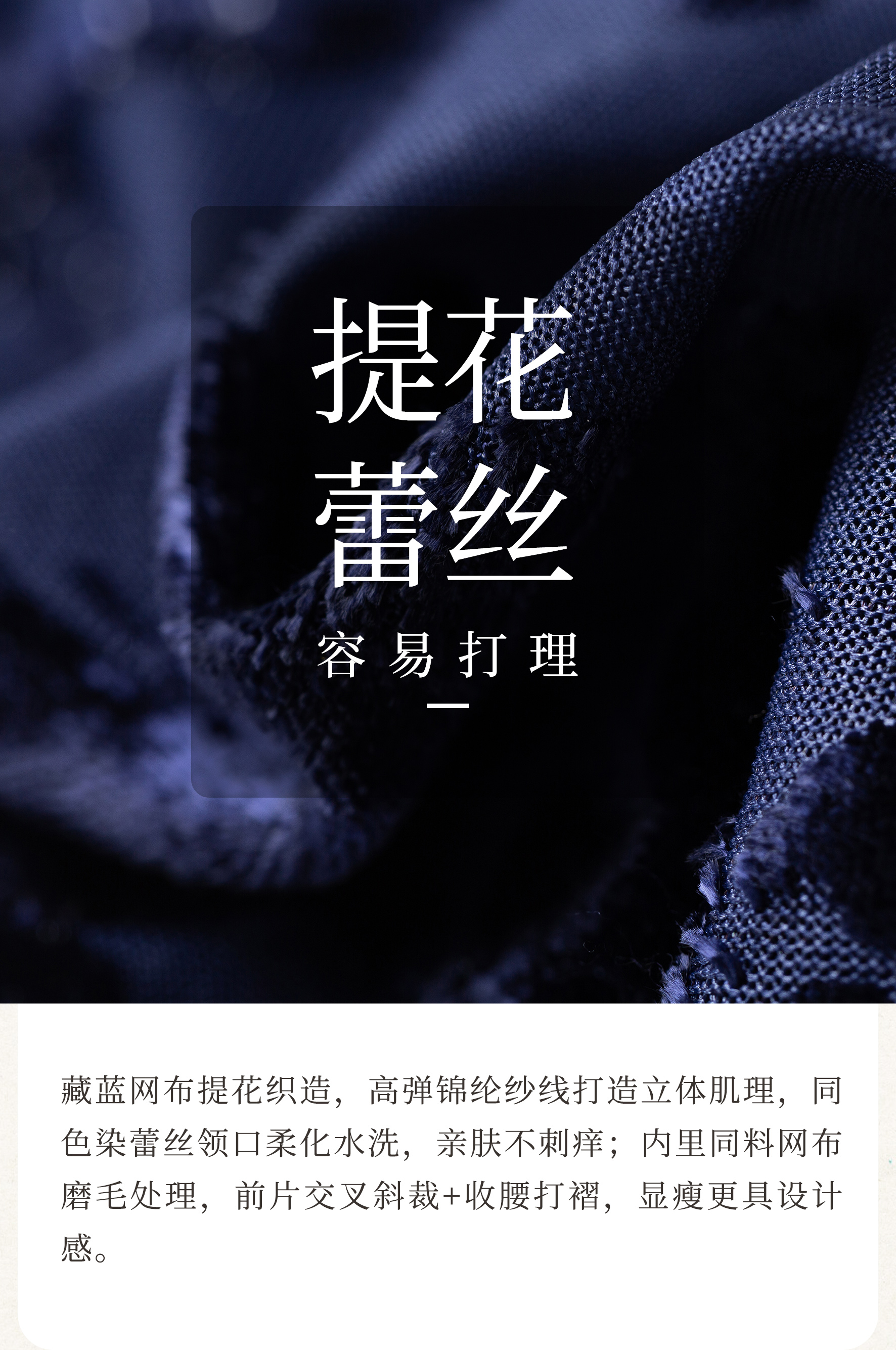 【林栖设计小店】【林栖推荐】2026春季新品藏蓝色提花蕾丝长袖复古上衣N1961363