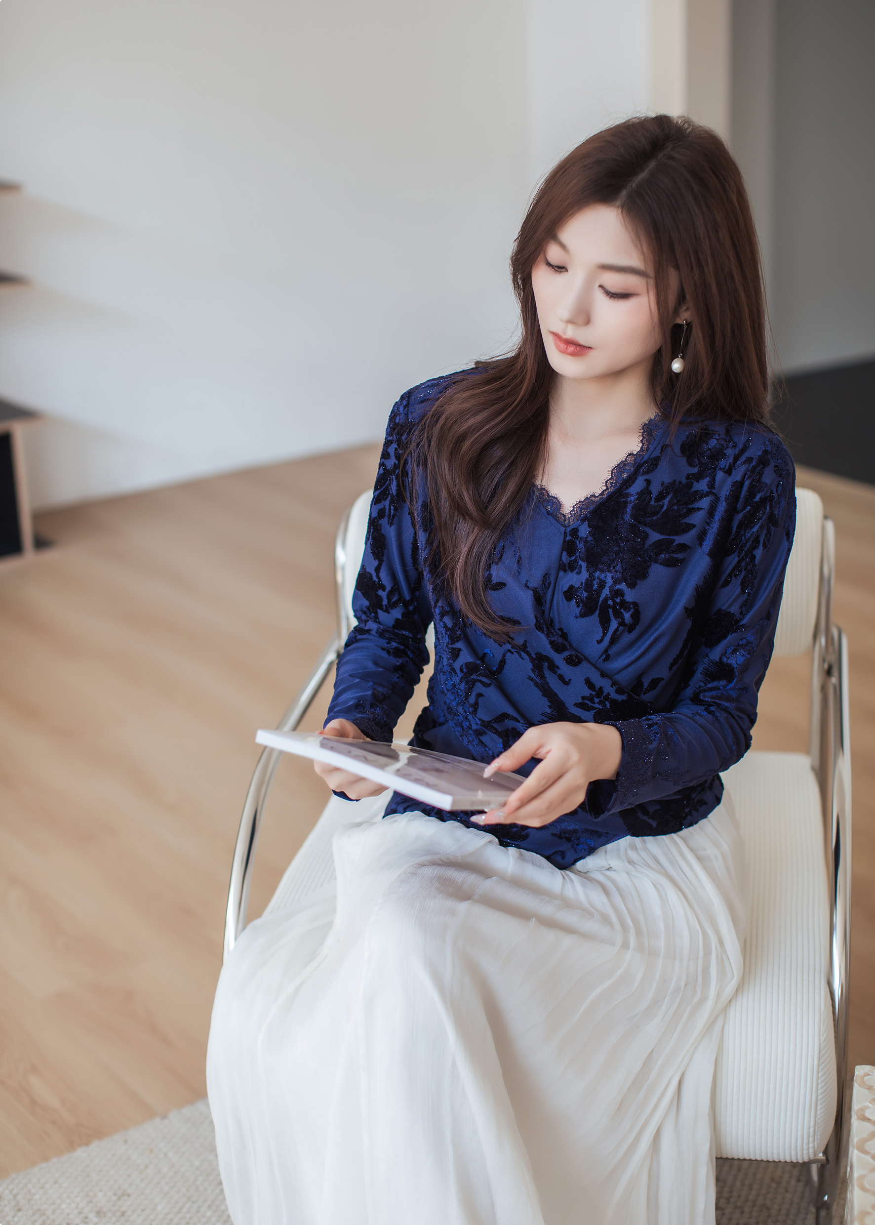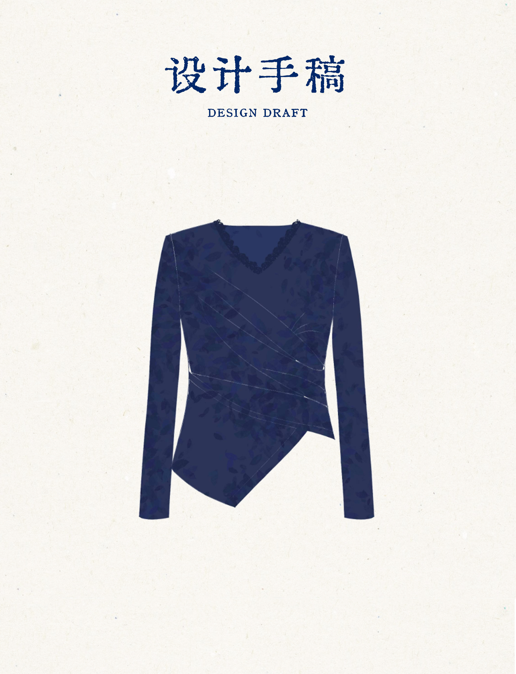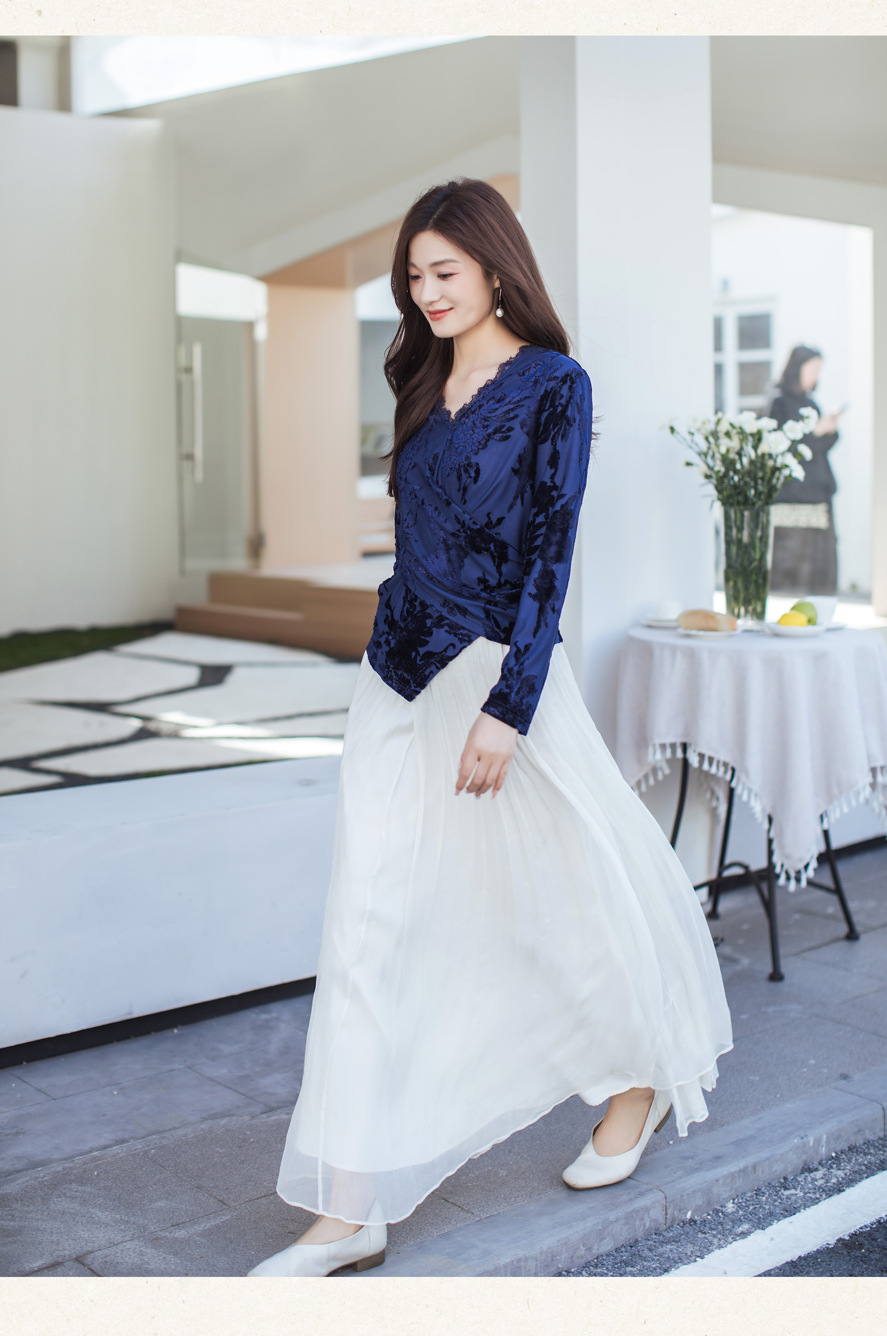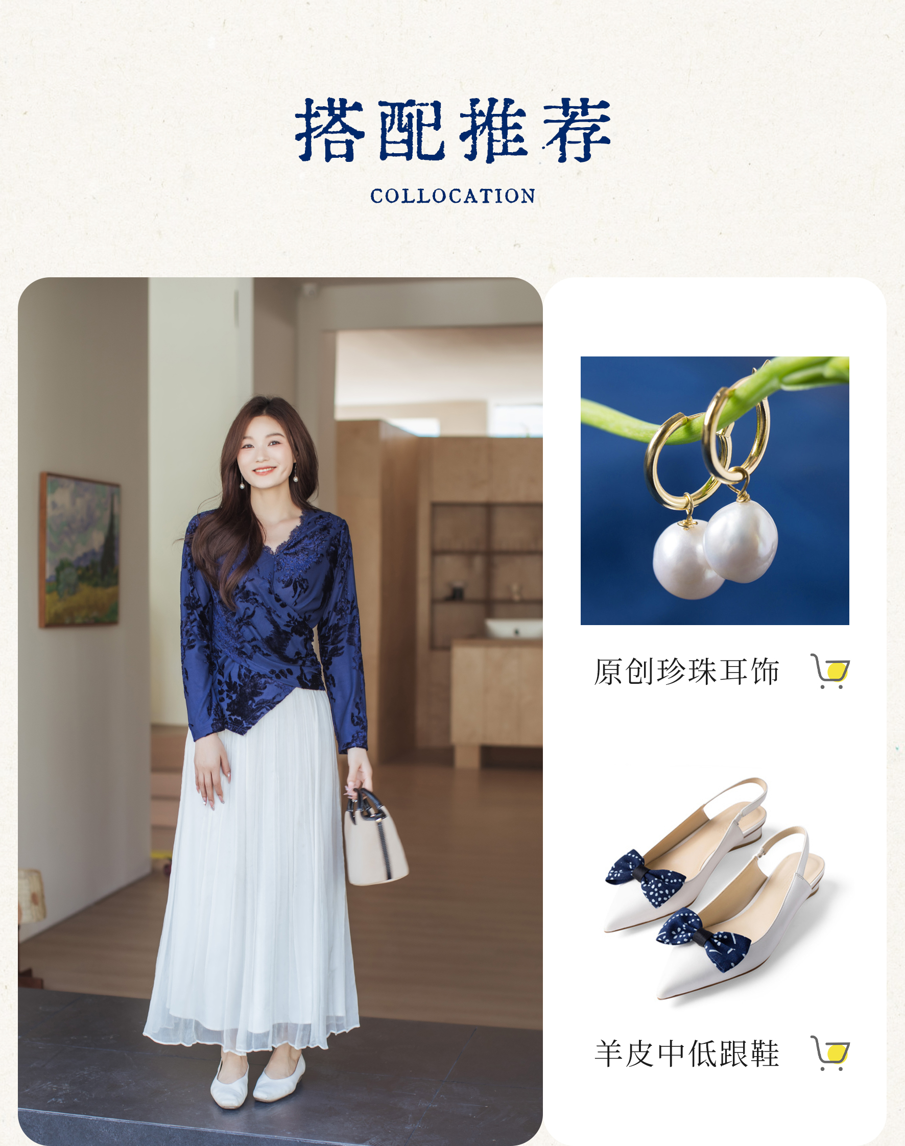 【林栖设计小店】【林栖推荐】2026春季新品藏蓝色提花蕾丝长袖复古上衣N1961363