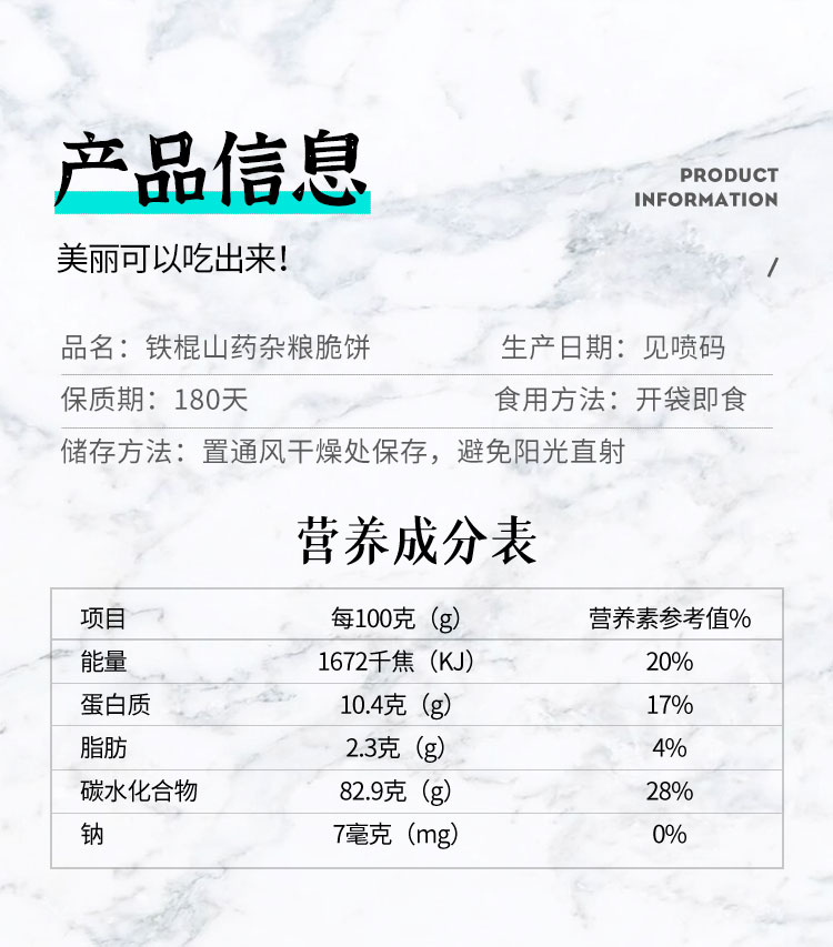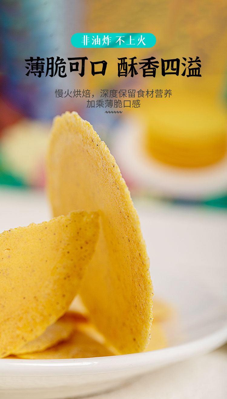 铁棍山药杂粮脆饼采用新鲜铁棍山药原浆特别配比添加玉米粉,小麦粉,莲子,红豆,薏米,红枣等多种谷物杂粮,恒温烘焙而成,非膨化,非油炸,精烘焙,富含膳食纤维,滋补低脂轻食,只为健康生活。