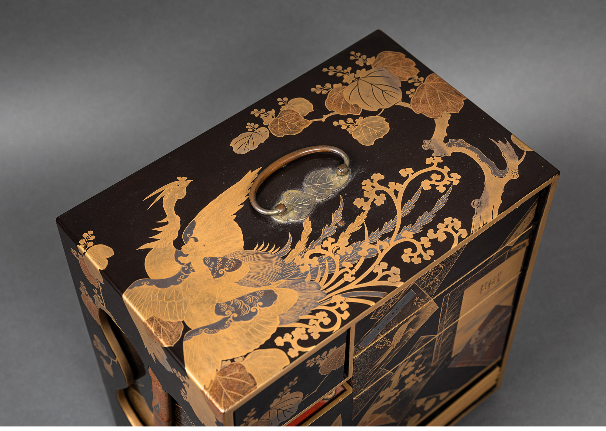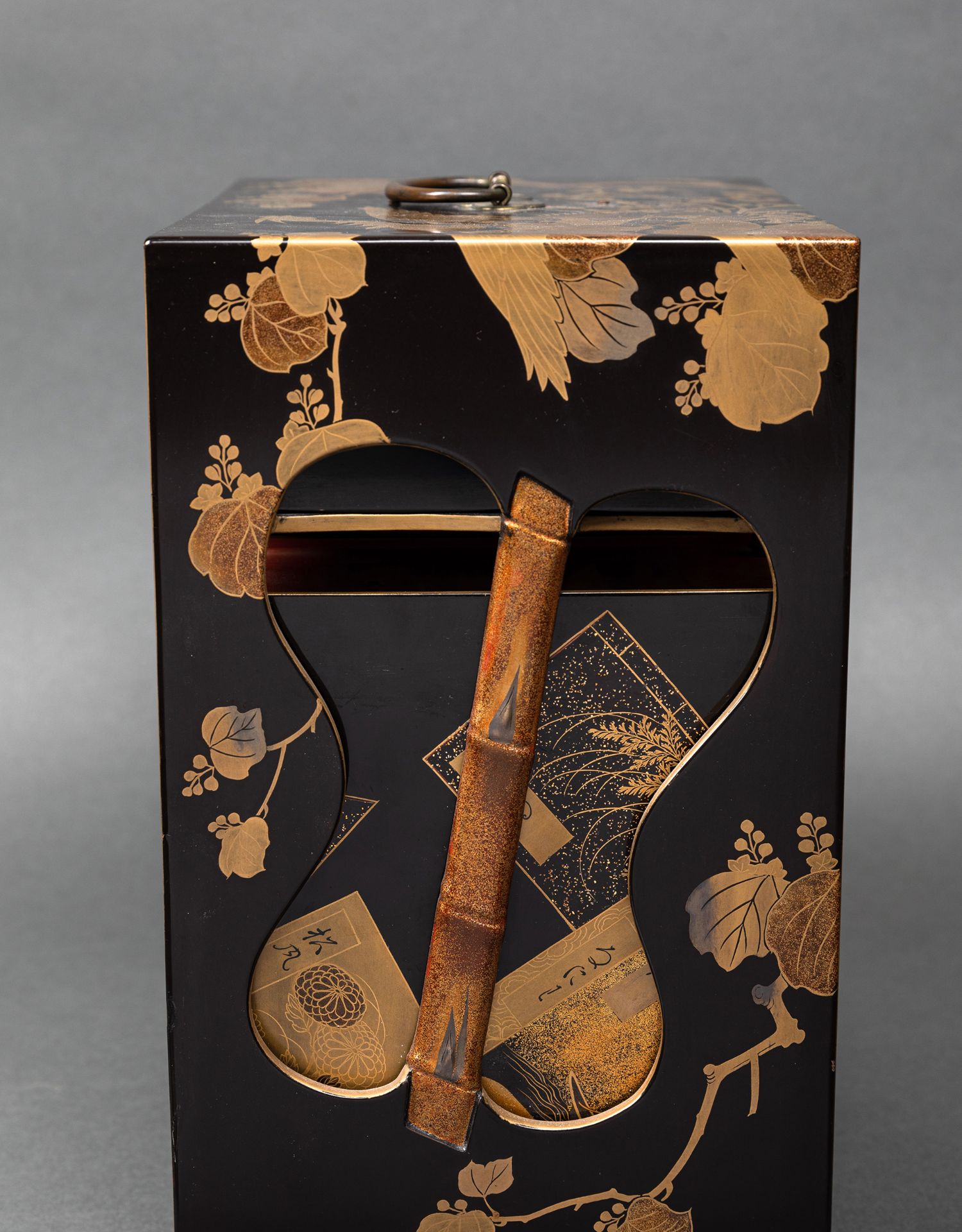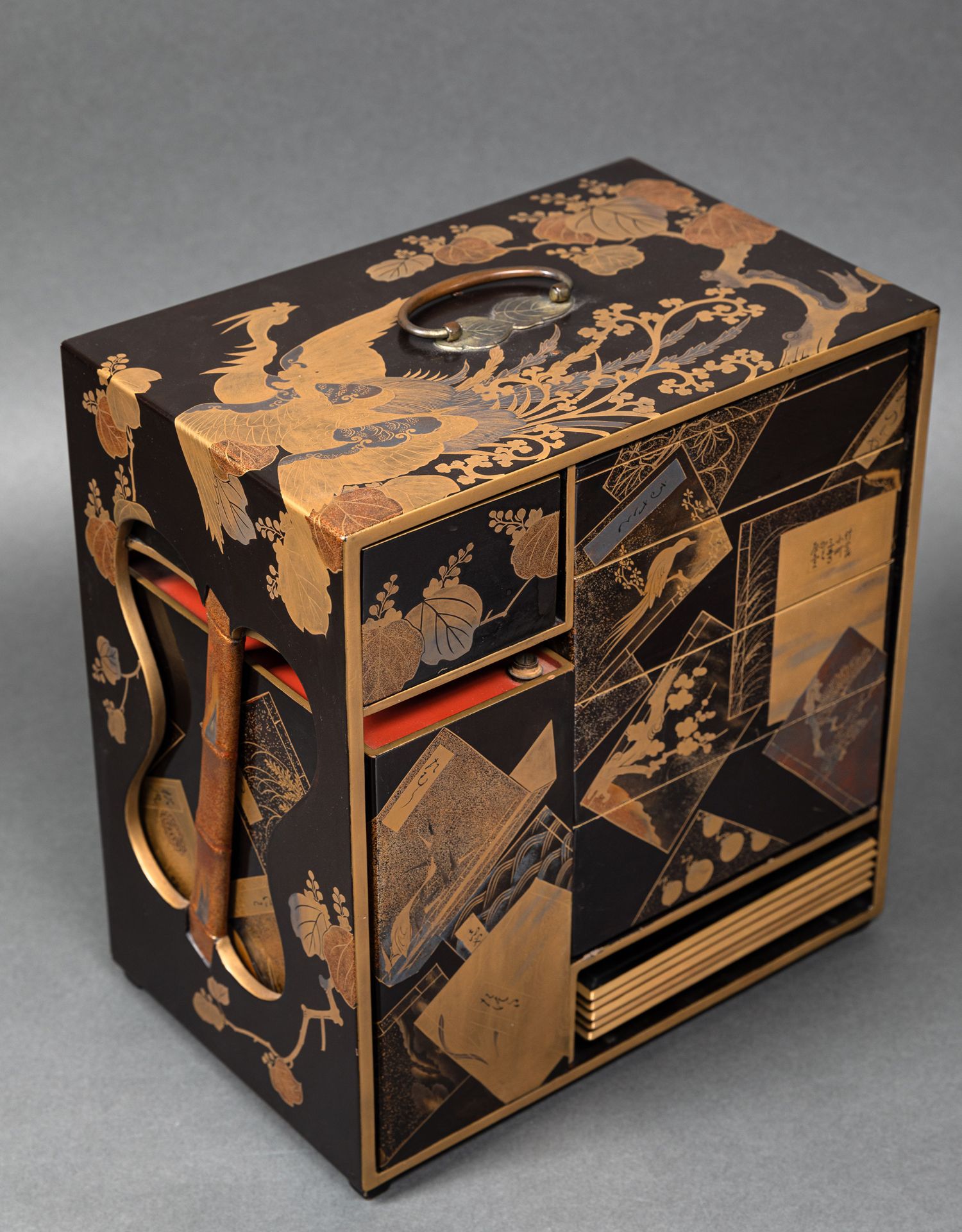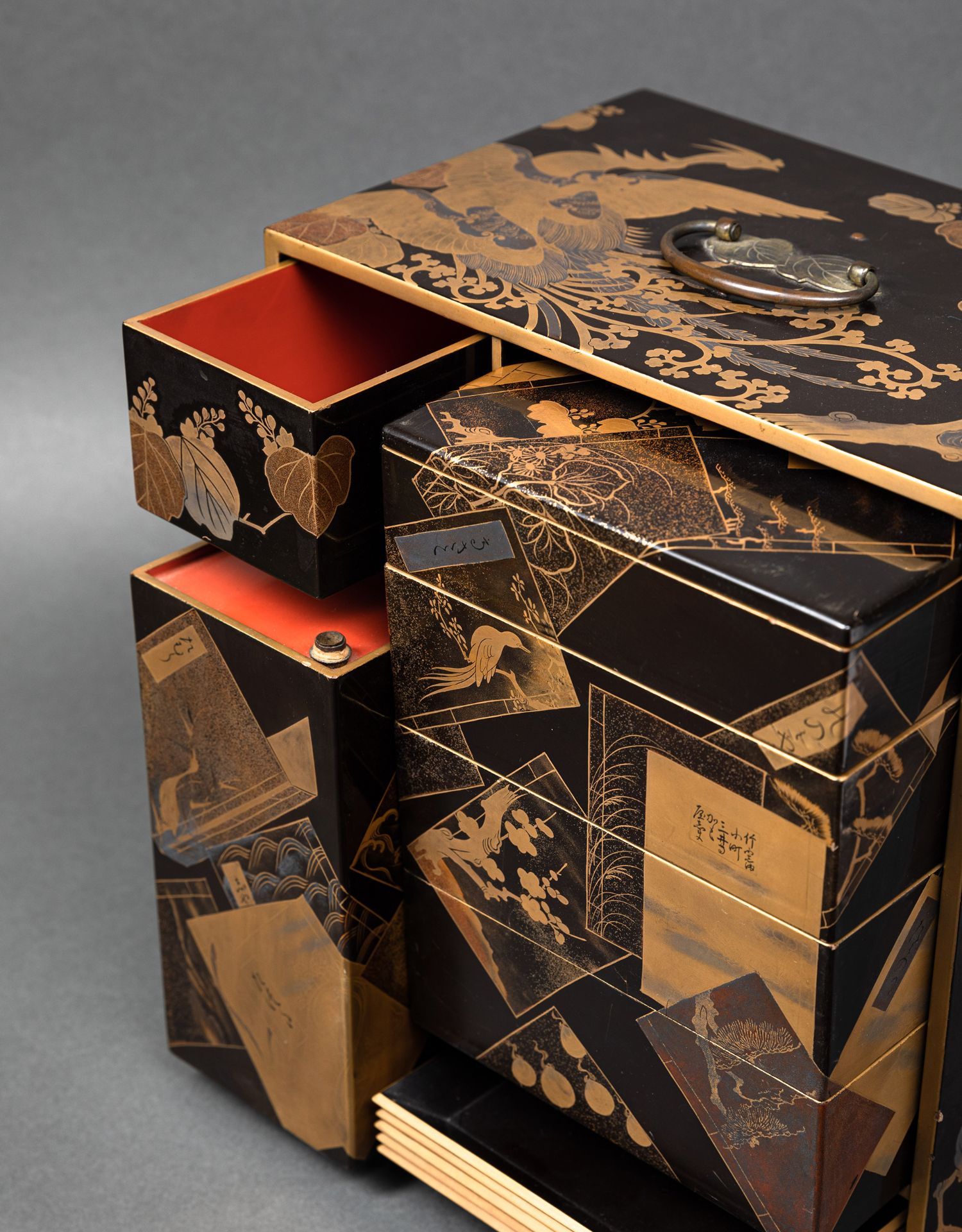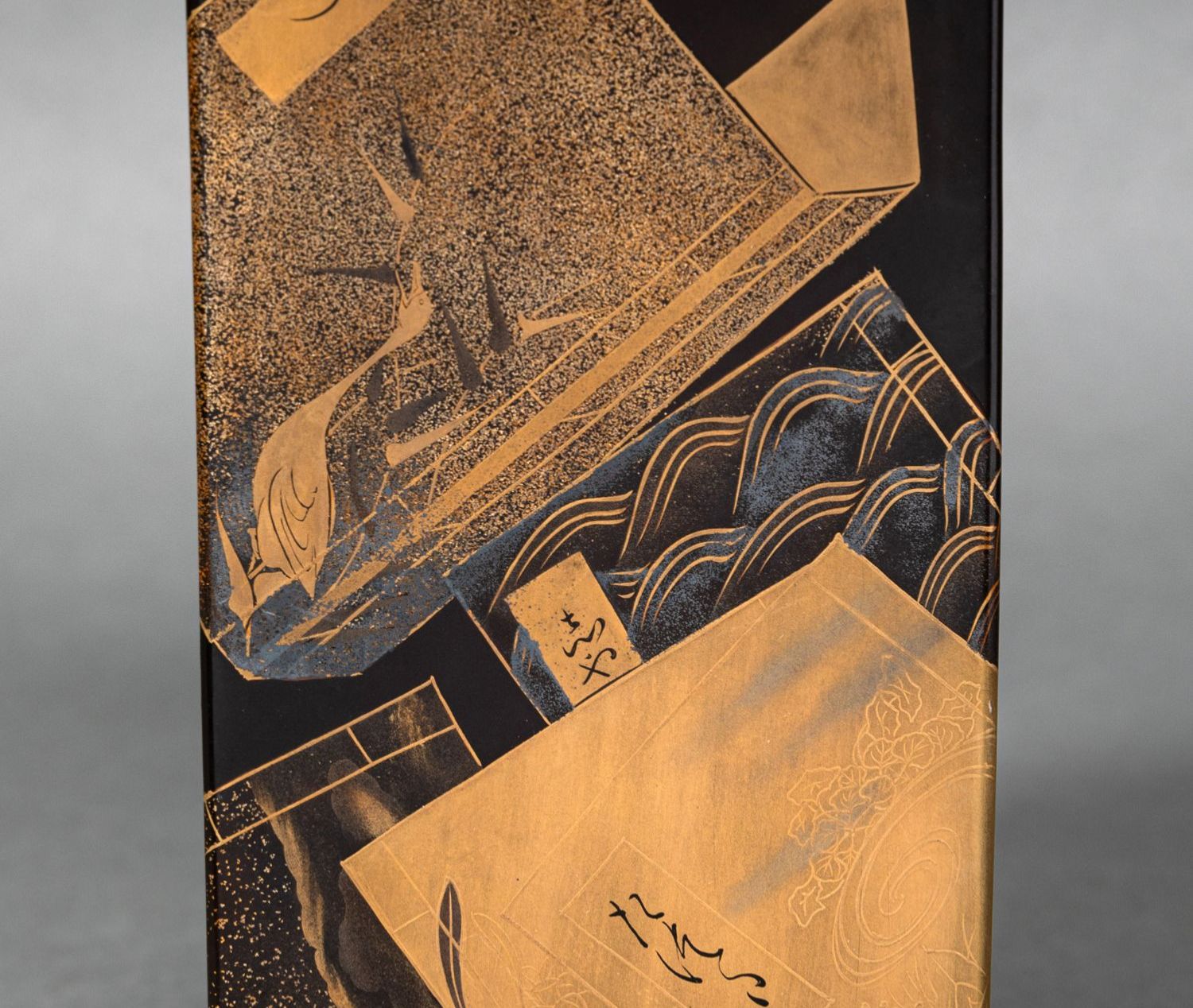 独角鹿西洋古董日本黑地金漆莳绘装饰花鸟书卷主题盒式套件