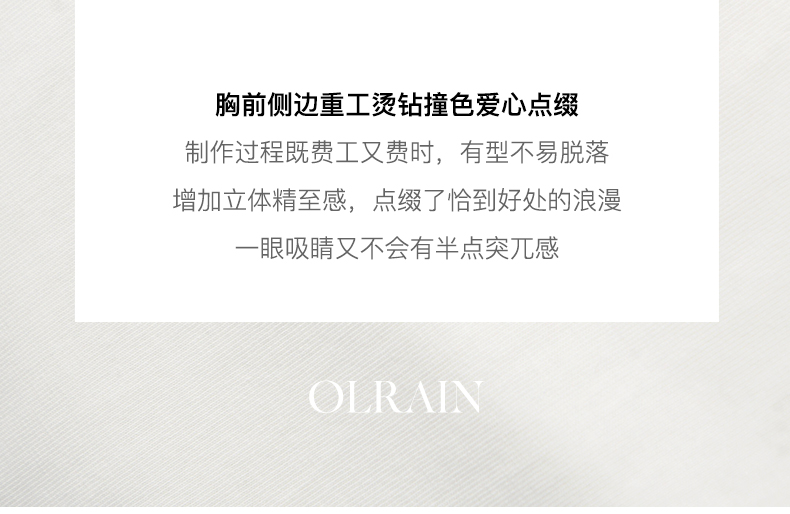 - “精致”是欧芮儿olrain品牌文化的核心,欧芮儿认为,精致的女人,不但要外在动人,更要内在迷人,内外兼修,有魅力、有气质、有内涵,自信而不自傲,优雅而不矫揉,自有万种风情而不轻浮,更不故作矜持。