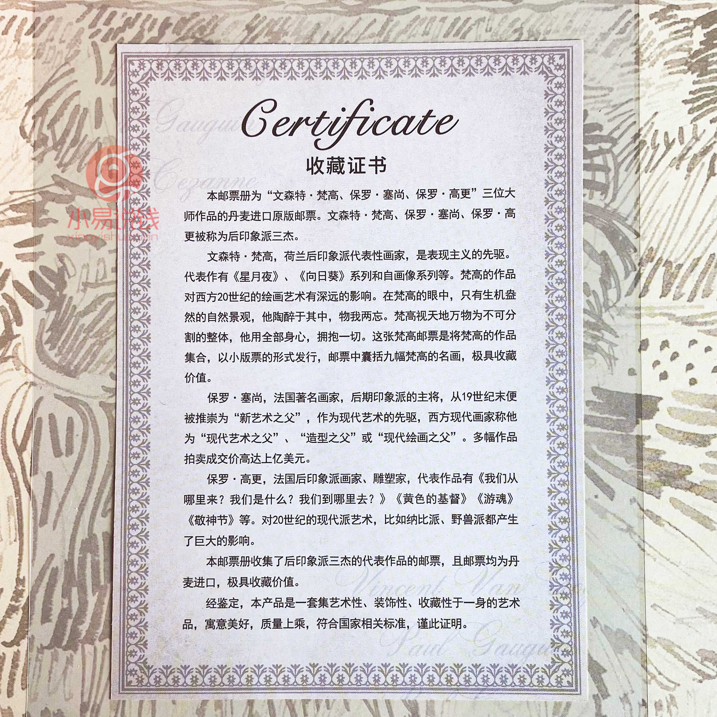 套装还附赠丹麦进口的原版邮票册,包含后印象派三杰:梵高、塞尚、高更三位大师的作品精选邮票,寓意美好,收藏价值极高!