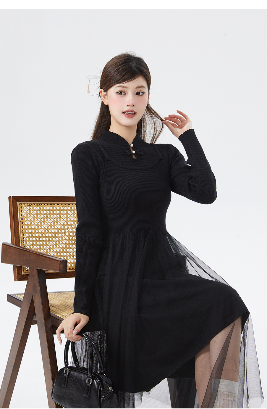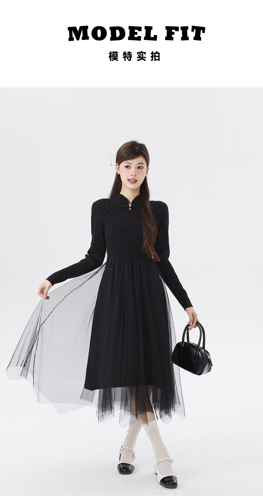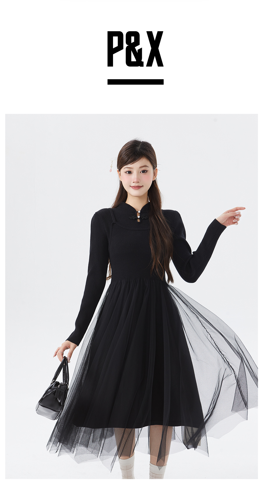 P&X设计师女装冬款中式领打底修身针织连衣长裙 824408188 黑色