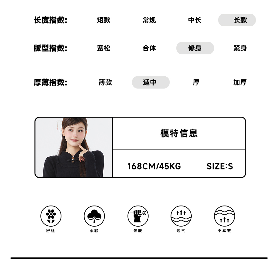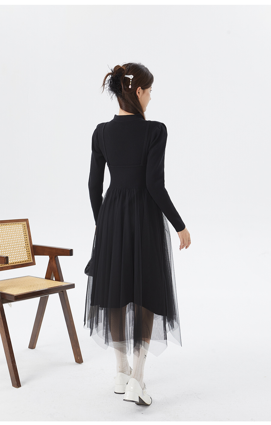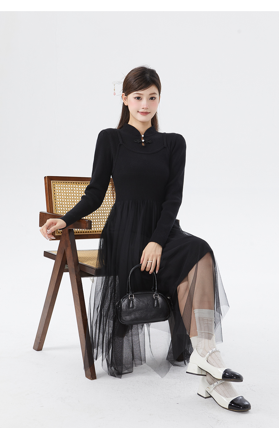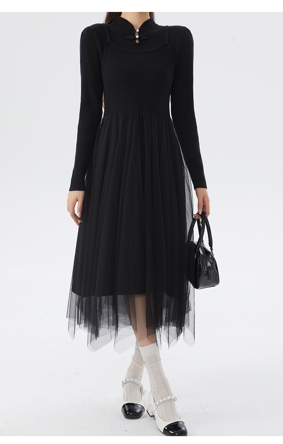 P&X设计师女装冬款中式领打底修身针织连衣长裙 824408188 黑色
