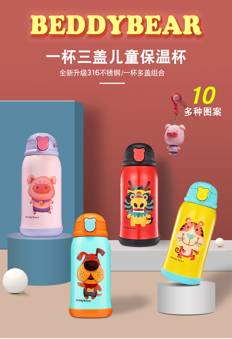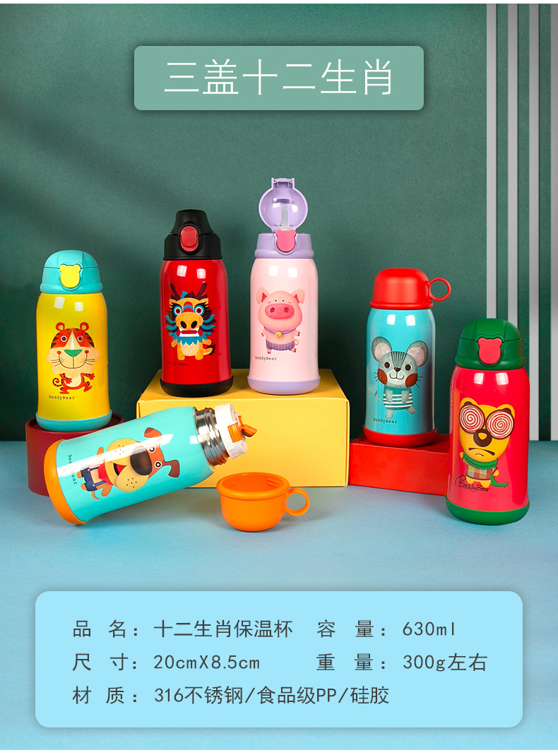 王一博同款韩国Beddybear/杯具熊 十二生肖系列儿童三盖保温水杯礼盒款630ml