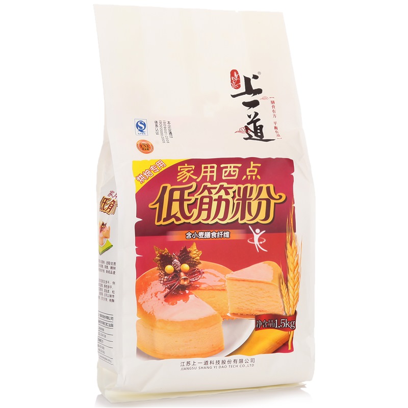 【食品名称】上一道家用西点低筋粉 【生产许可证编号】QS3211 0104 0188 【产品标准号】Q/JSSYD 0003S 【配料】低筋小麦粉、小麦膳食纤维。其中小麦膳食纤维为3%【净含量】1.5kg 【贮存条件】放于阴凉、干燥、通风处 【保质期】12个月 【产地】江苏省