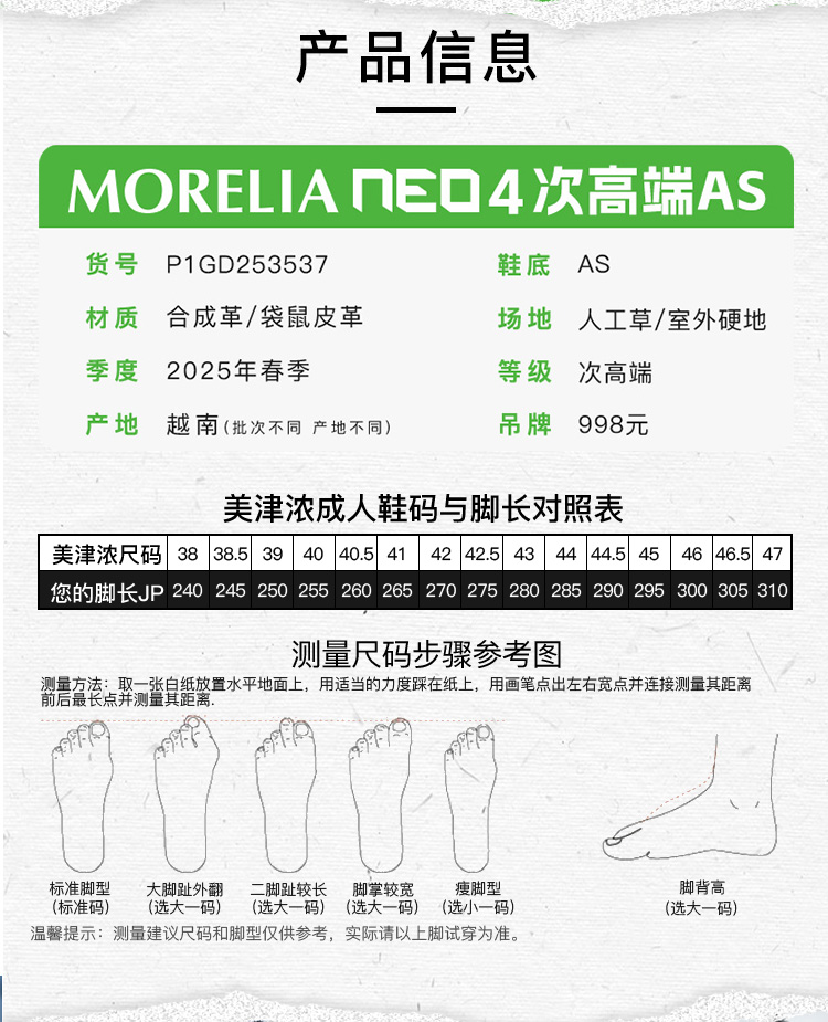 小李子美津浓莫雷拉MORELIA NEO4次高端AS碎钉训练足球鞋成人男