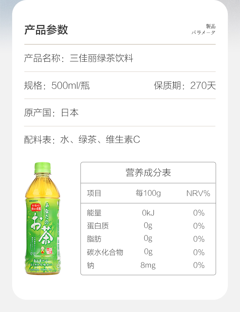 三佳丽 绿茶味饮料 500ml)(014399)