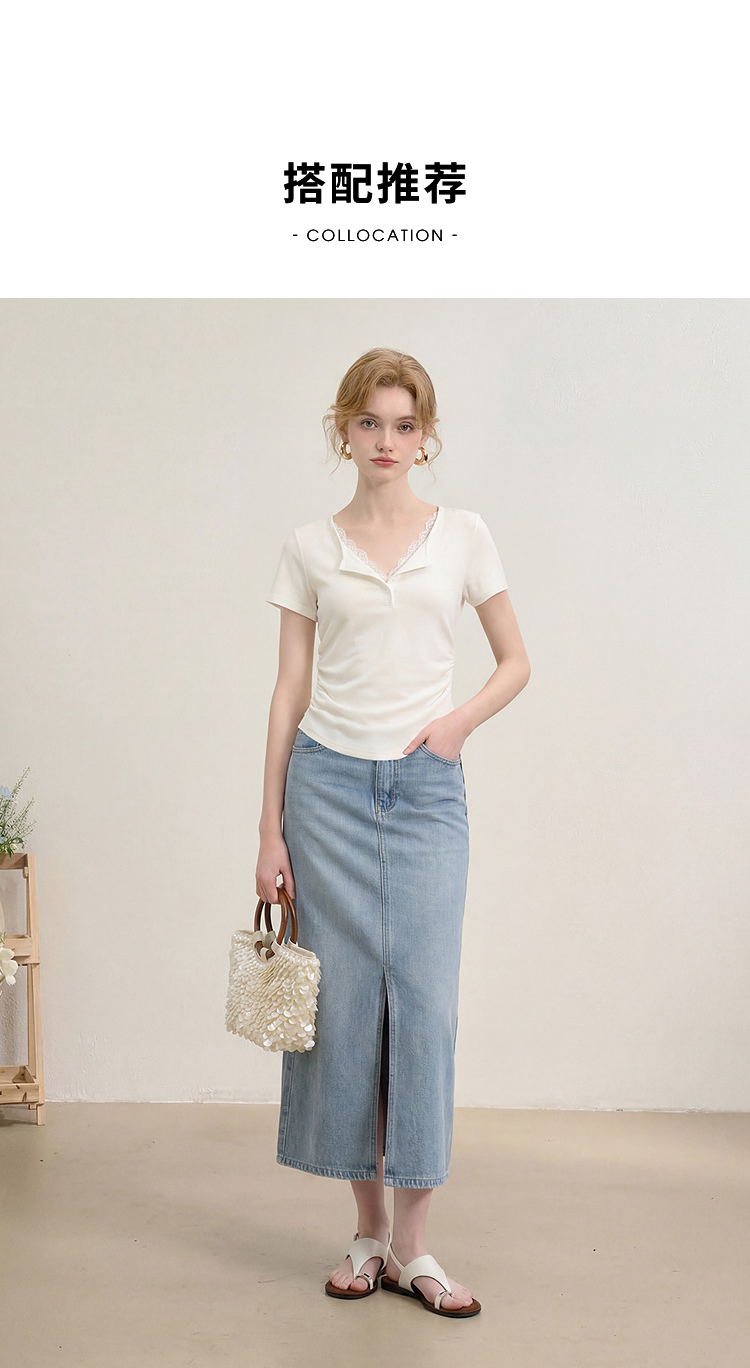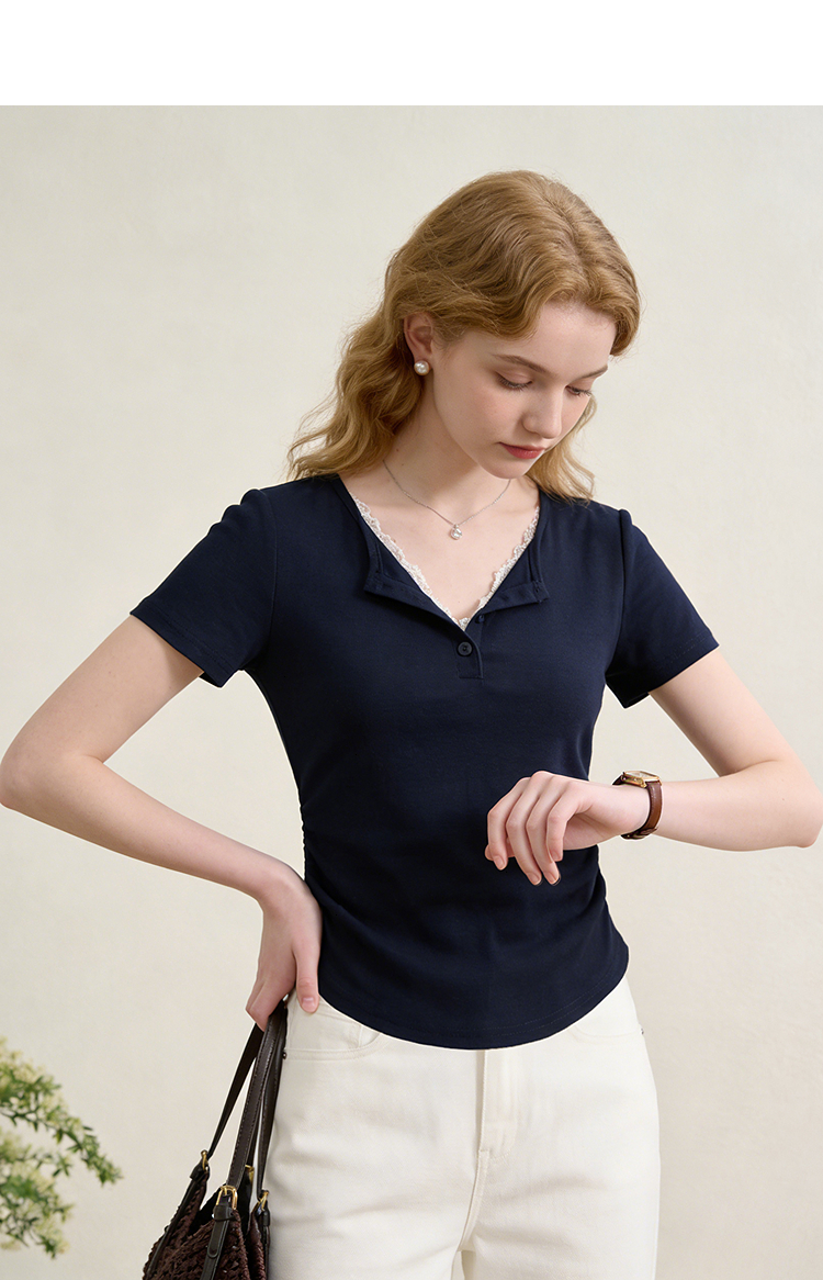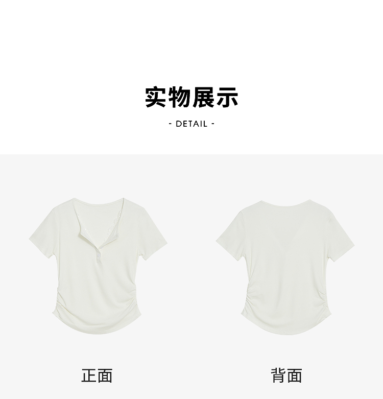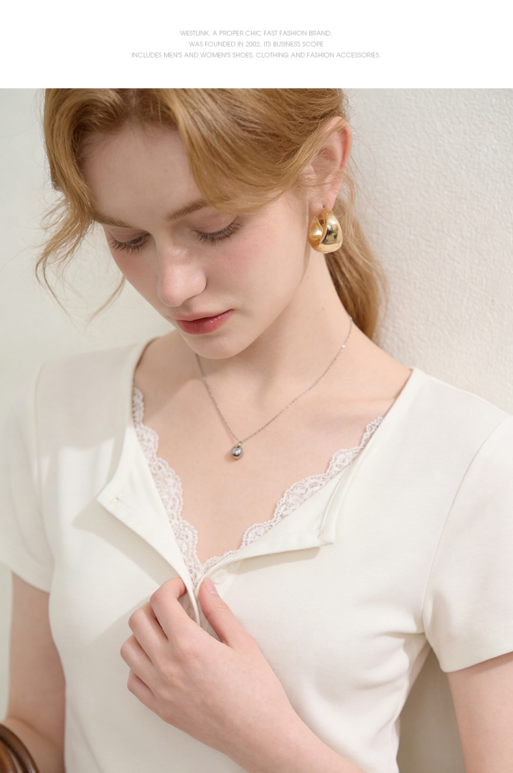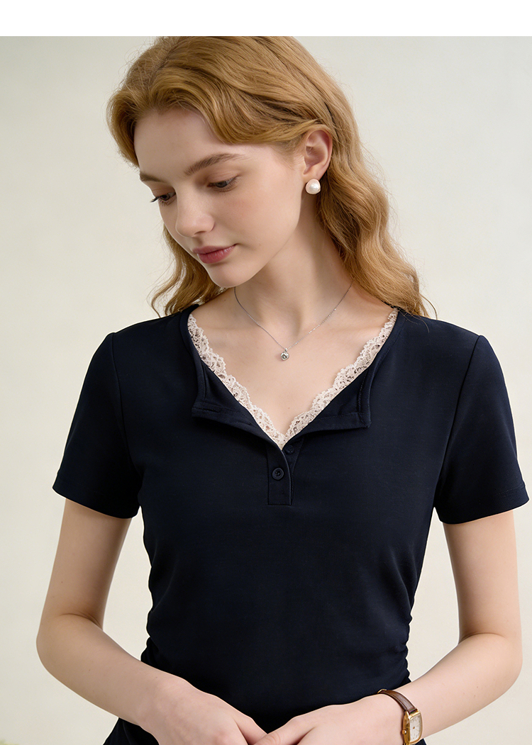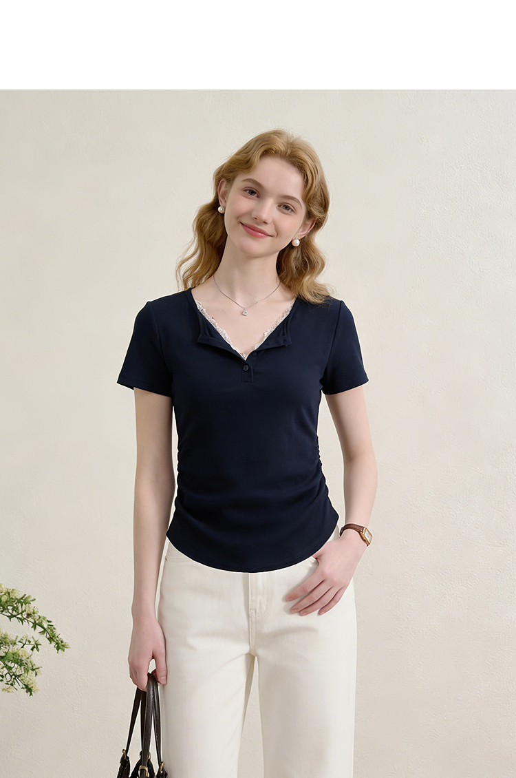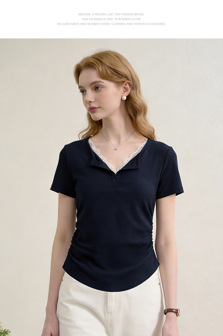 西遇蕾丝拼接2026春夏新款假两件女纯欲褶皱收腰显瘦上衣短袖T恤H0060190