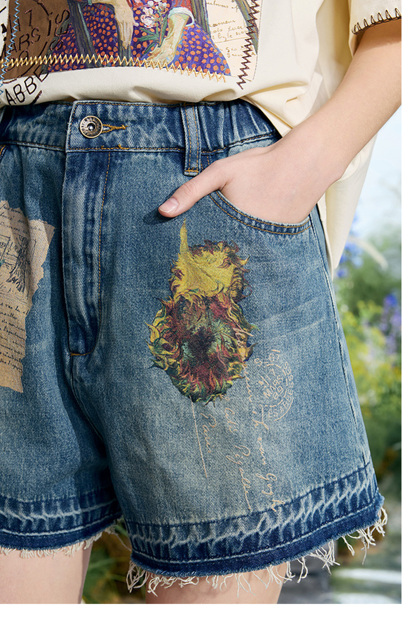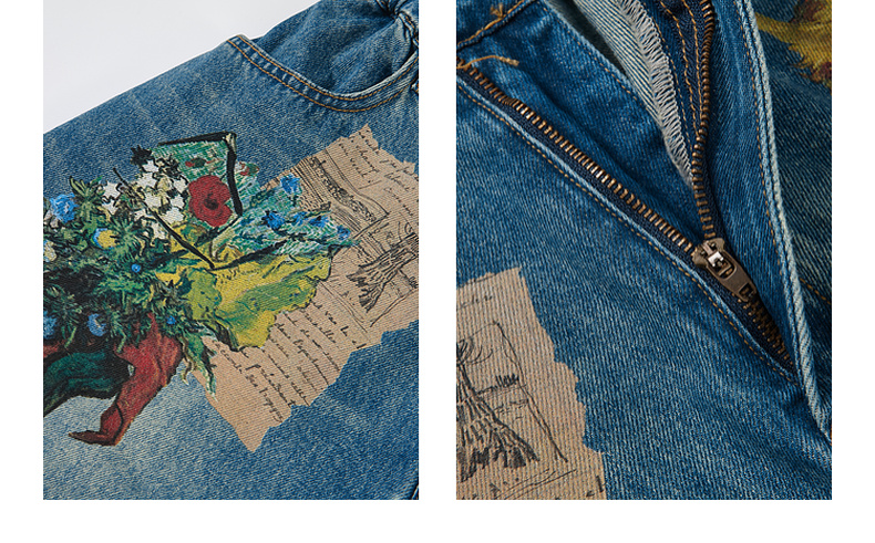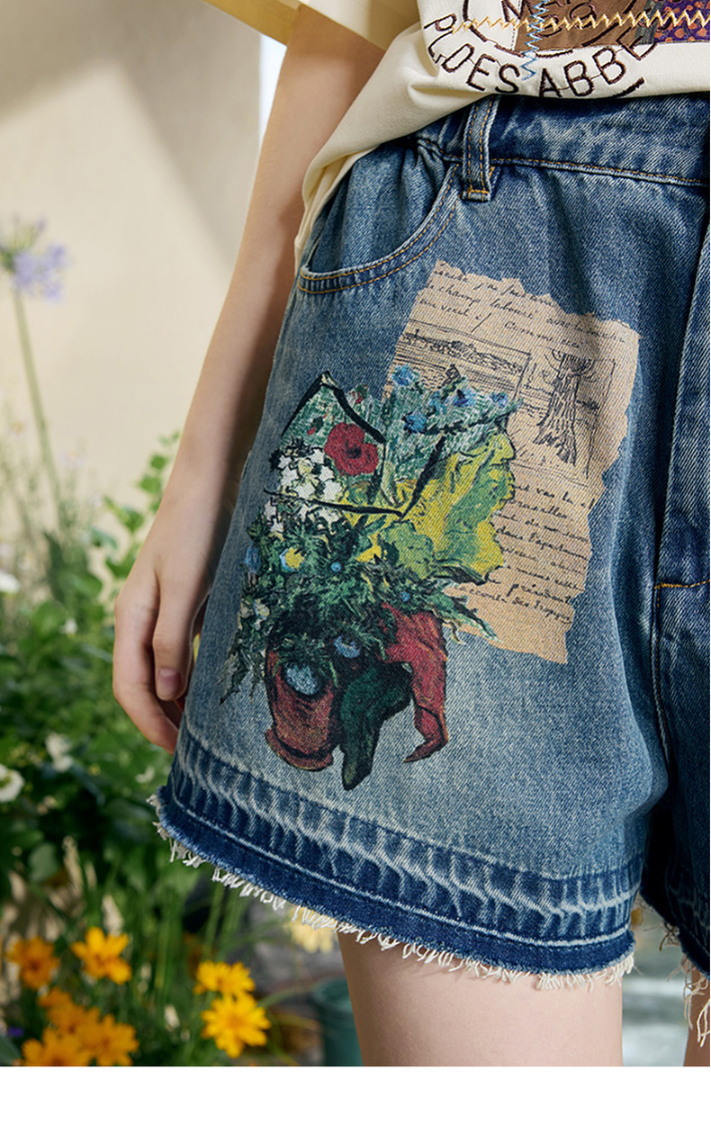 两三事梵高文艺古着玩家2025夏新款做旧印花流苏裤脚口牛仔裤女