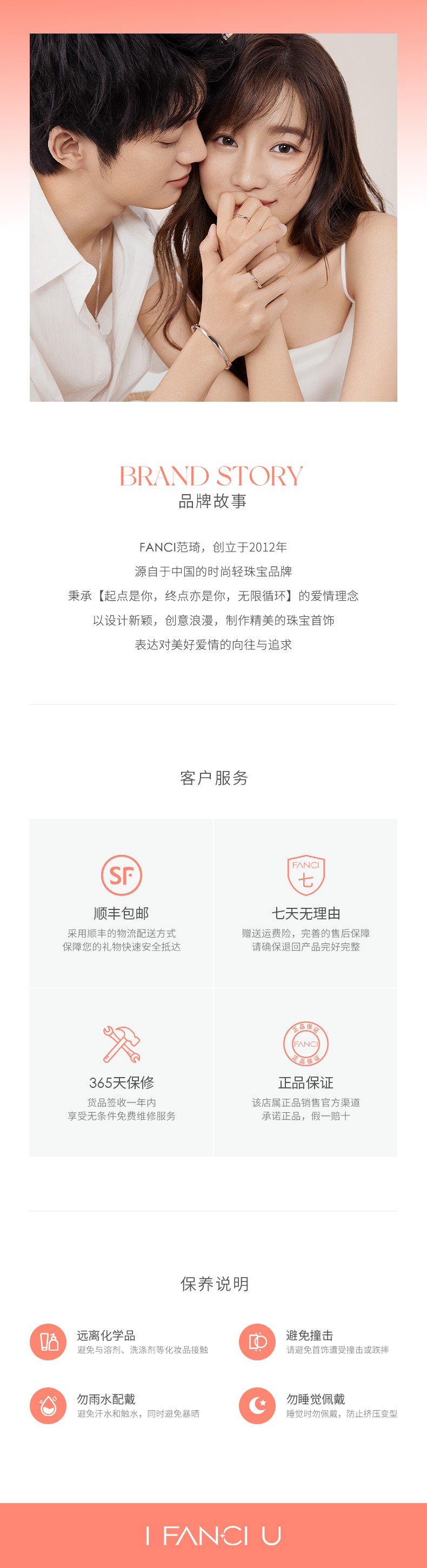 FANCI范琦始于2012年,以珠宝表达内心为初衷,聚焦不同亲密关系情感表达,联结无形情感,以情感符号「I FANCI U」传情达意,诠释“恋爱戴范琦,起点是你,终点亦是你”始终如一的恋爱价值观。