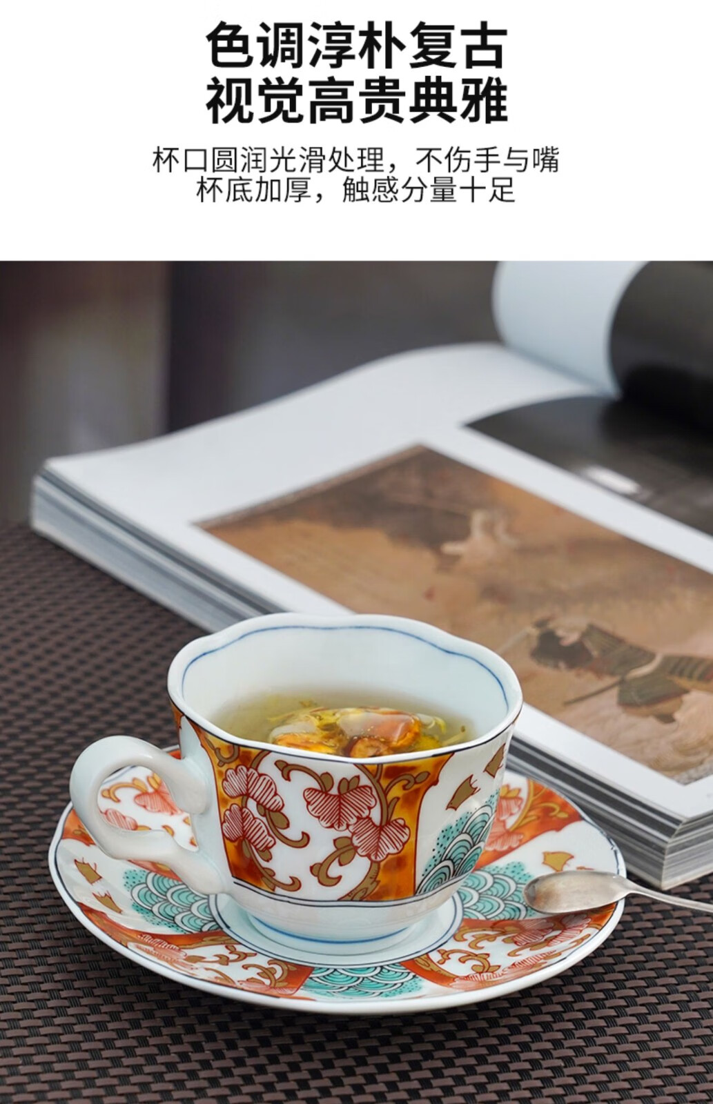 美浓烧(Mino Yaki)日本进口宫廷风古伊万里陶瓷咖啡杯碟两件套礼盒装高级感 染锦古伊万里杯碟一对
