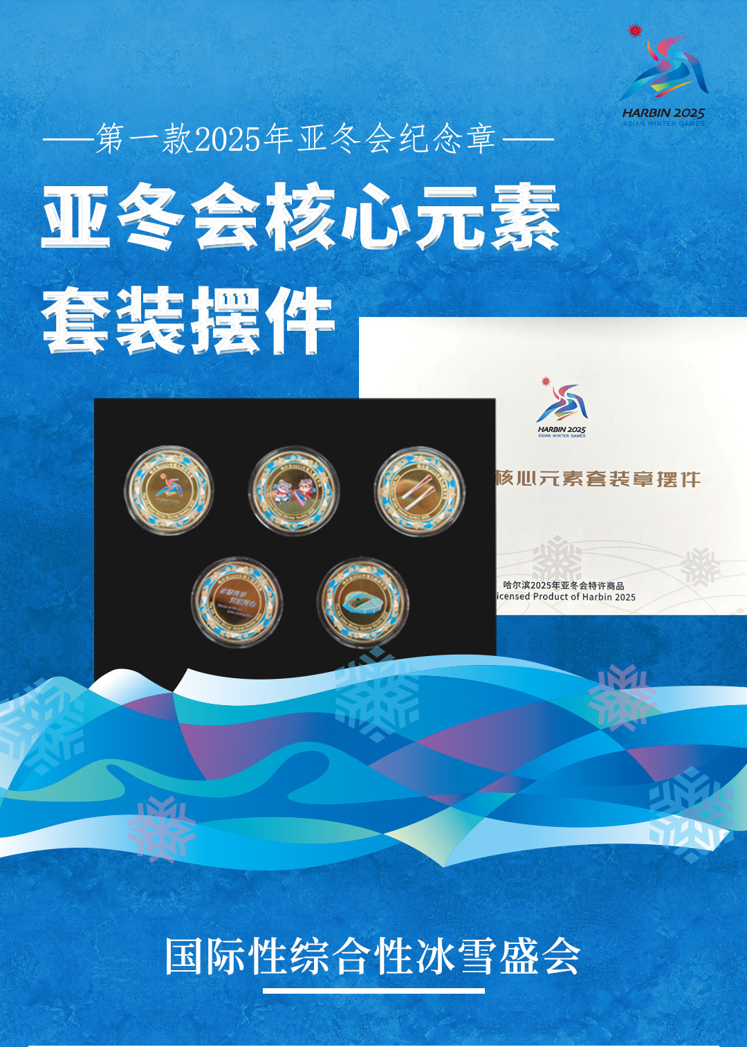 【经典】哈尔滨亚冬会2025年纪念章5枚套装摆件 第九届第一款亚冬会核心元素冰雪共舞吉祥物