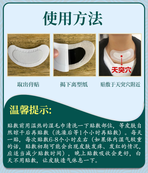1、先把贴敷部位清洁干净,取出产品揭去隔离膜,贴至天突穴,贴敷时长6-8小时,晚上贴,早上揭,皮肤敏感体质间隔一夜贴敷。