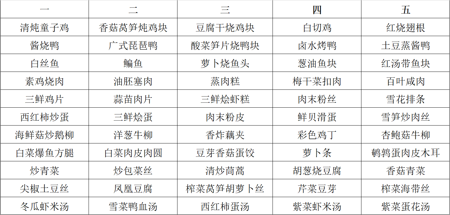6、参考菜单如下:(10人标准菜单,人数增减相应增减菜品)