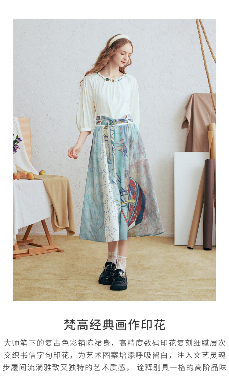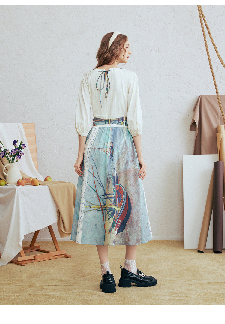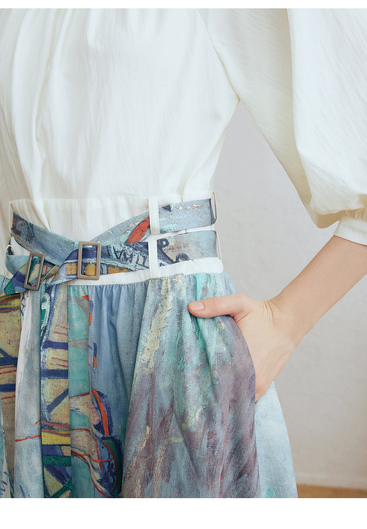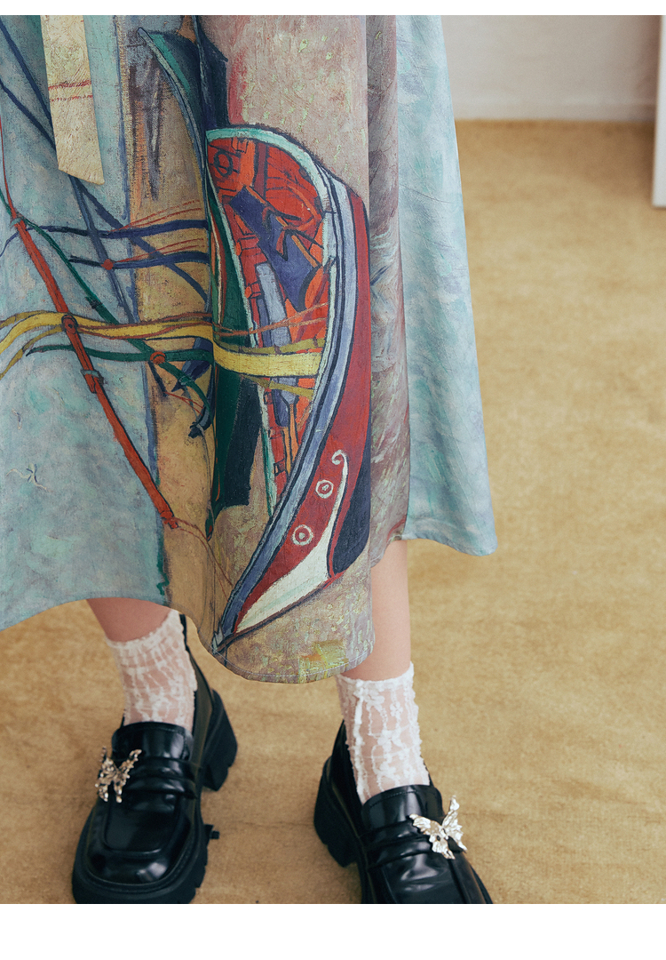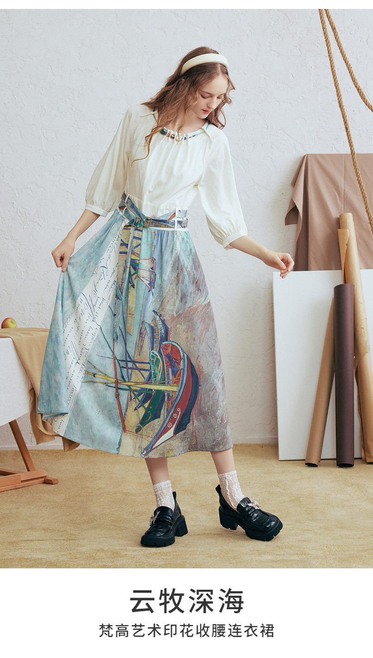 两三事 云牧深海 2026春季新款复古串珠圆领印花裙摆系带连衣裙