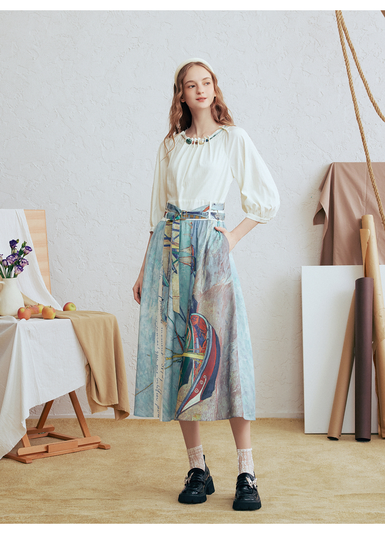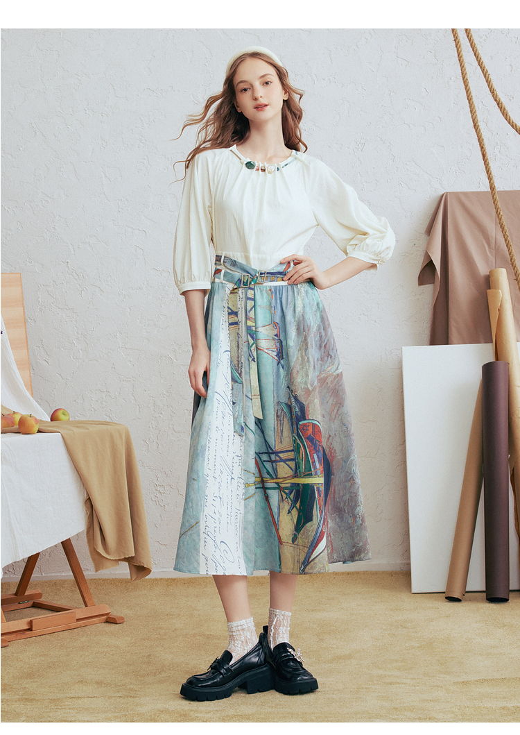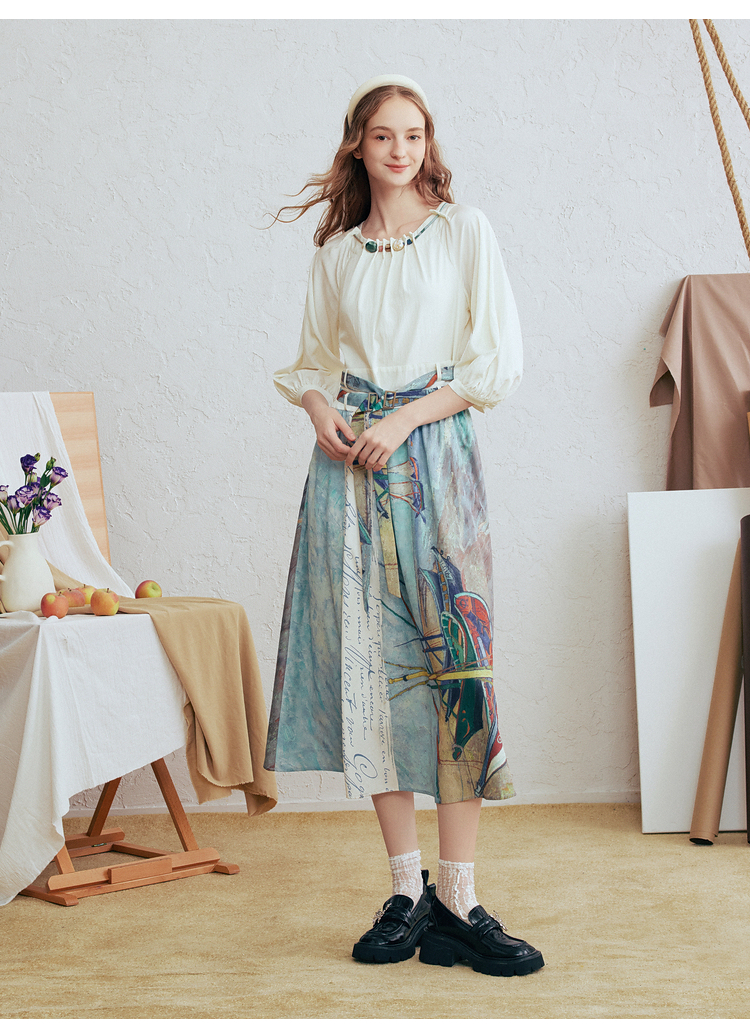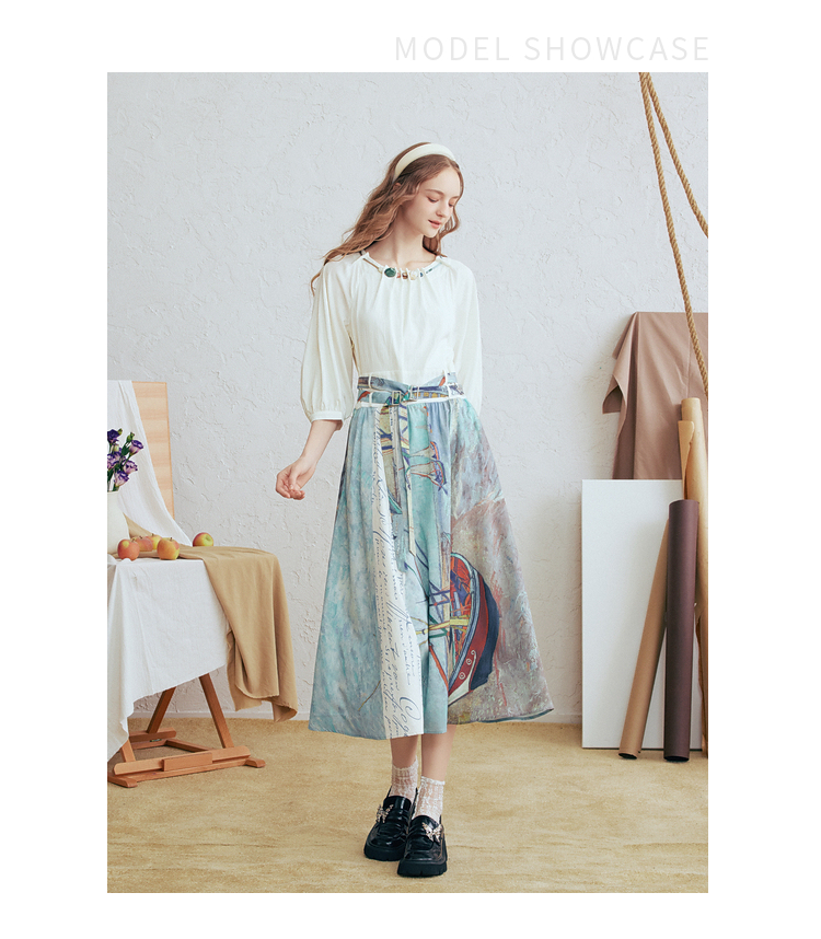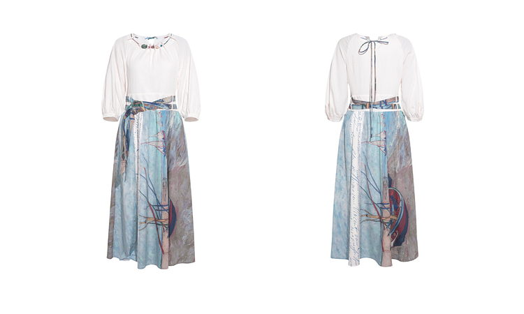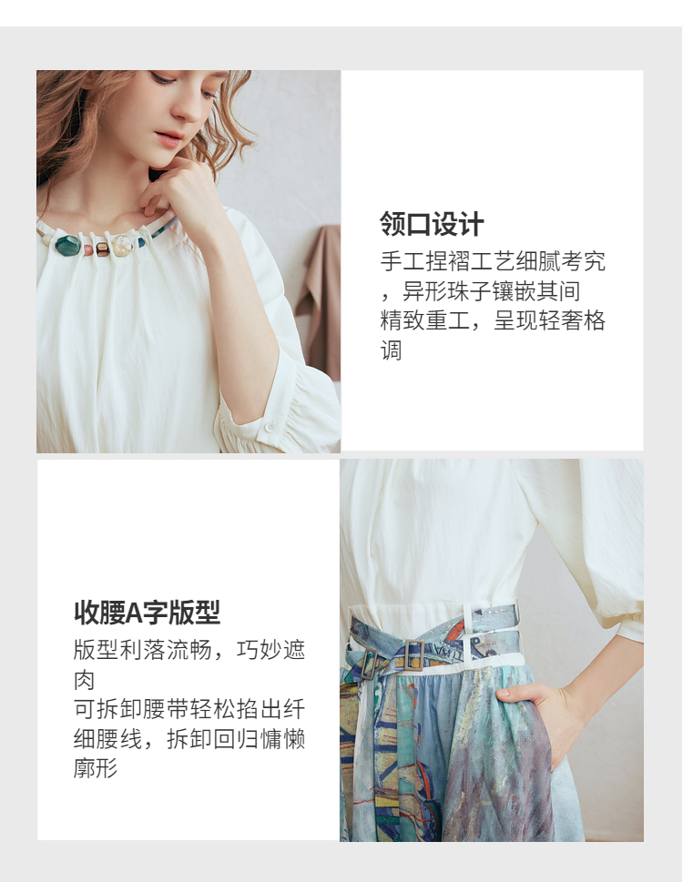 两三事 云牧深海 2026春季新款复古串珠圆领印花裙摆系带连衣裙
