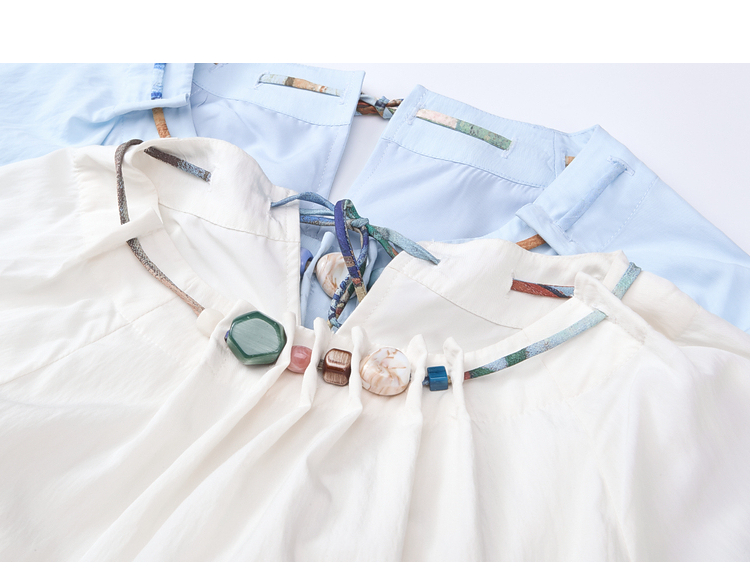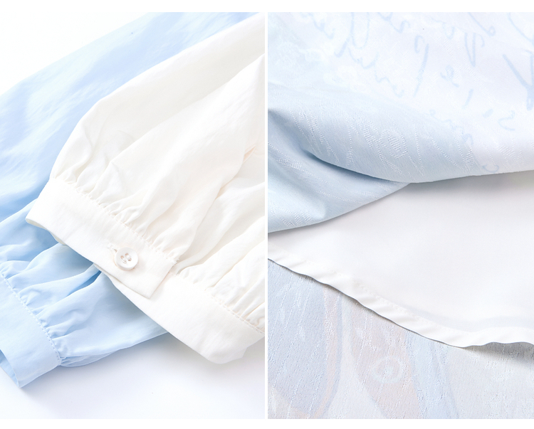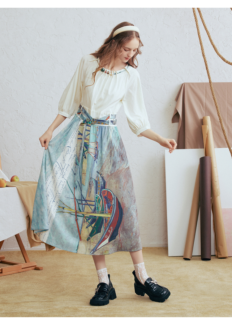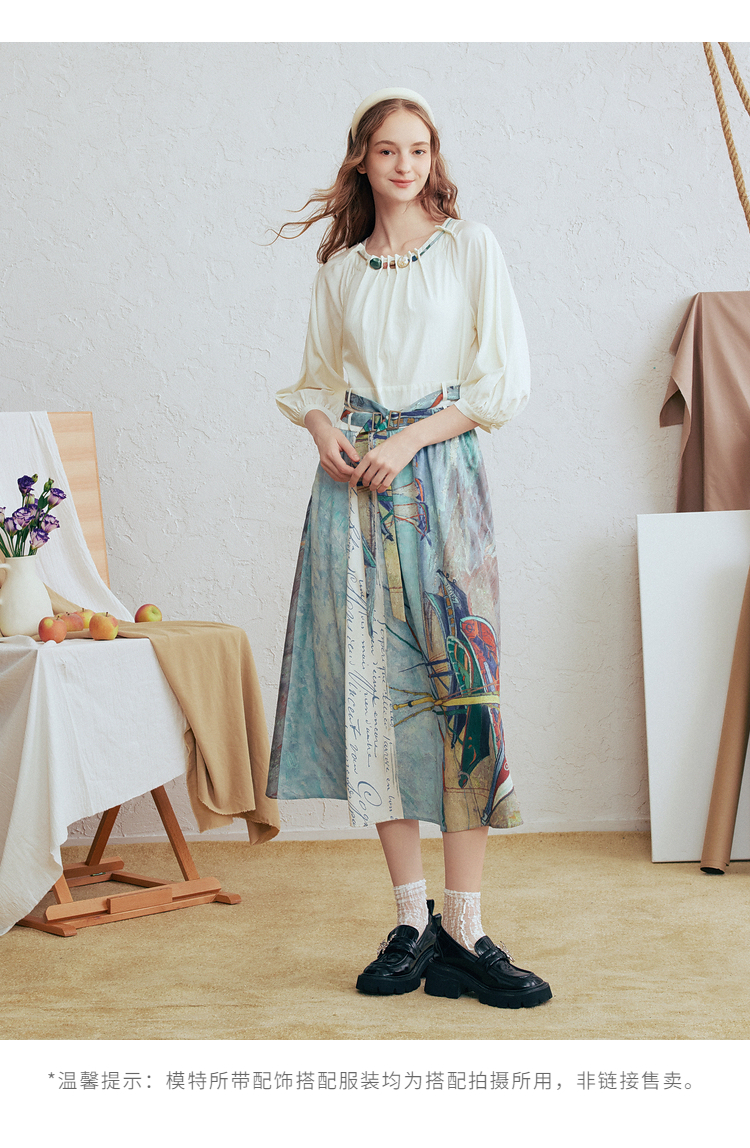 两三事不拘心迹小清新印花领带v领长袖衬衫女宽松衬衣