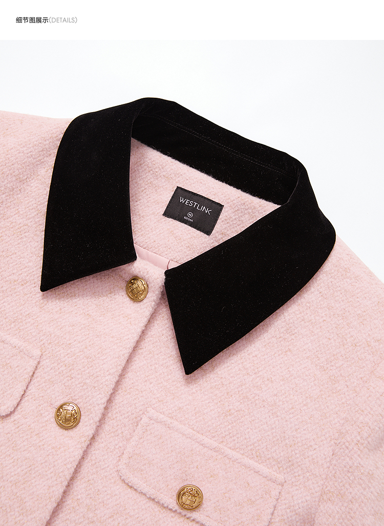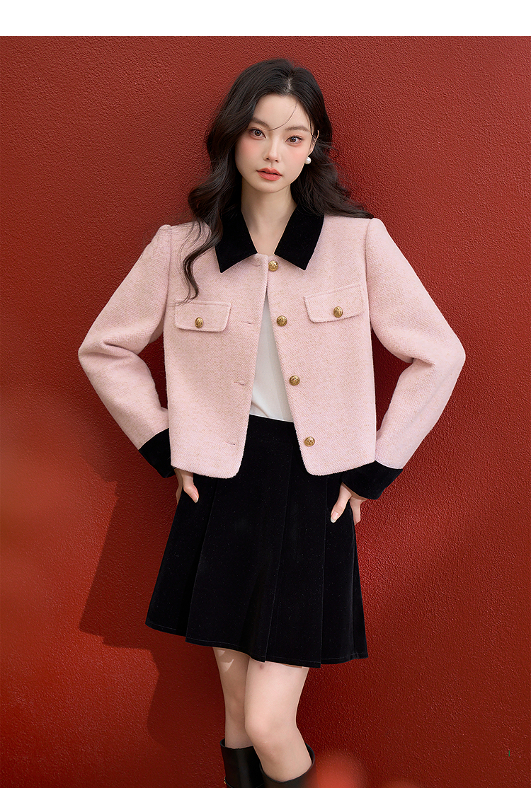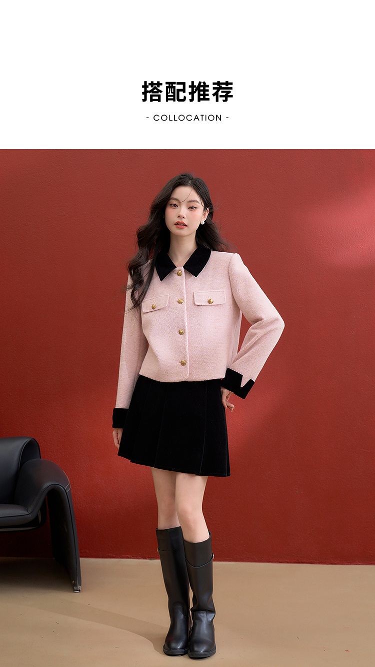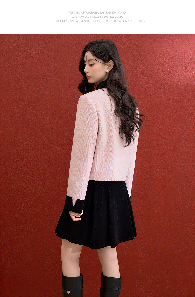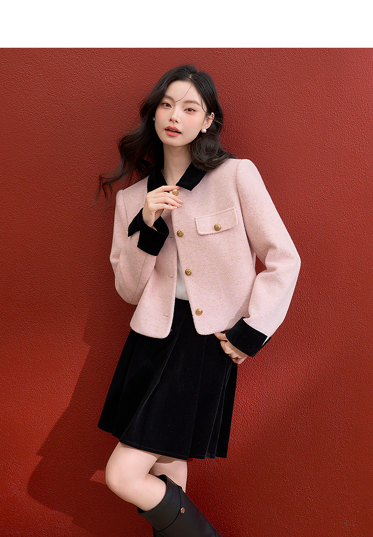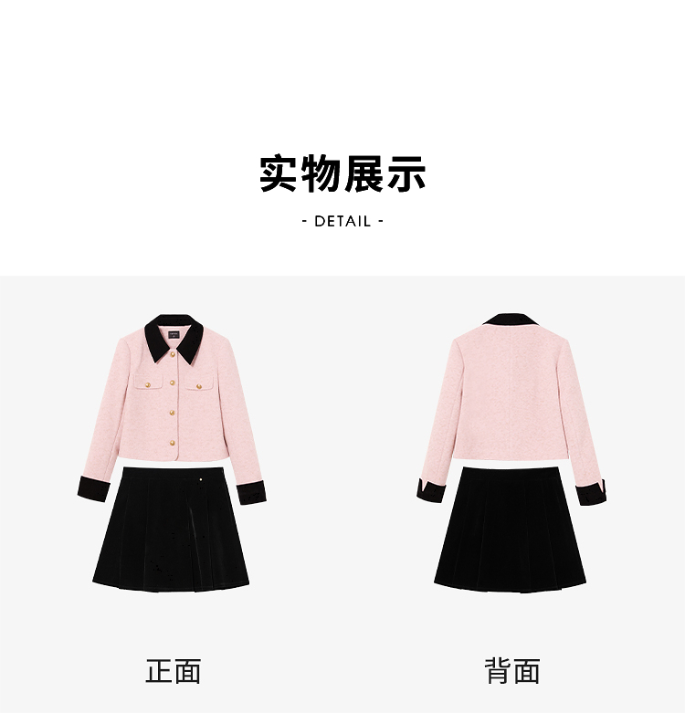 西遇撞色丝绒粉色小香风套装女冬季金扣正肩短外套A字百褶裙V4155413