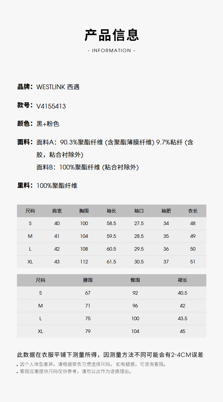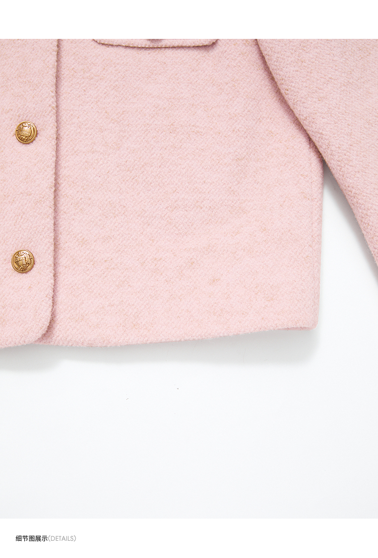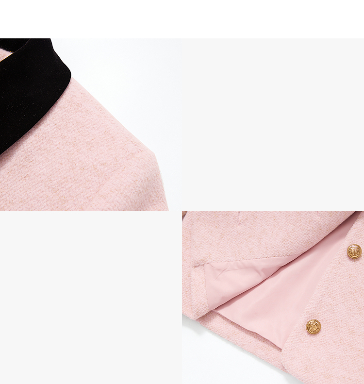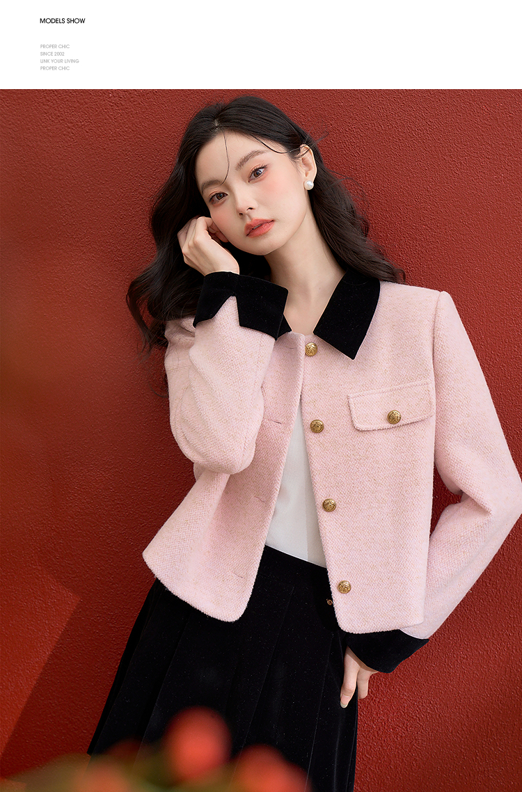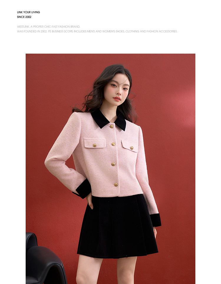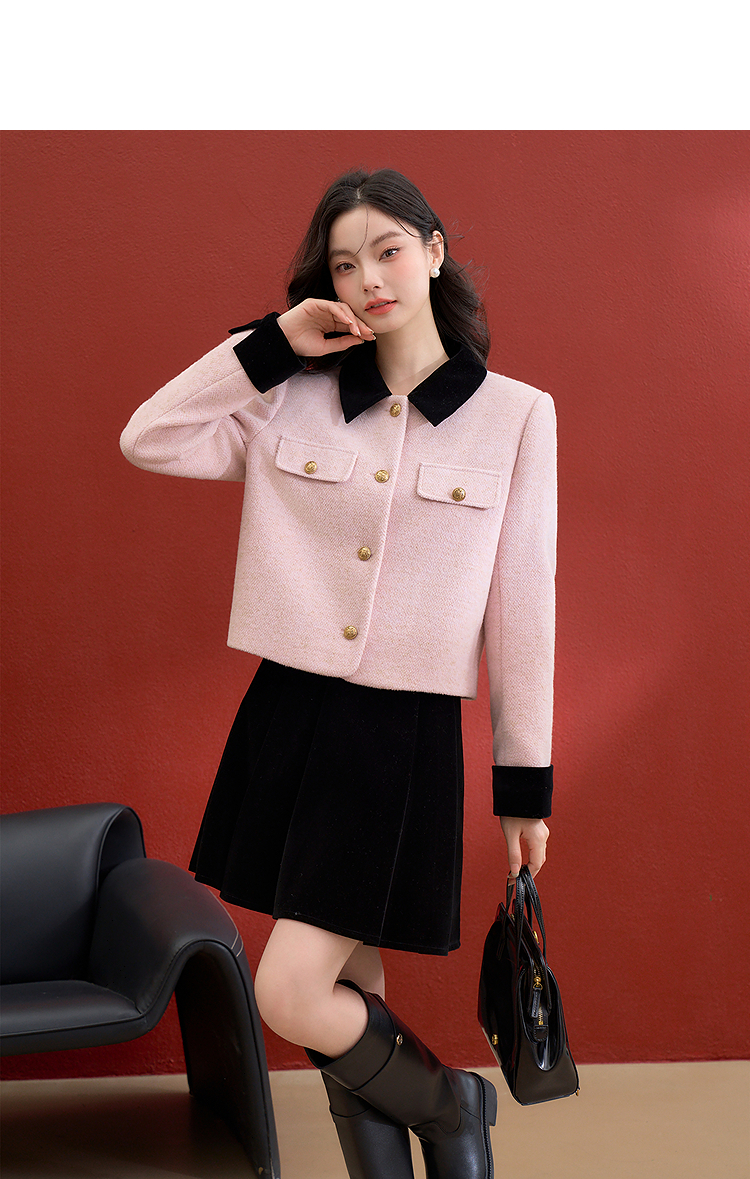 西遇撞色丝绒粉色小香风套装女冬季金扣正肩短外套A字百褶裙V4155413
