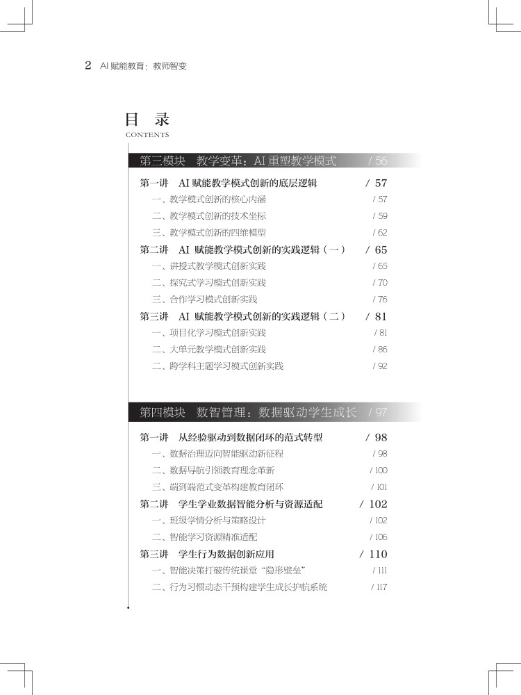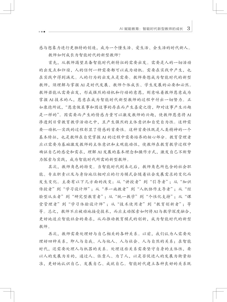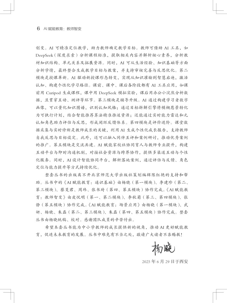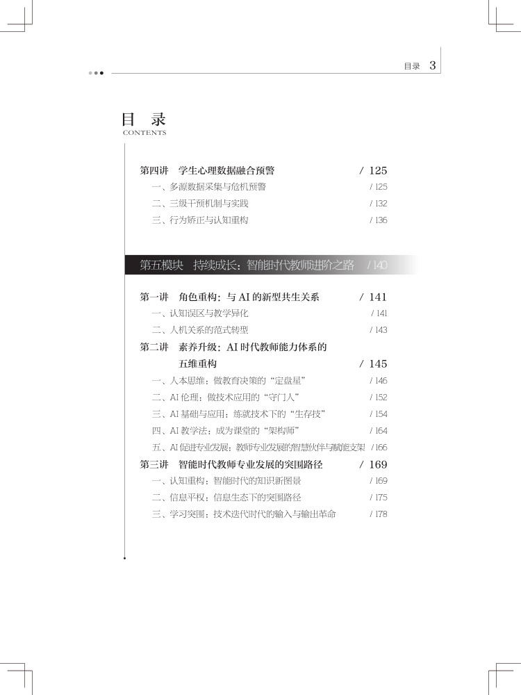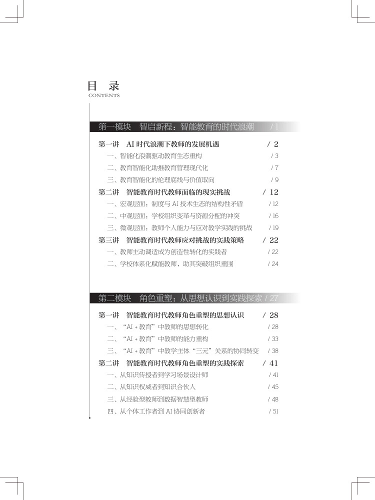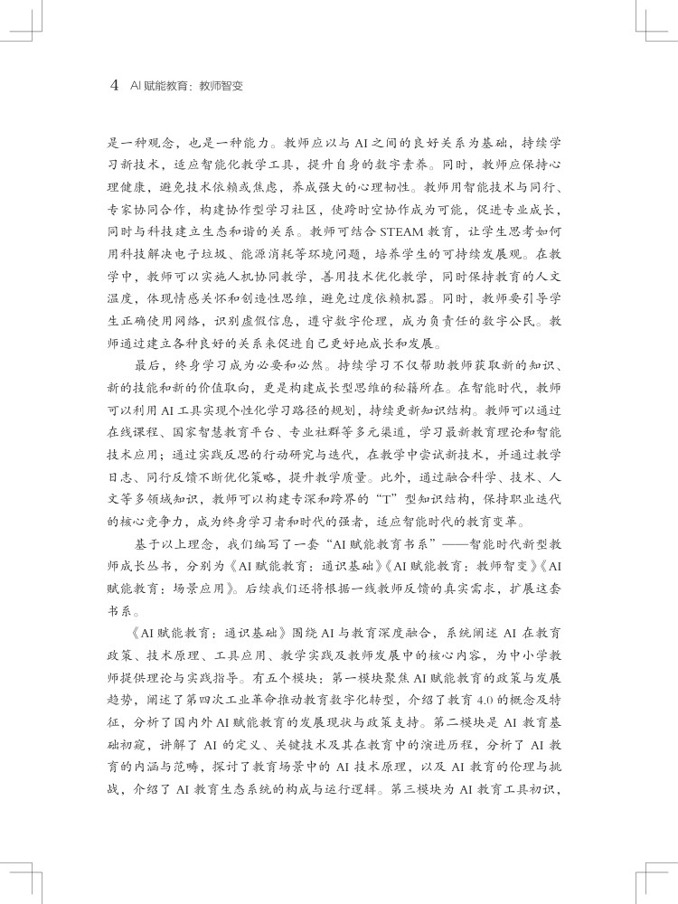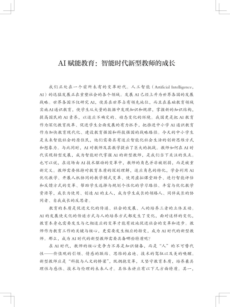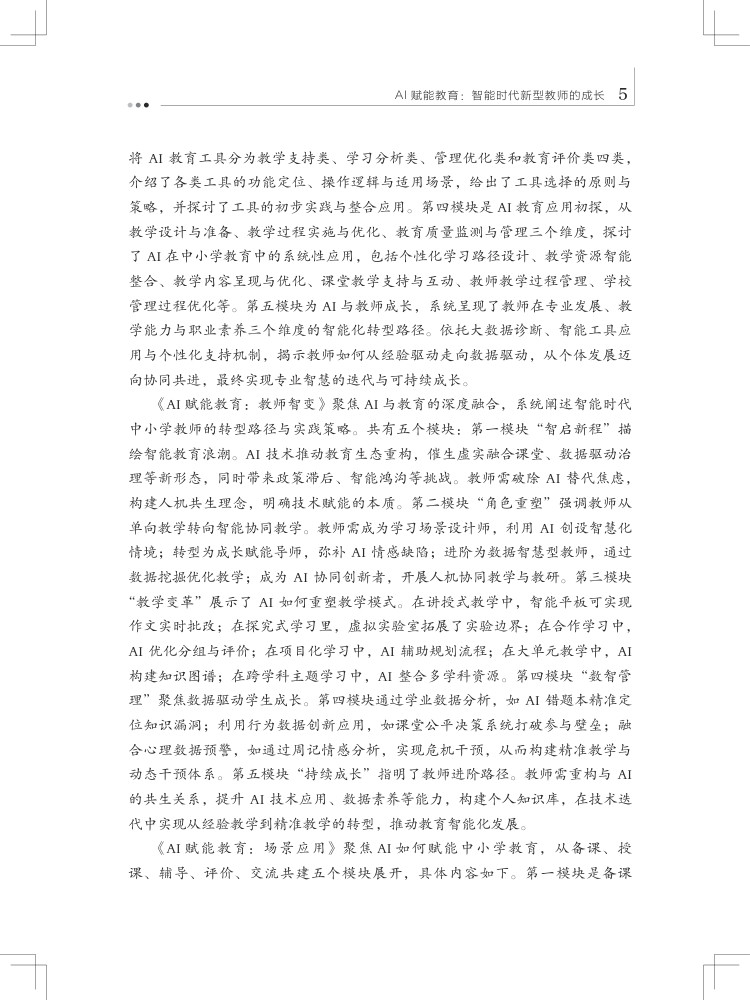 本书聚焦人工智能与教育深度融合,为中小学教师量身打造转型路径与实践策略,以五大核心模块构建完整知识体系。“智启新程” 勾勒智能教育新生态,破除 AI 替代焦虑,树立人机共生理念;“角色重塑” 明确教师四大新定位,实现从单向教学到智能协同的跨越;“深度融合” 落地六大教学模式,用 AI 赋能课堂创新;“数智管理” 以学业、行为、心理数据为抓手,构建精准教学干预体系;“持续成长” 指明能力提升路径,推动教师从经验教学向精准教学转型。