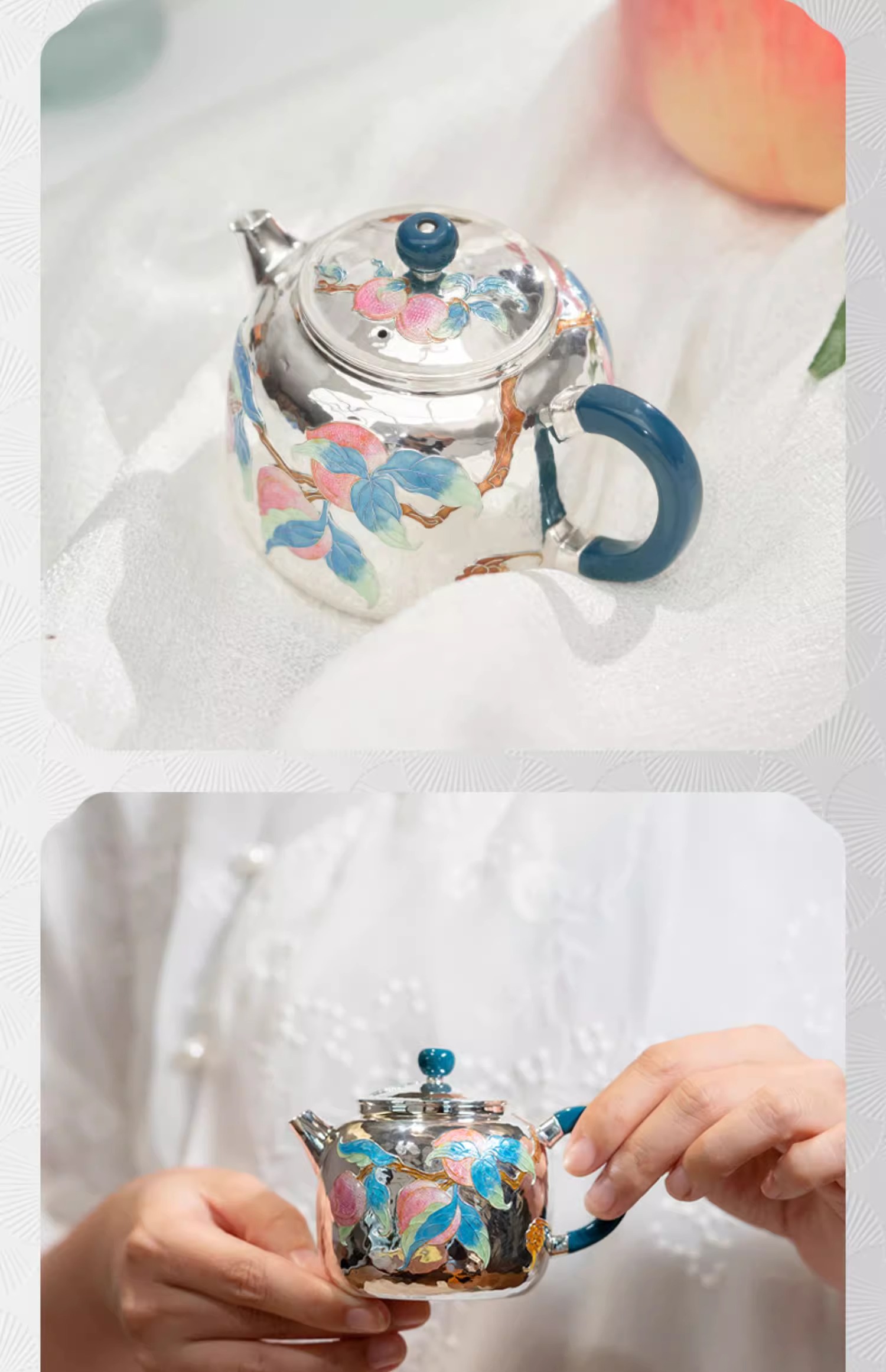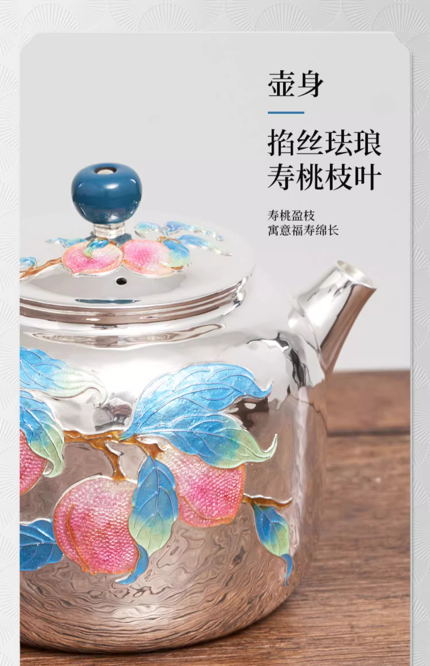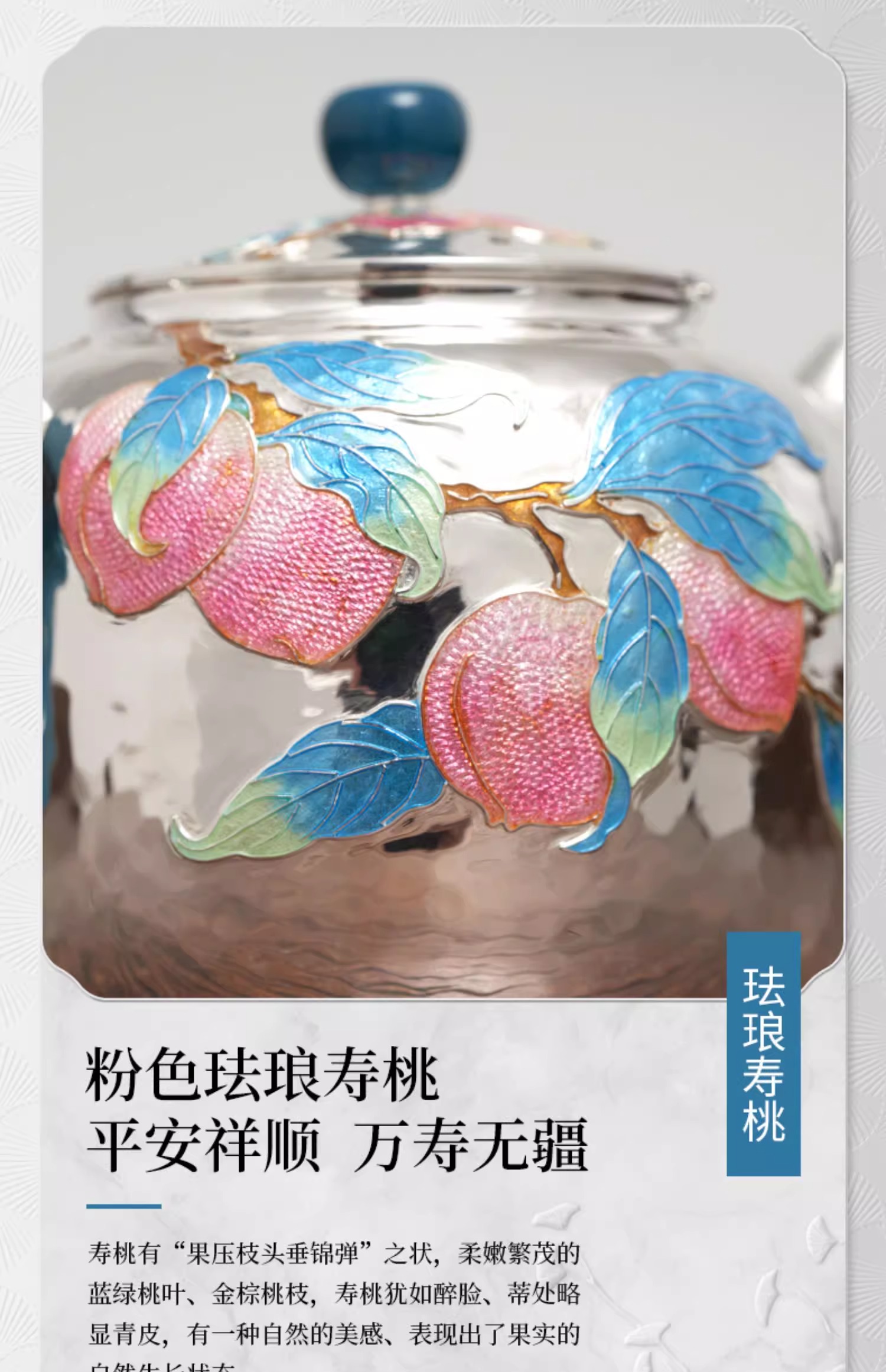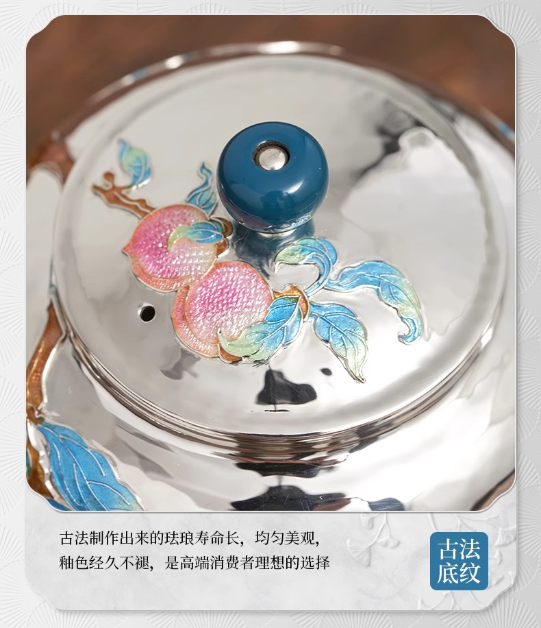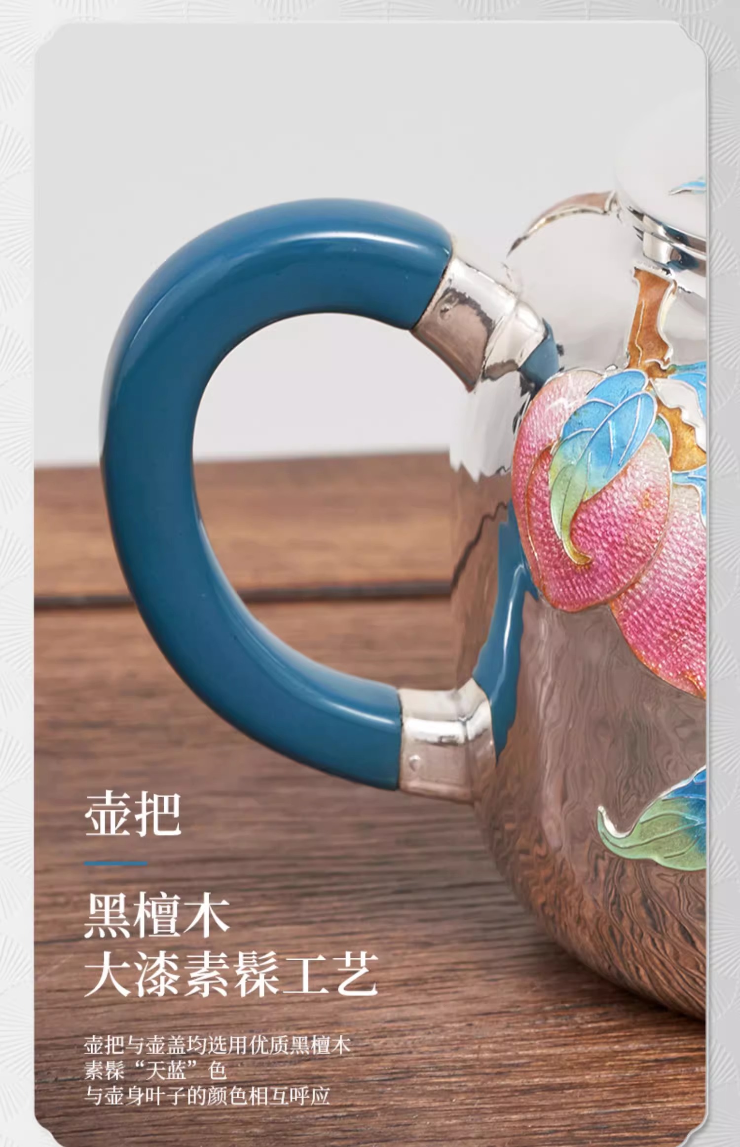 臻宝堂银壶999纯银泡茶壶纯手工寿桃粉色珐琅壶足银制作高端茶具珐琅德钟福寿壶150ml