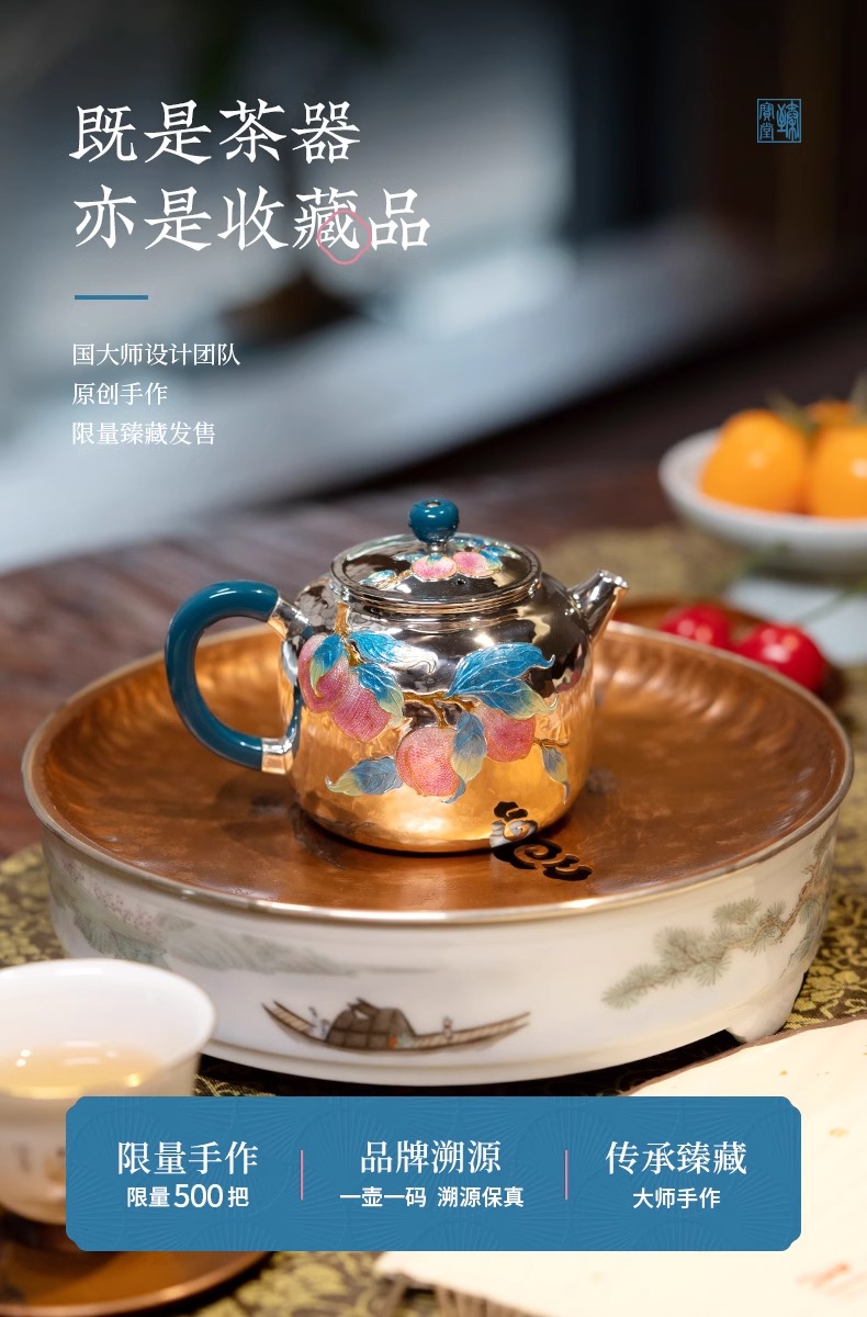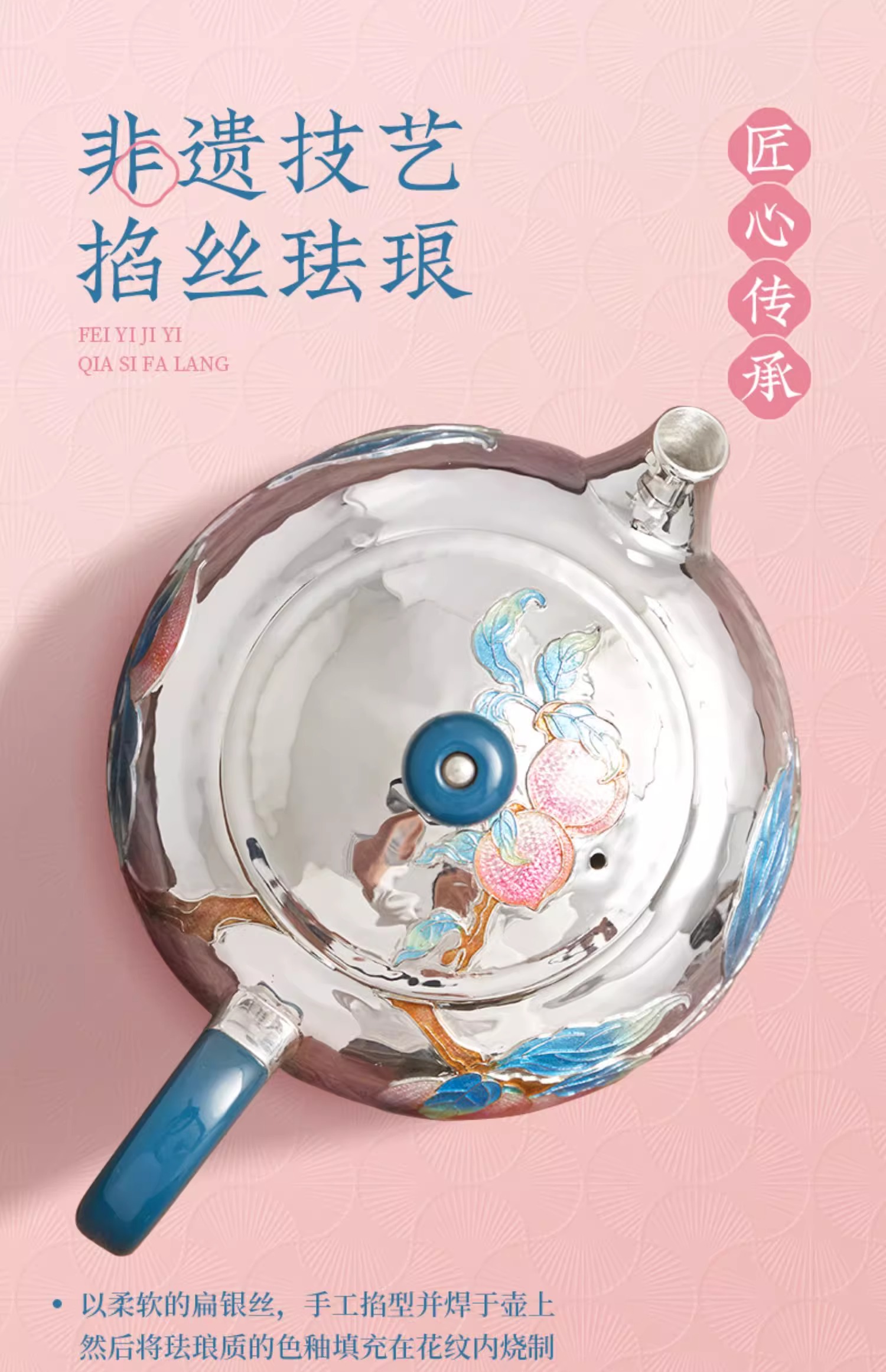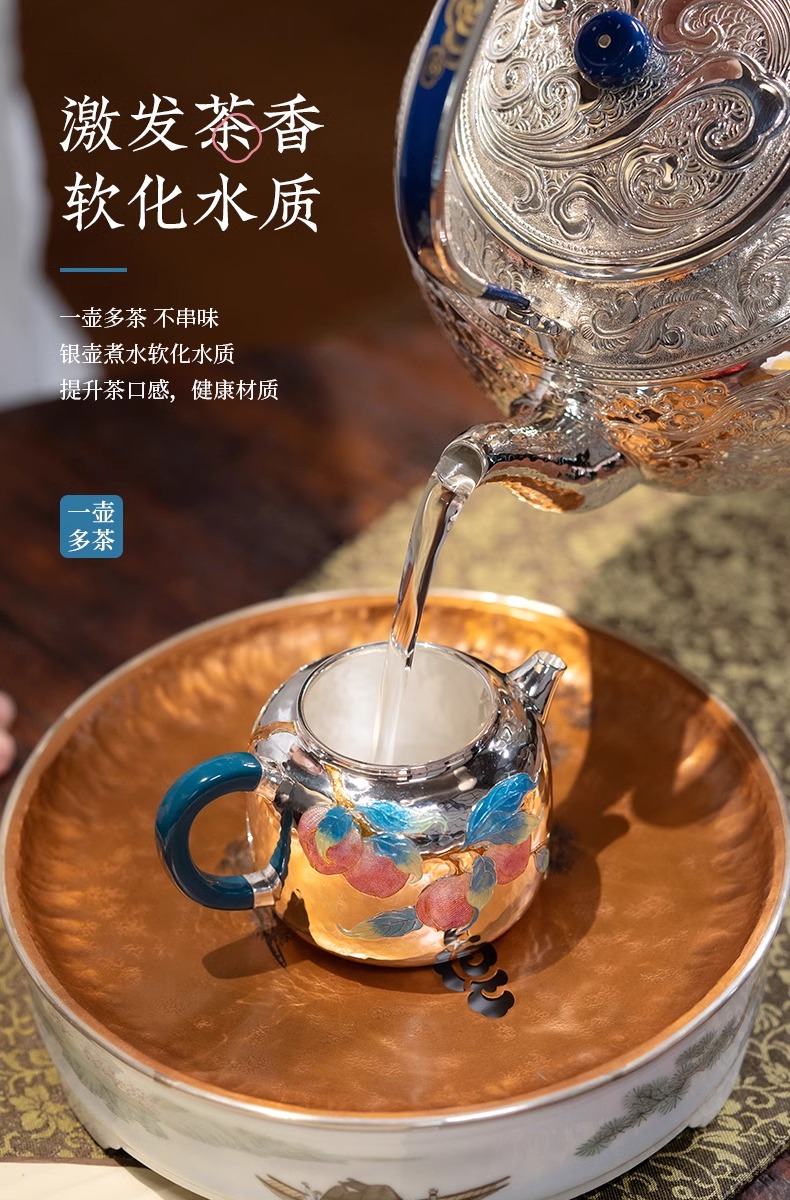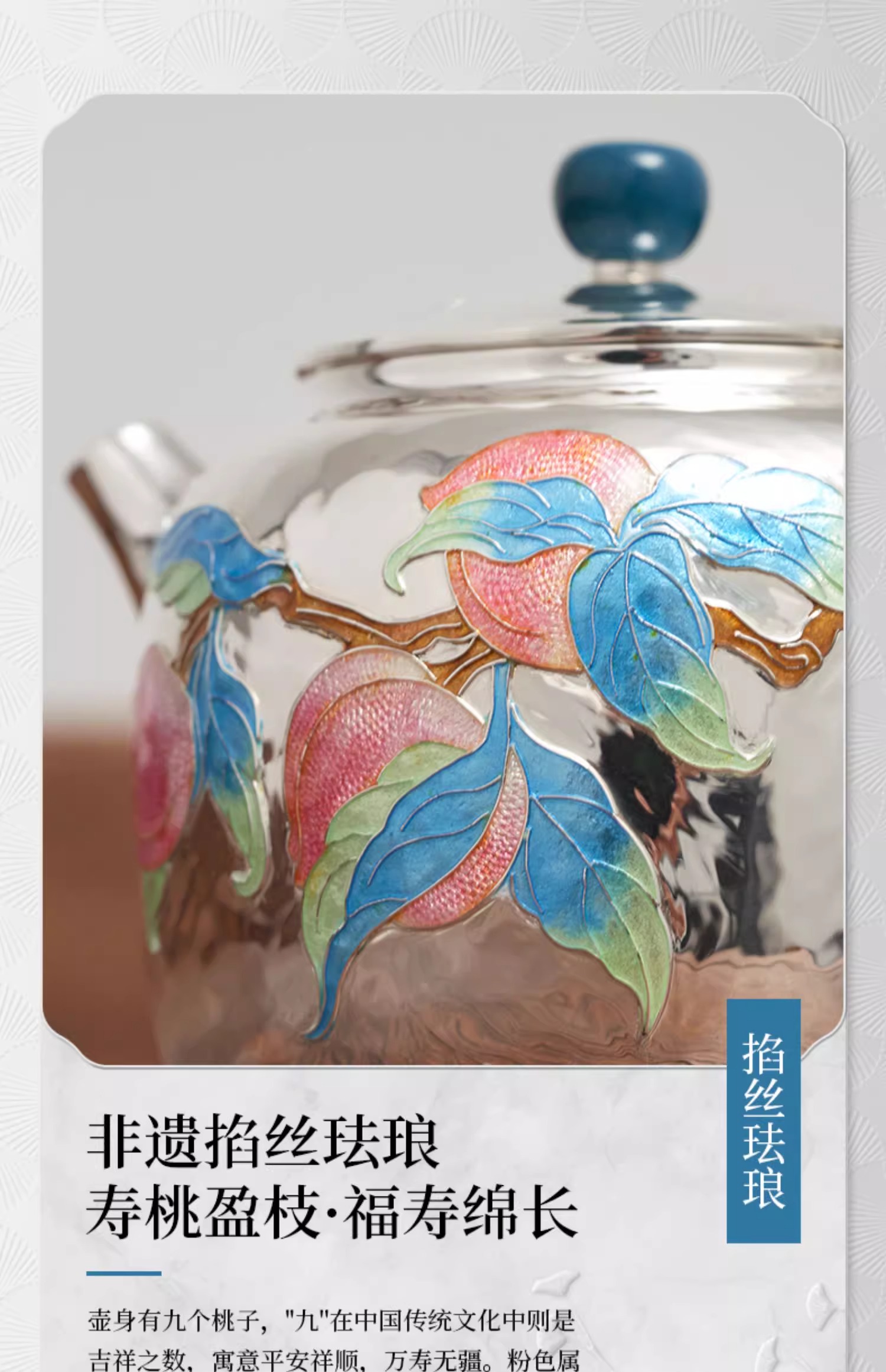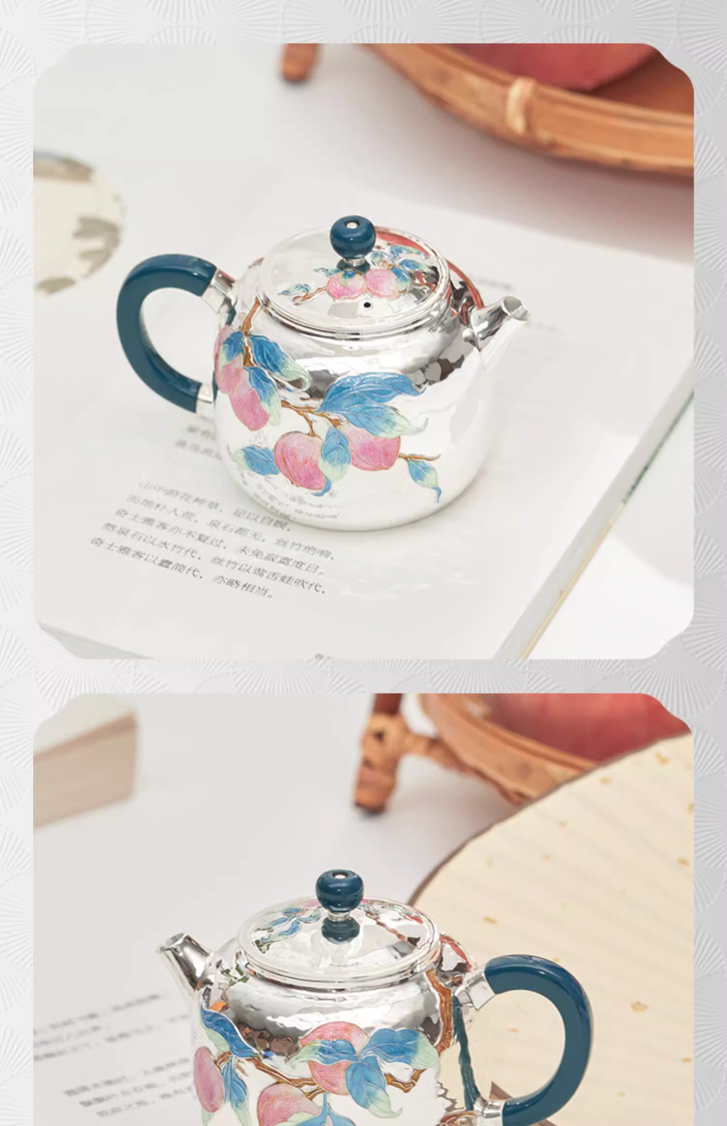 臻宝堂银壶999纯银泡茶壶纯手工寿桃粉色珐琅壶足银制作高端茶具珐琅德钟福寿壶150ml