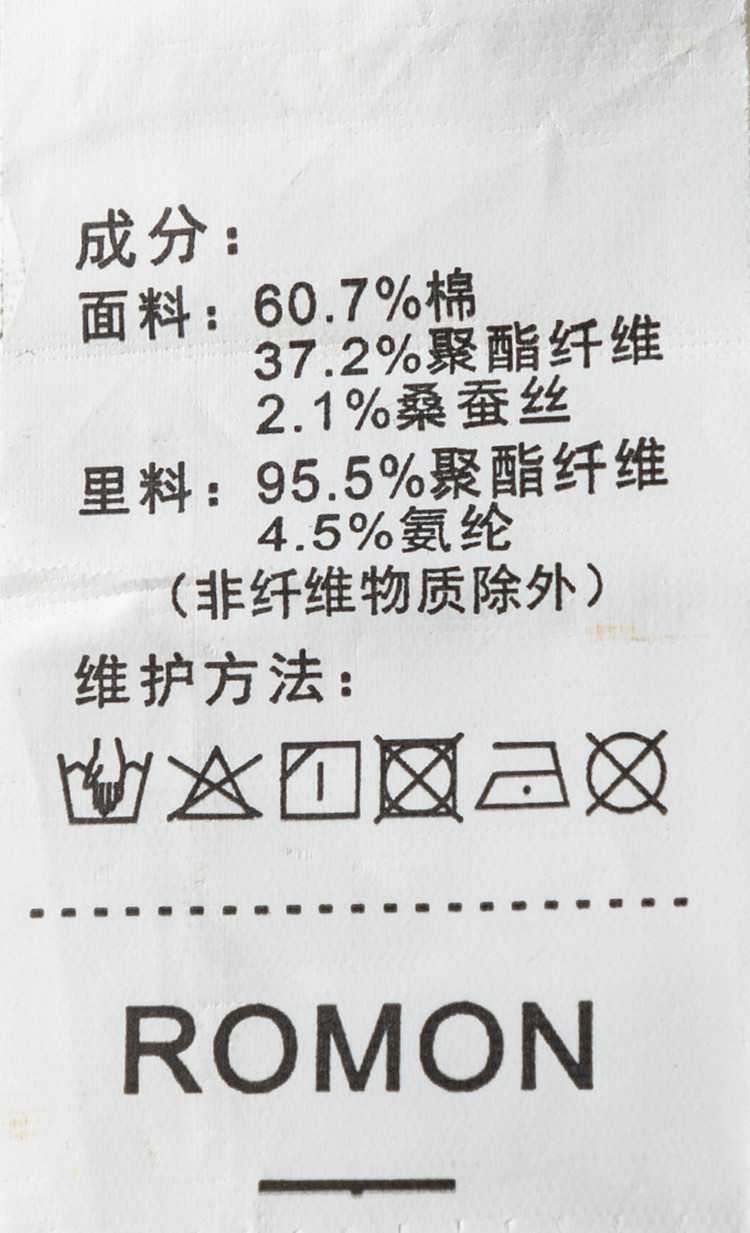 面料:60.7%棉 37.2%聚酯纤维 2.1%桑蚕丝