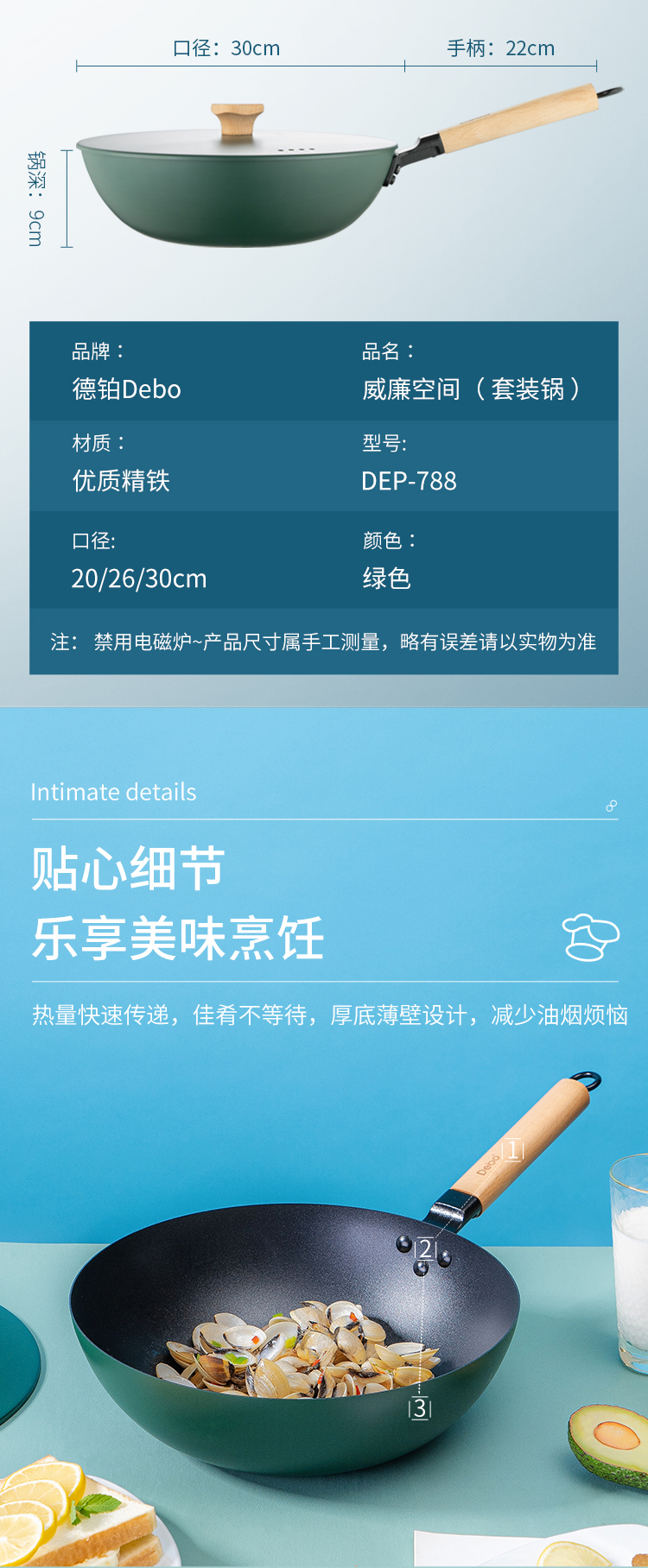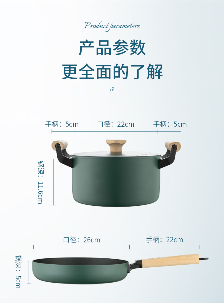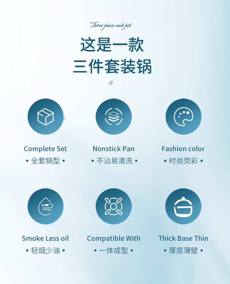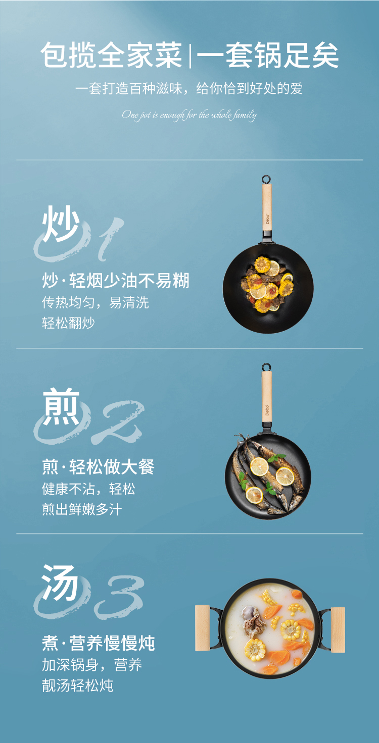 配置:炒锅锅身*1、汤锅锅身1、煎锅锅身*1、钢盖*2