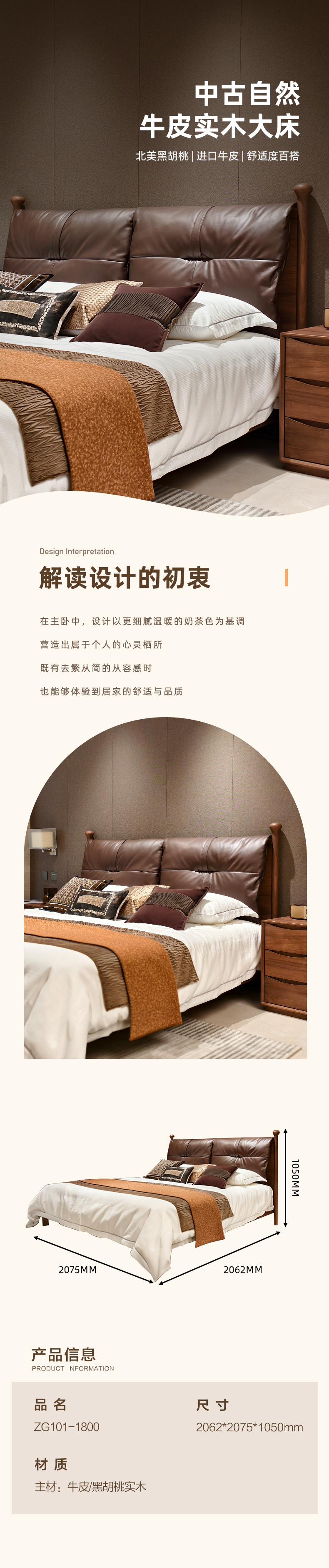 【中古风-ZG101-1800床】黑胡桃/真皮/卧房/实木大床/实木软包大床
