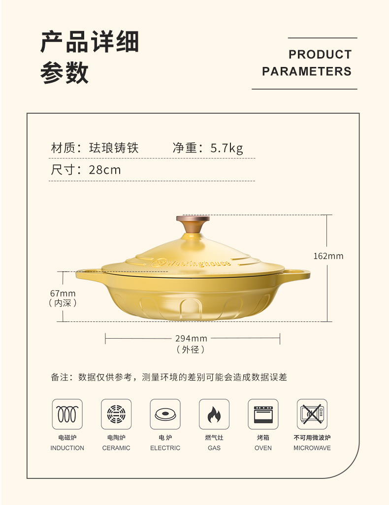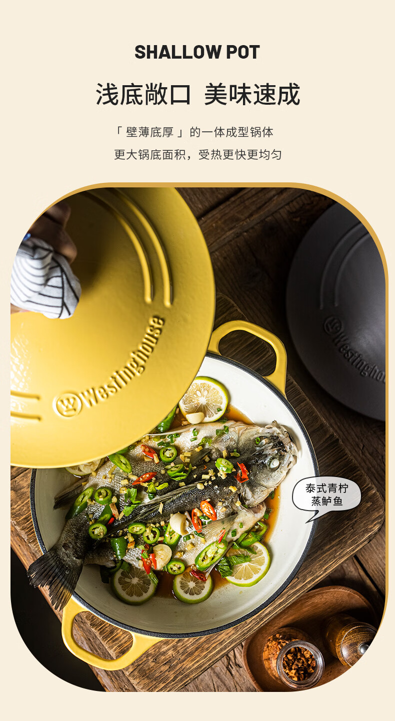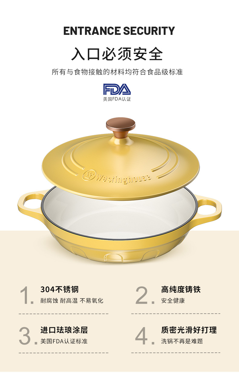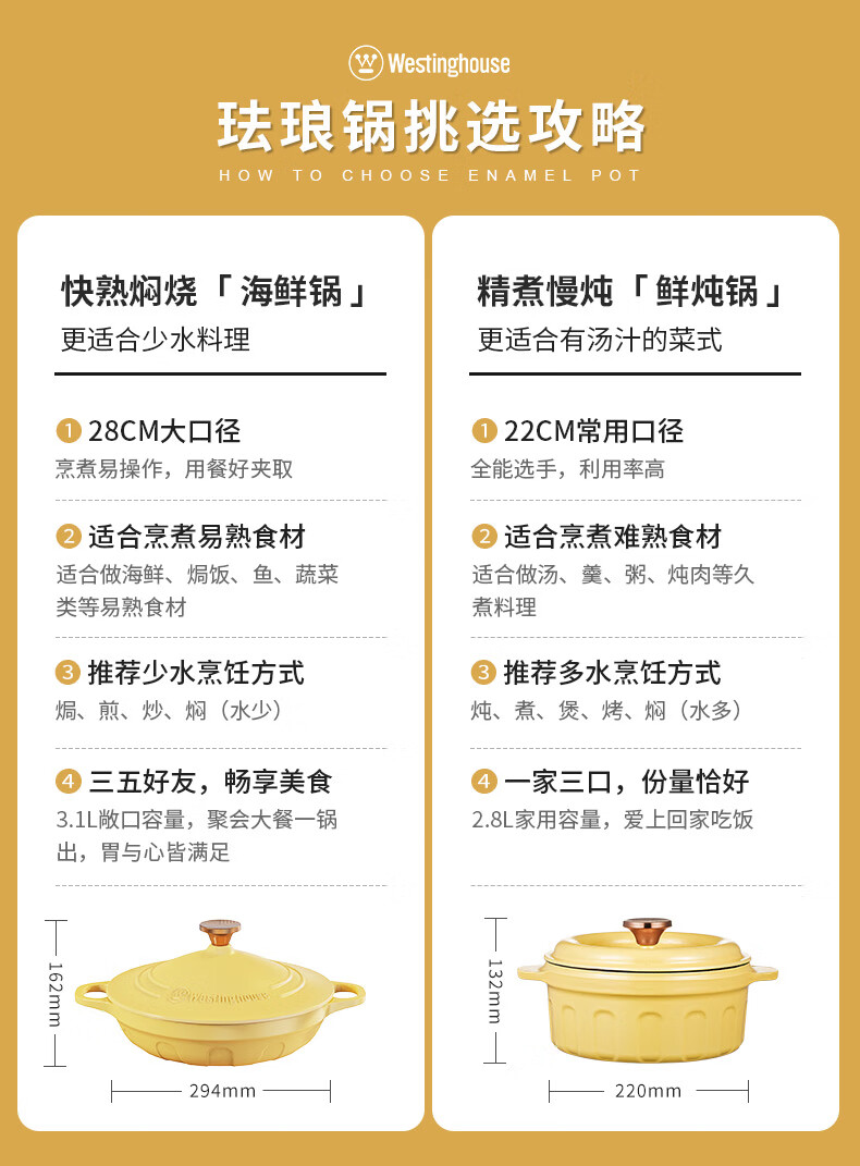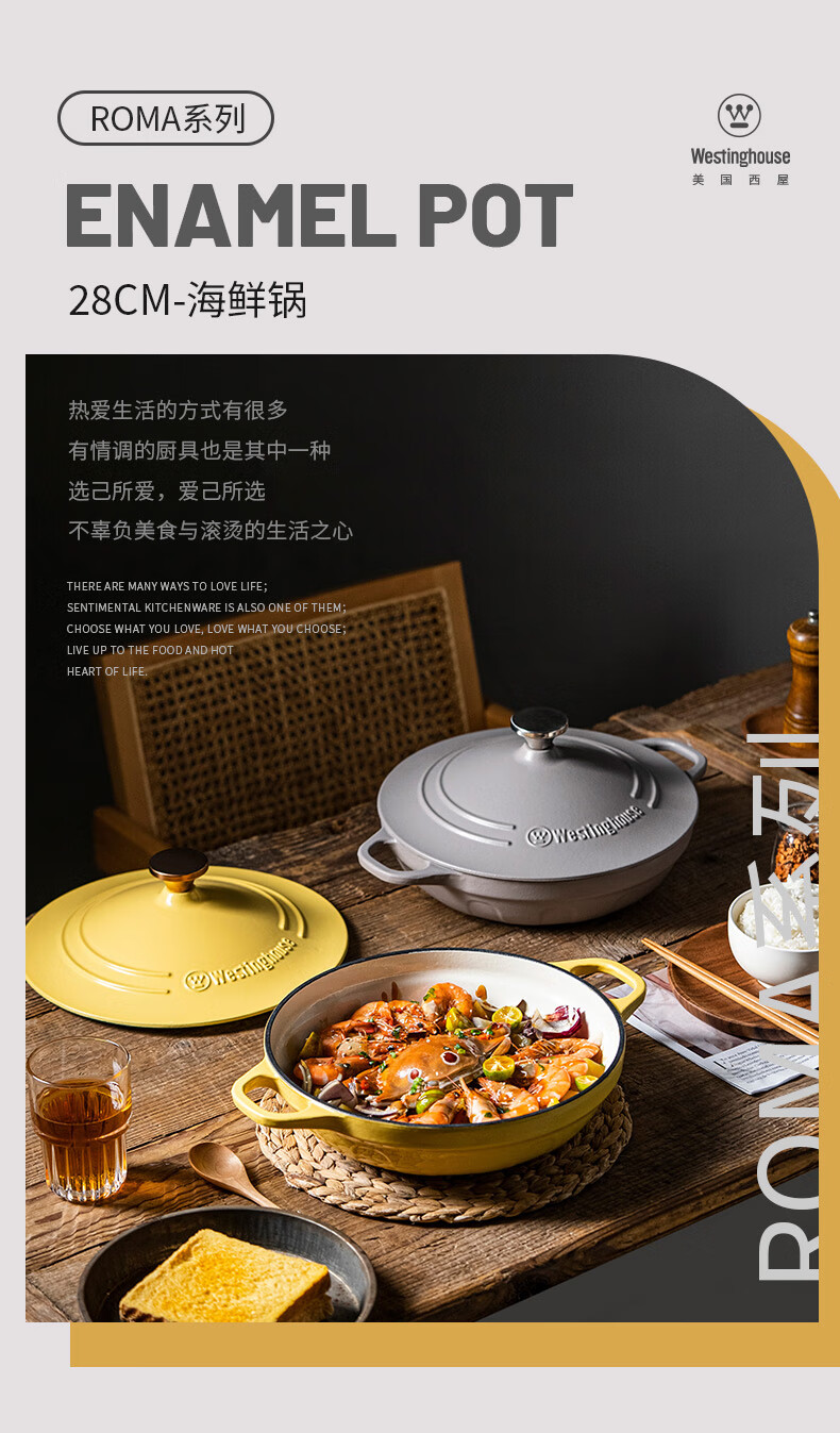 【美国西屋珐琅海鲜锅】西屋(Westinghouse) 珐琅铸铁锅炒锅家用焖焗锅海鲜锅多功能锅无水焖炖汤锅一锅多用 麦芒黄 28cm
