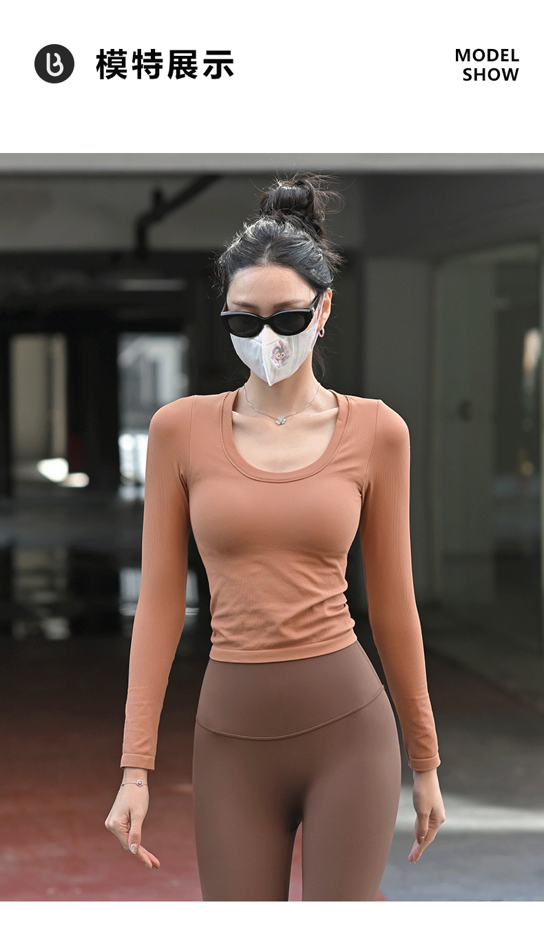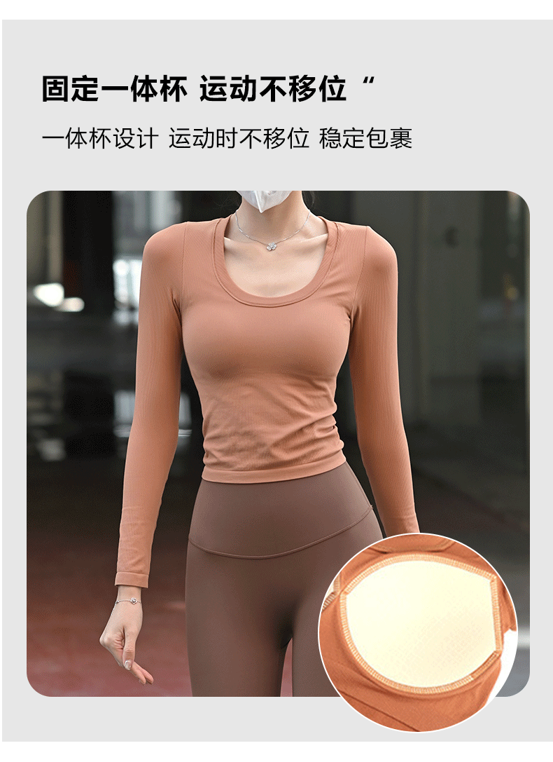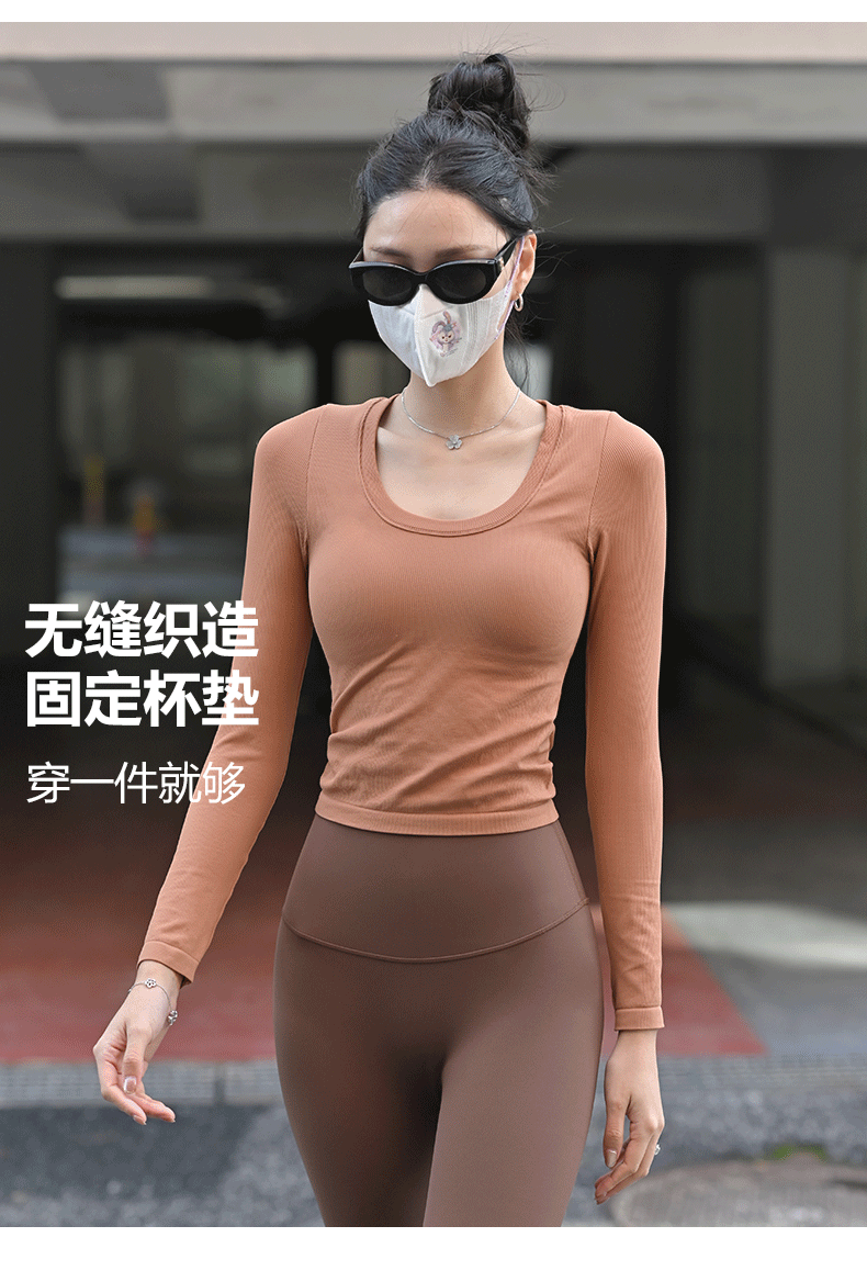 【胸垫款长袖】Beemen无缝一体织固定杯瑜伽服女上衣外穿秋冬运动长袖