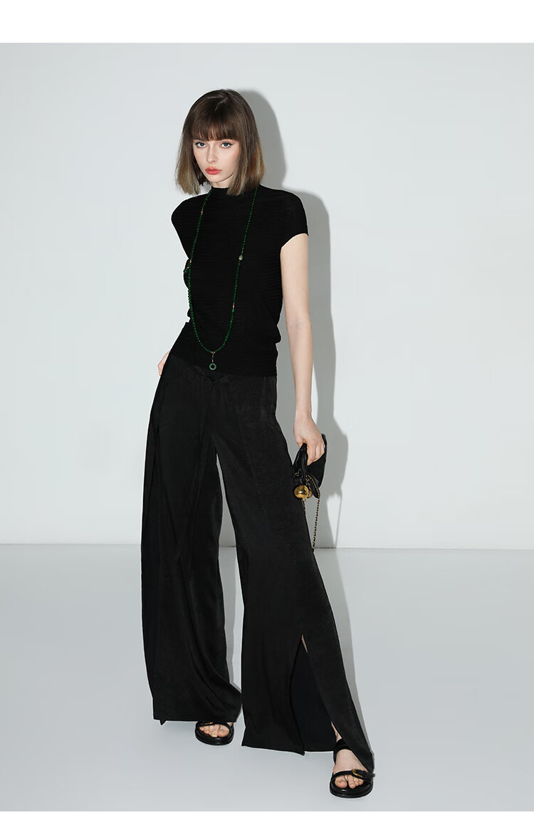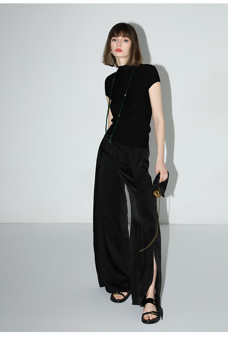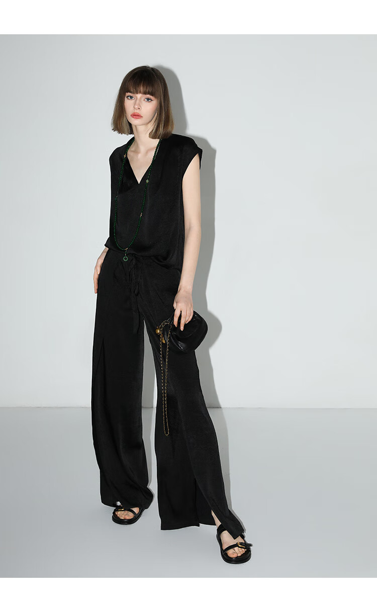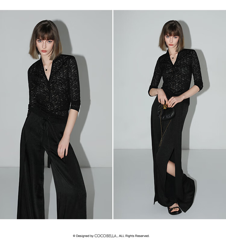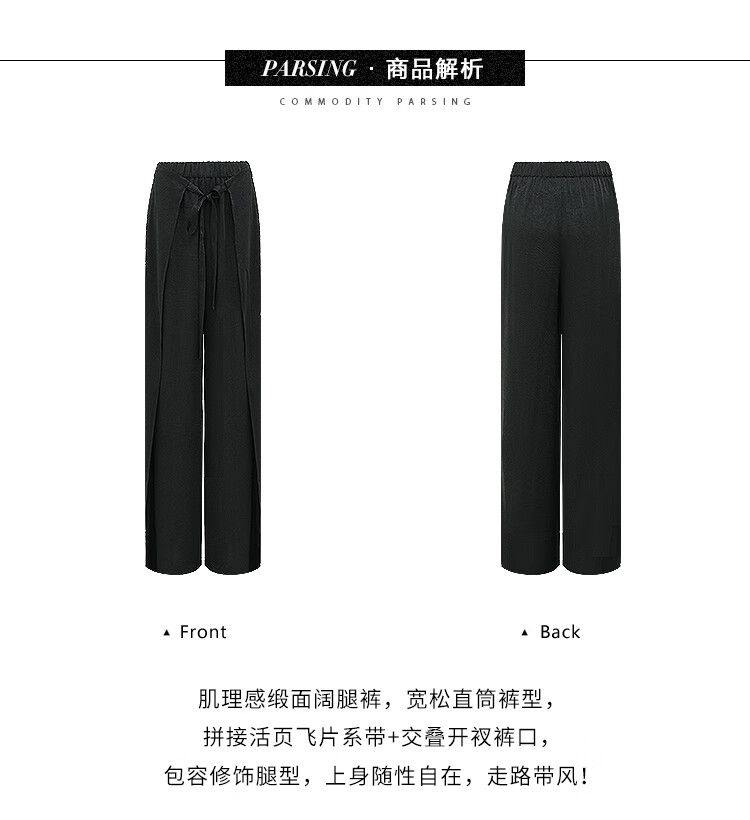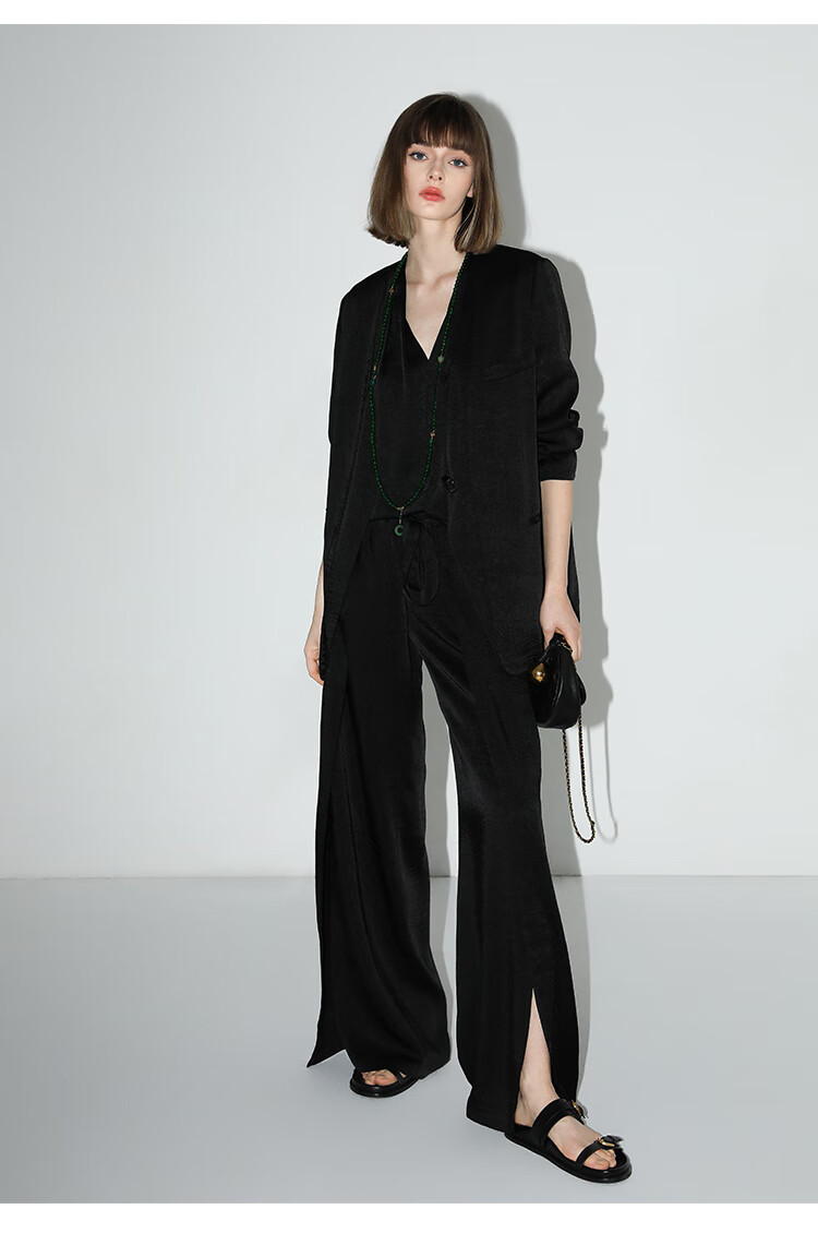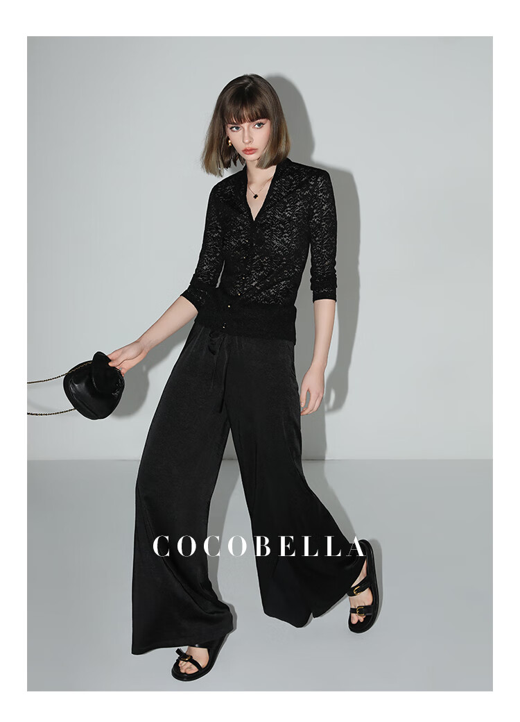 COCOBELLA静奢风肌理缎面飞片开叉阔腿裤垂坠直筒裤PA0013-2