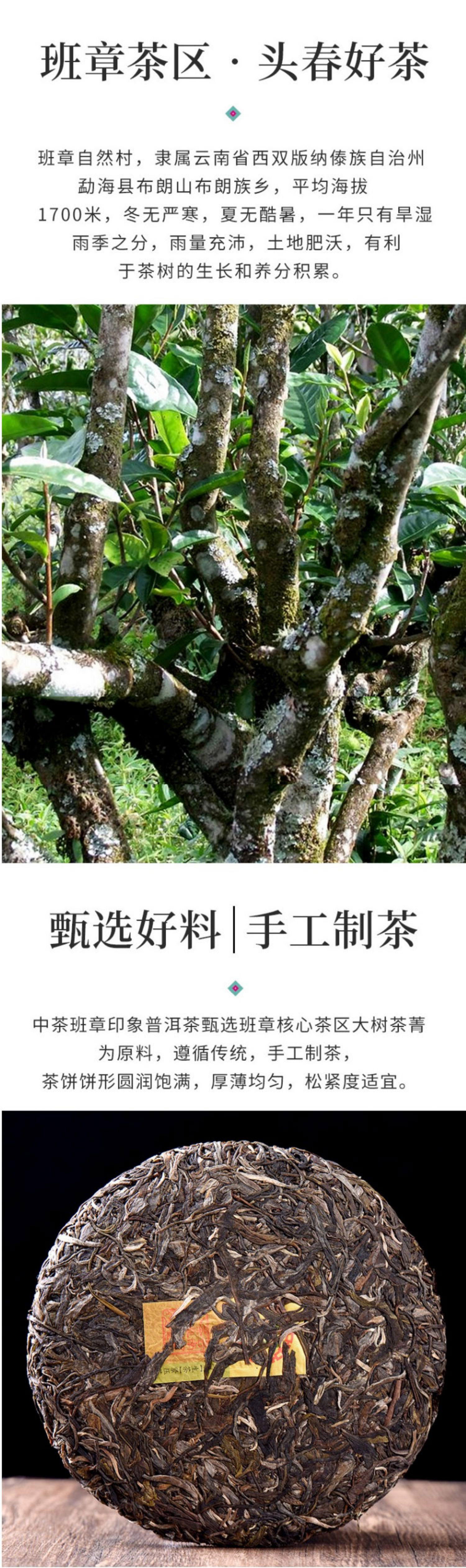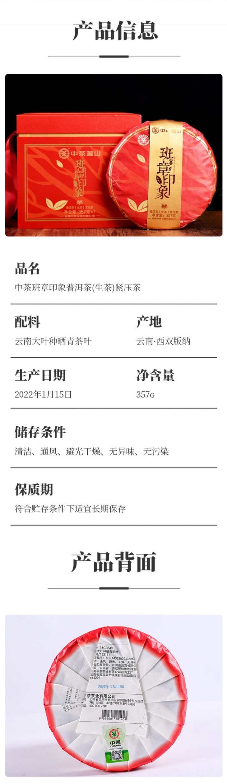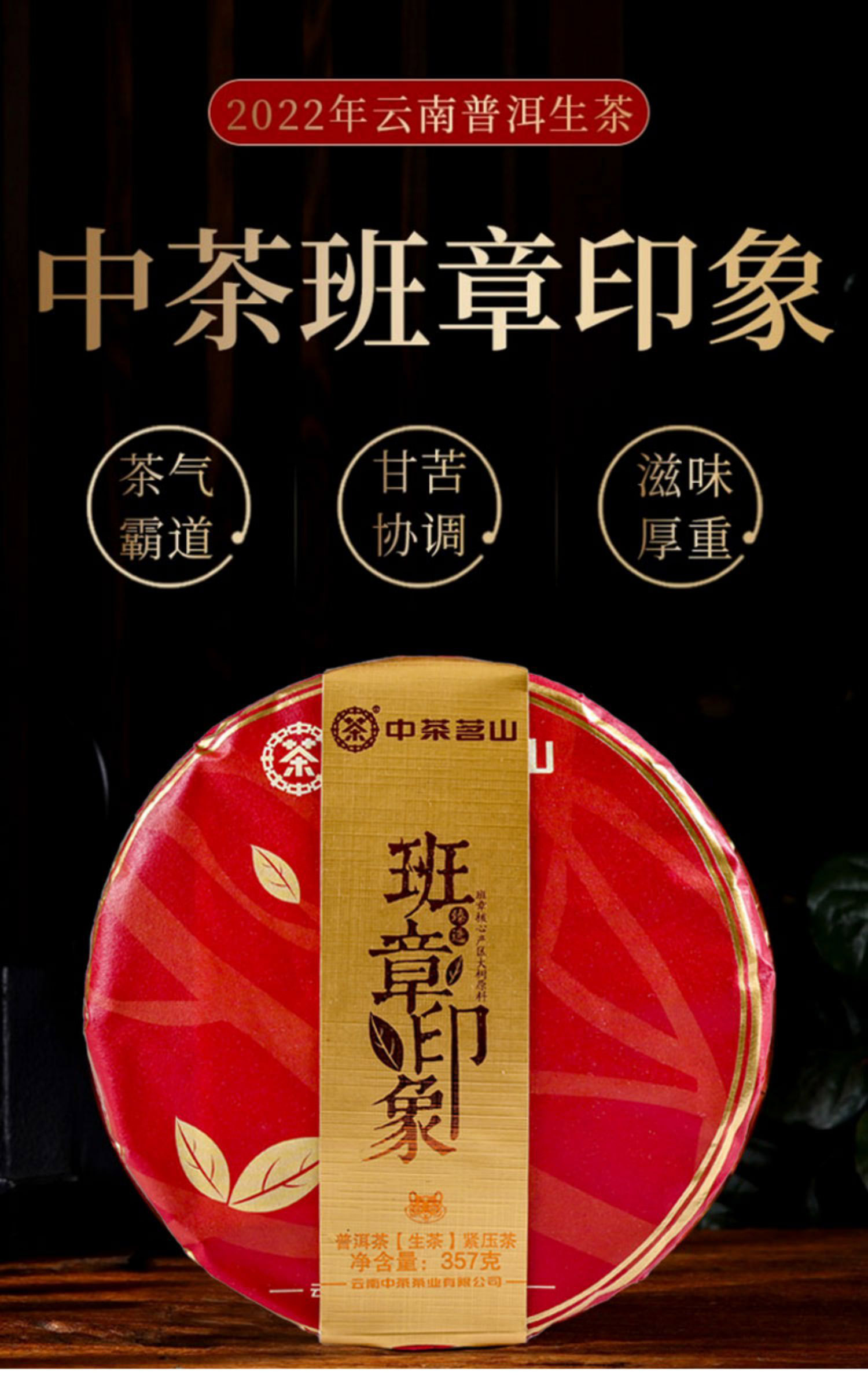 中粮-中茶2022年中茶茗山系列班章印象普洱生茶圆茶饼-云南七子饼茶)357g/饼/干仓直发
