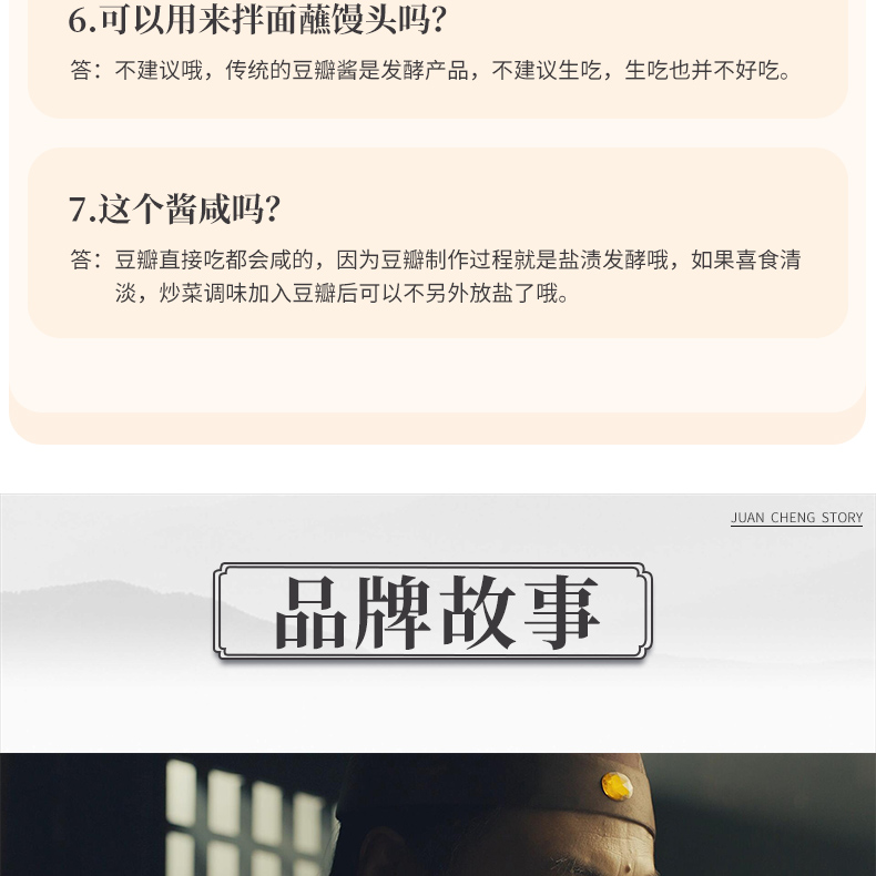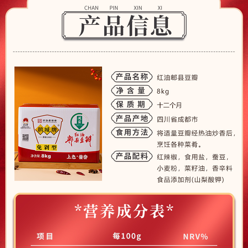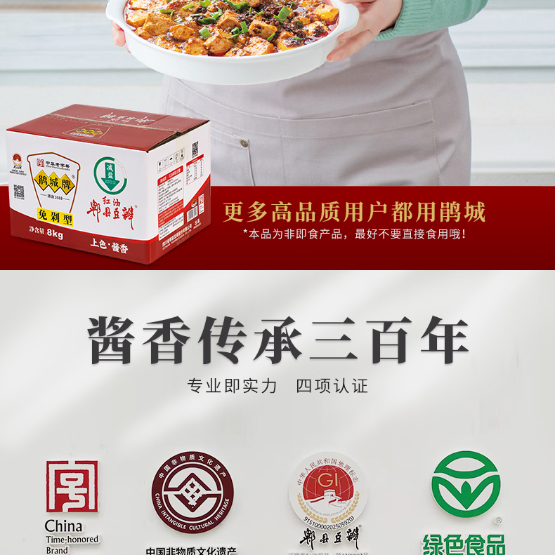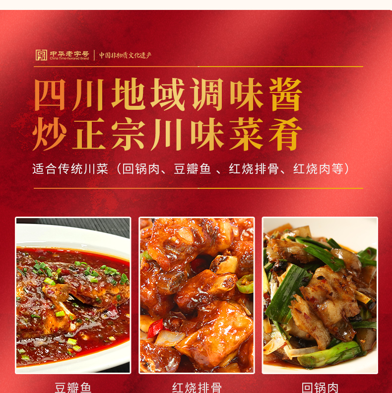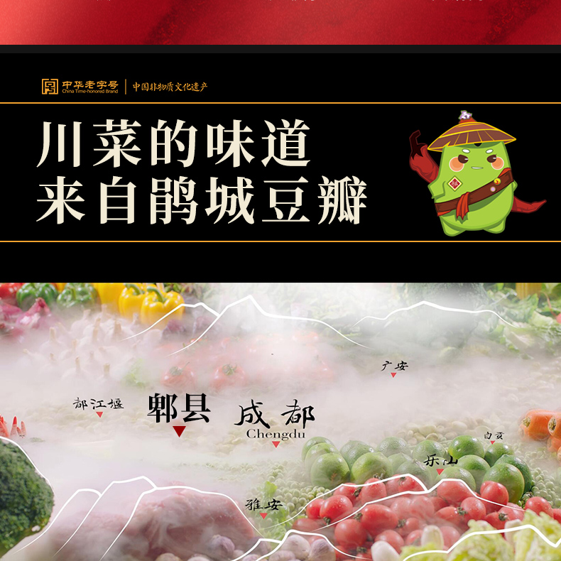 “鹃城牌“郫县豆瓣,中华老字号企业,源于1688年,国有控股公司,郫县豆瓣行业龙头企业和行业标准化生产示范工厂,中国非物质文化遗产郫县豆瓣传统制作技艺传承企业。 获“中华老字号”、“中国非物质文化遗产