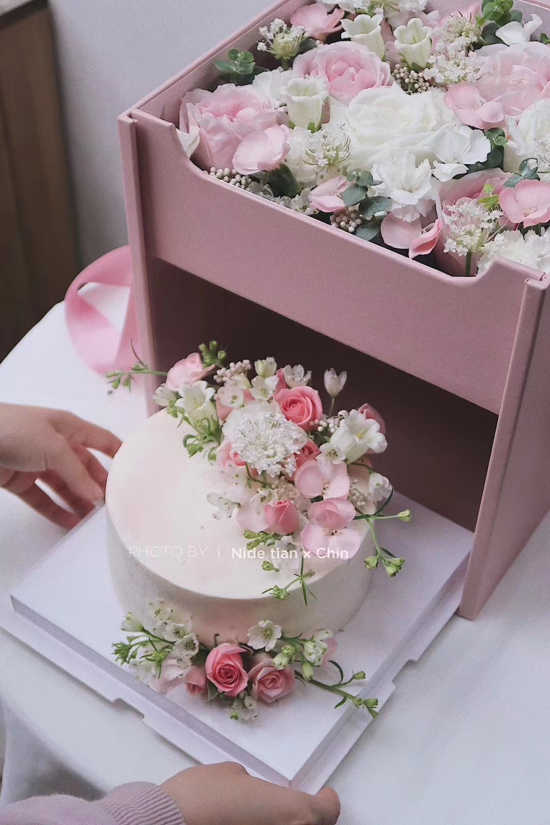 双层唯美礼盒 上层定制花盒 下层玫瑰荔枝双层果冻夹心蛋糕 爱意满满