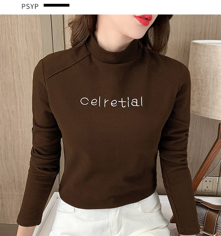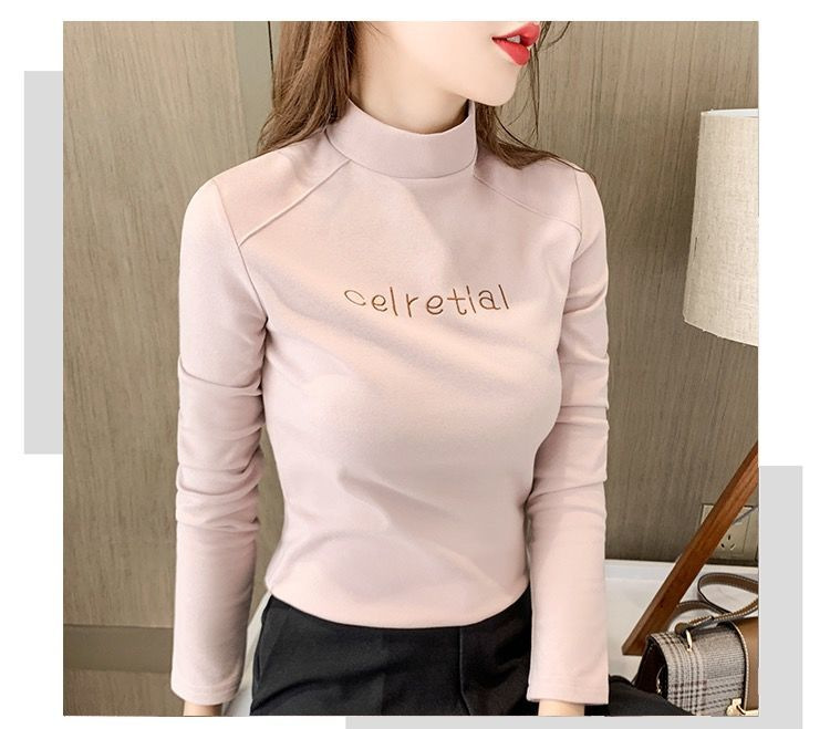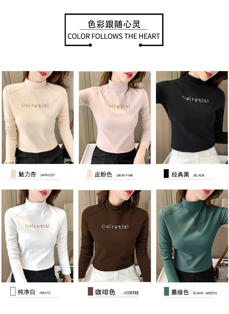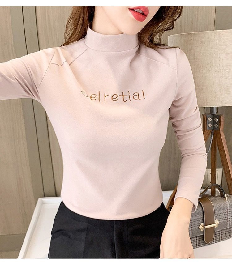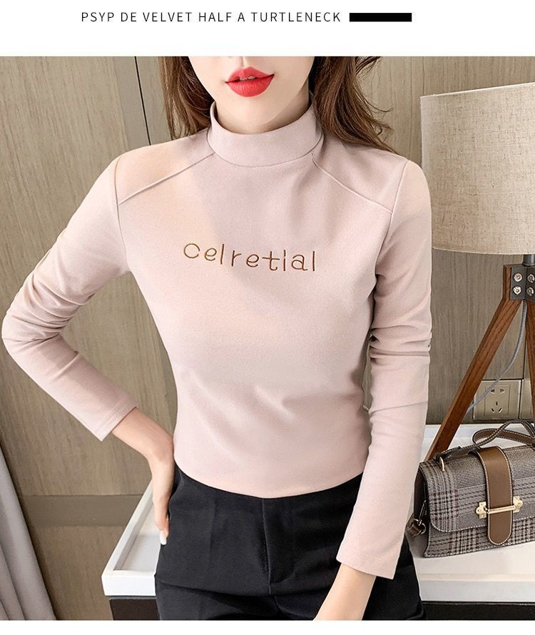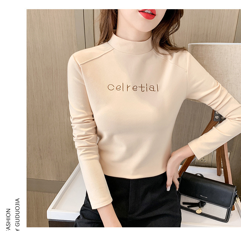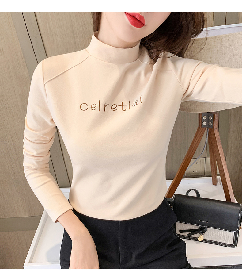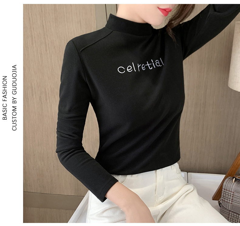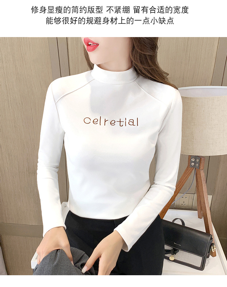双面德绒保暖上衣女半高领刺绣打底衫女秋冬休闲内搭t恤长袖女装