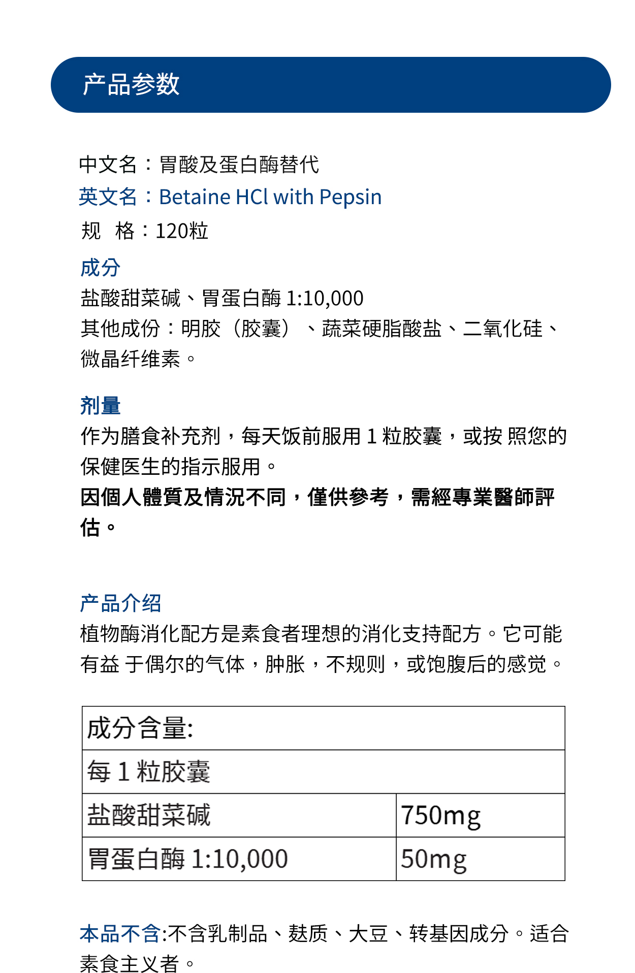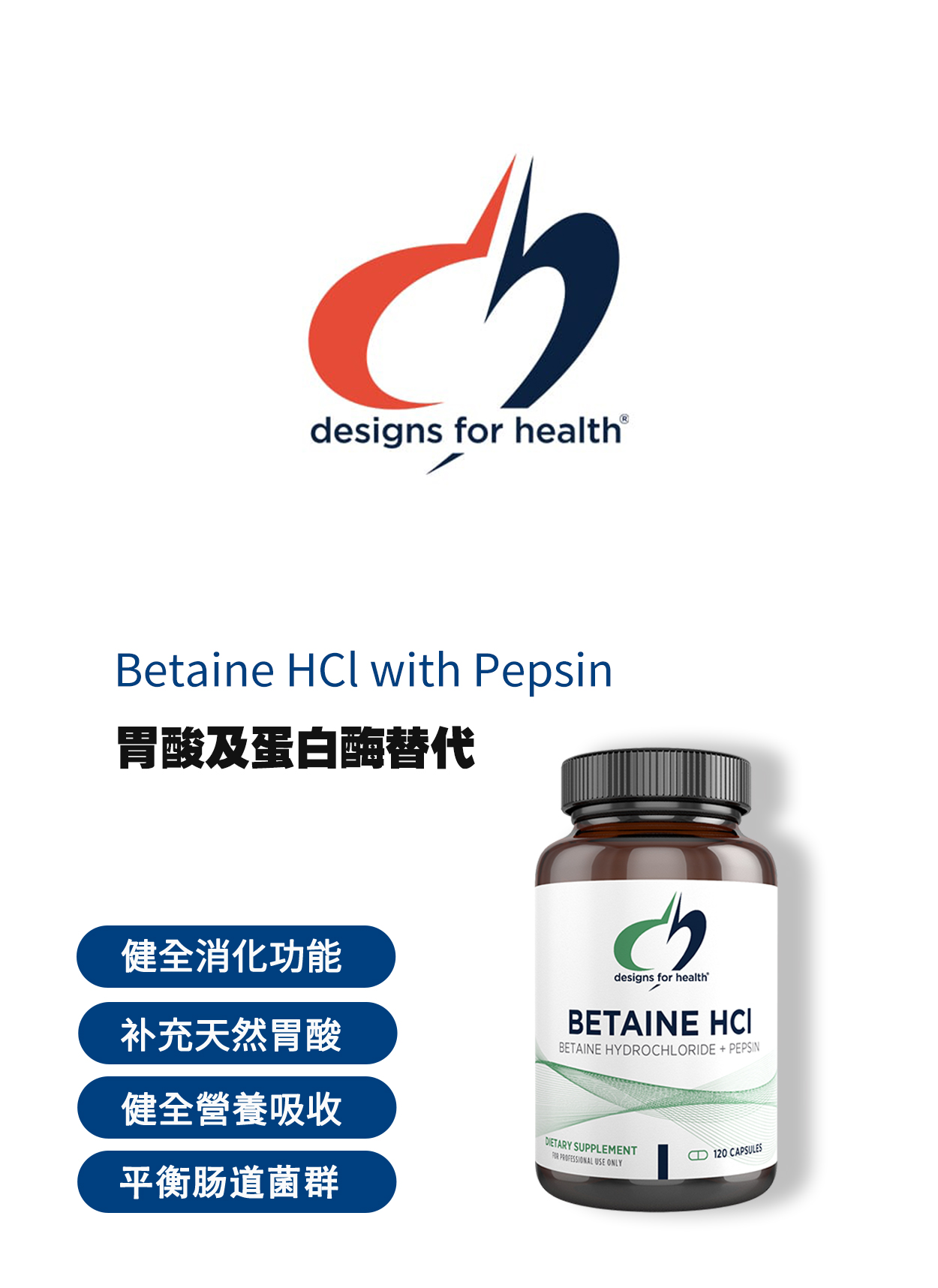 美国DFH #胃酸及蛋白酶替代 #BETAINE HCI补充胃蛋白酶 #盐酸甜菜碱120粒