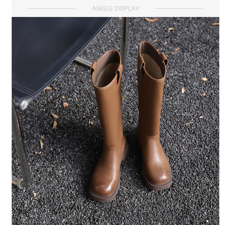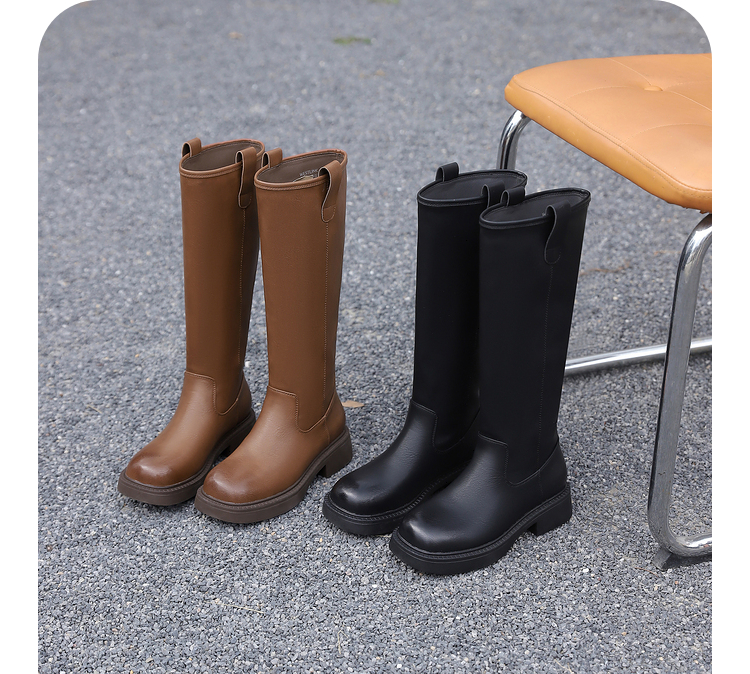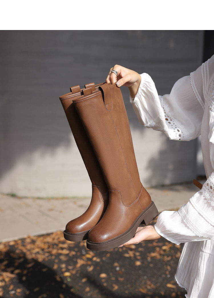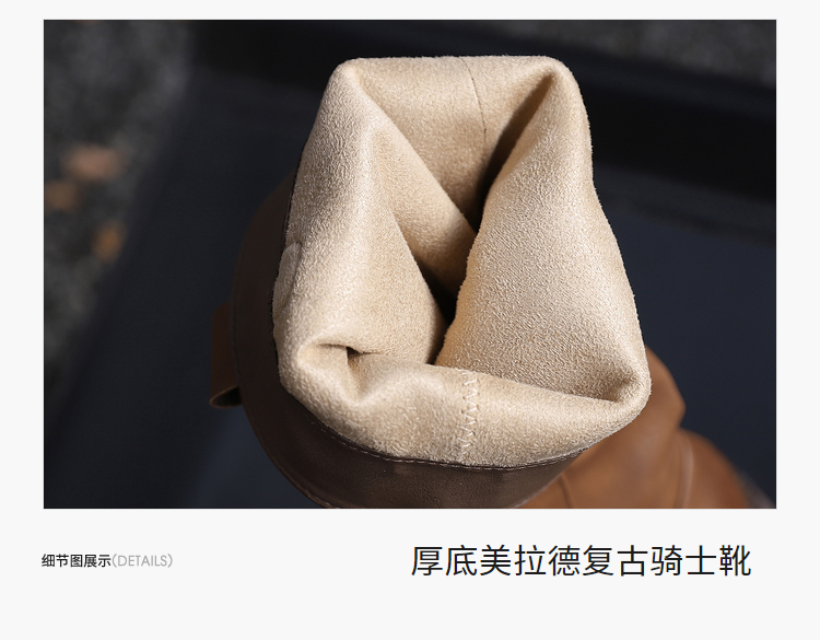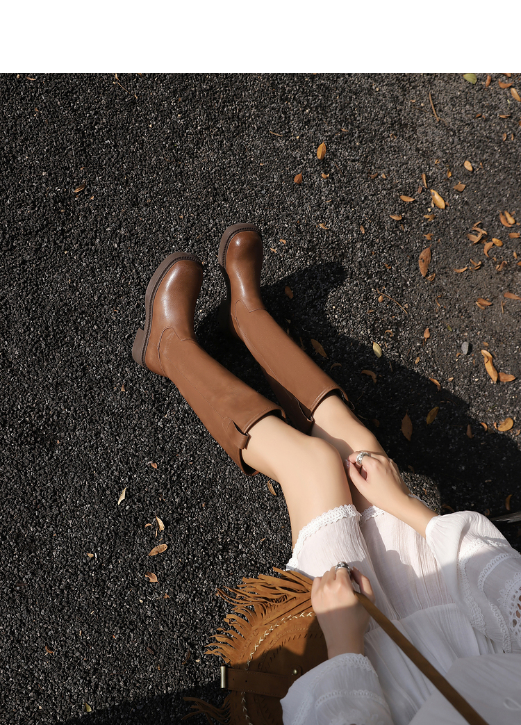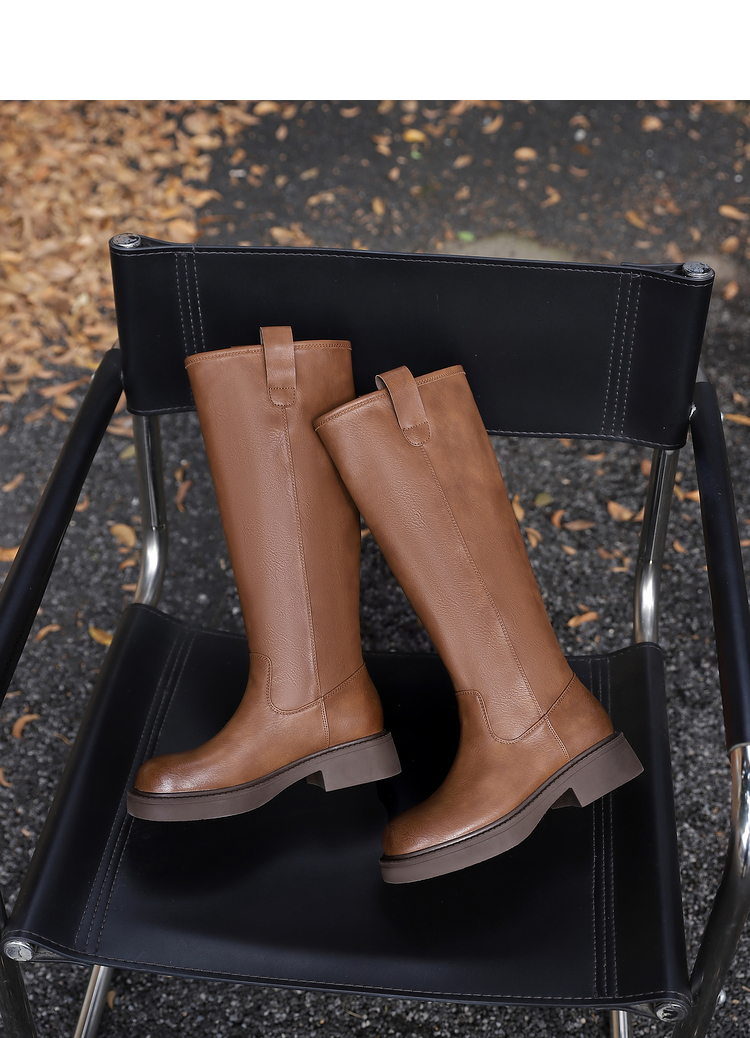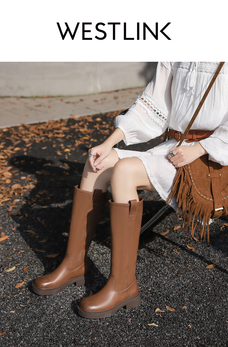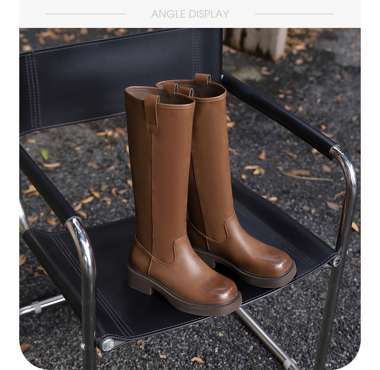 西遇复古骑士靴女新款秋冬美拉德长筒靴棕色方头厚底高筒长靴V0034339
