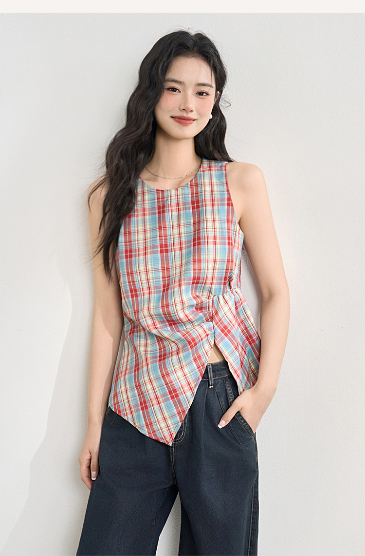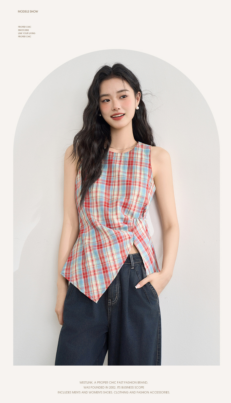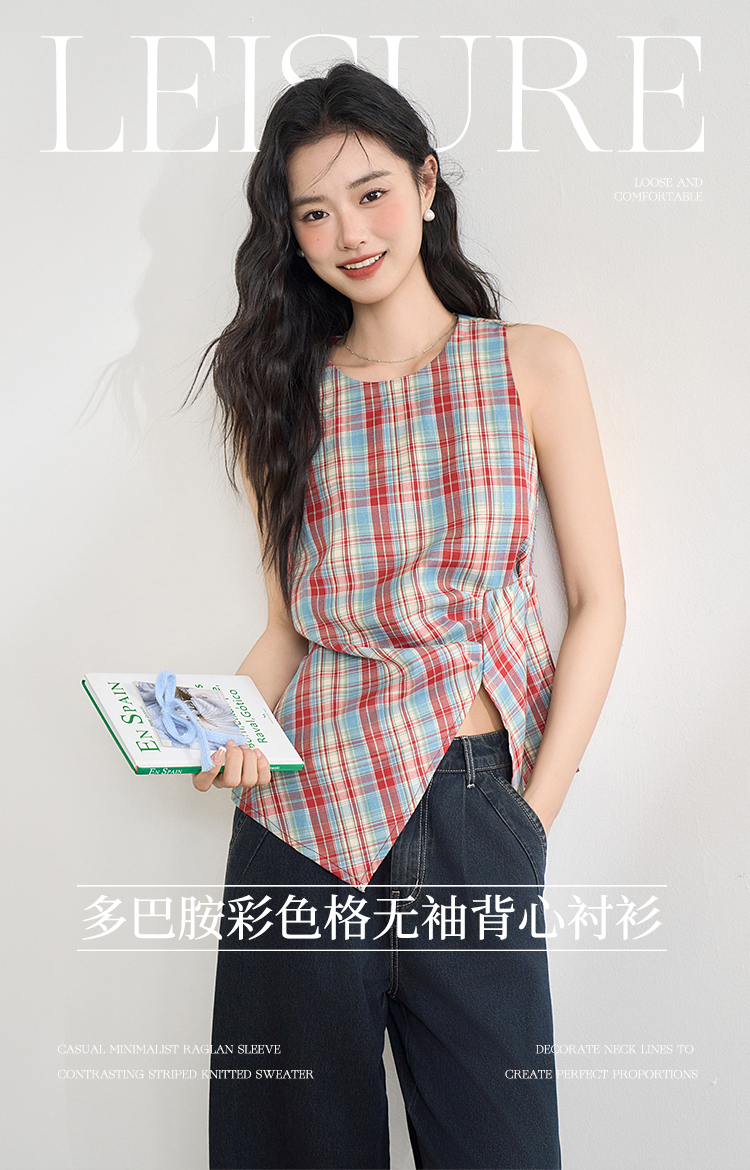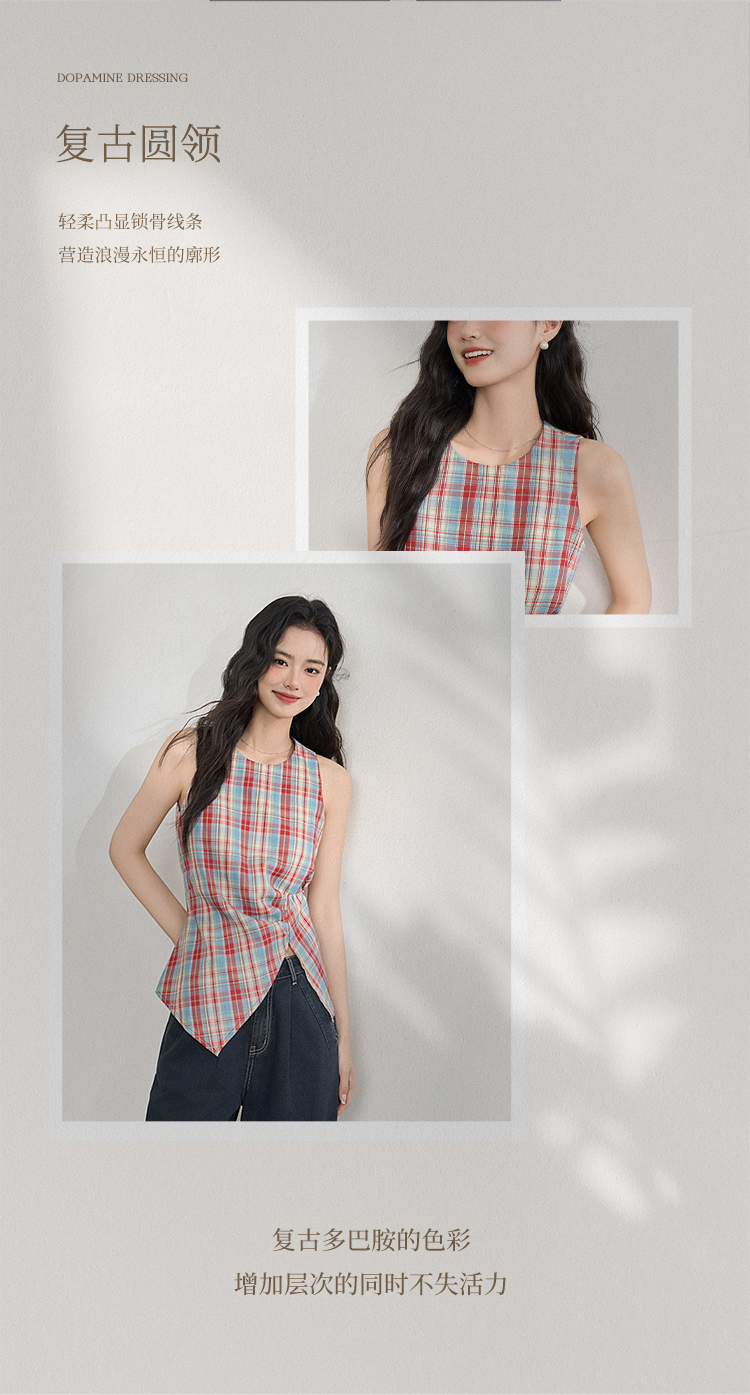 【复古多巴胺】不规则设计感彩色格子衬衣女夏季背心上衣V1050592