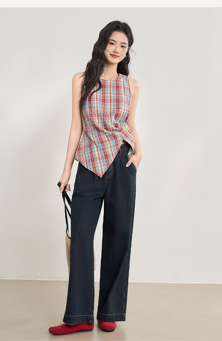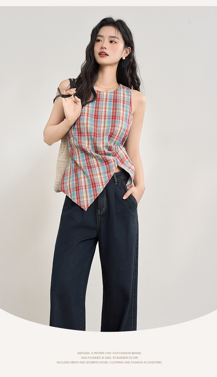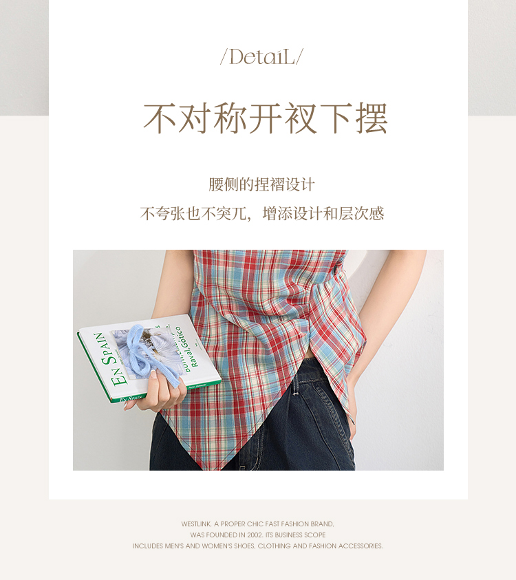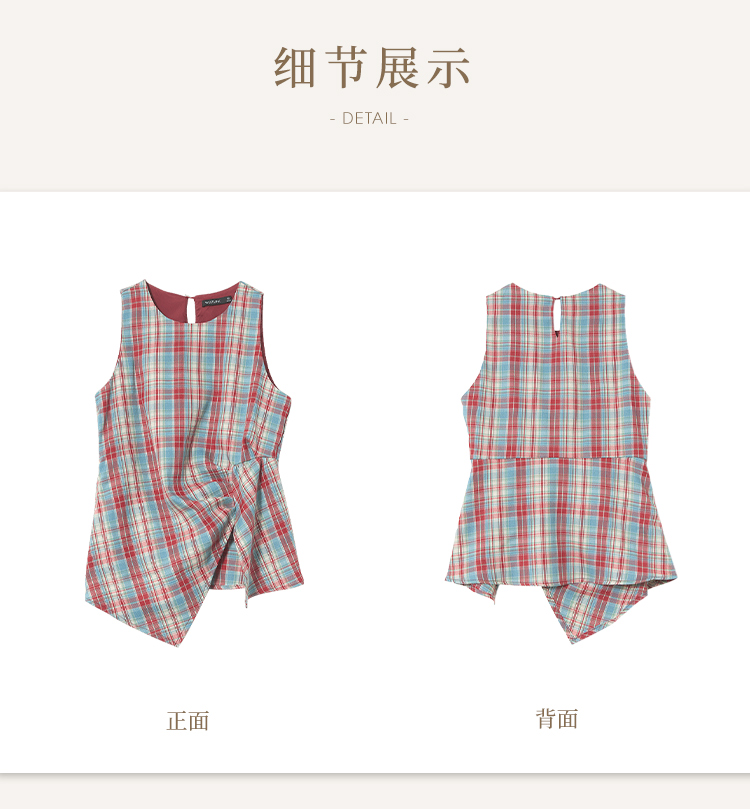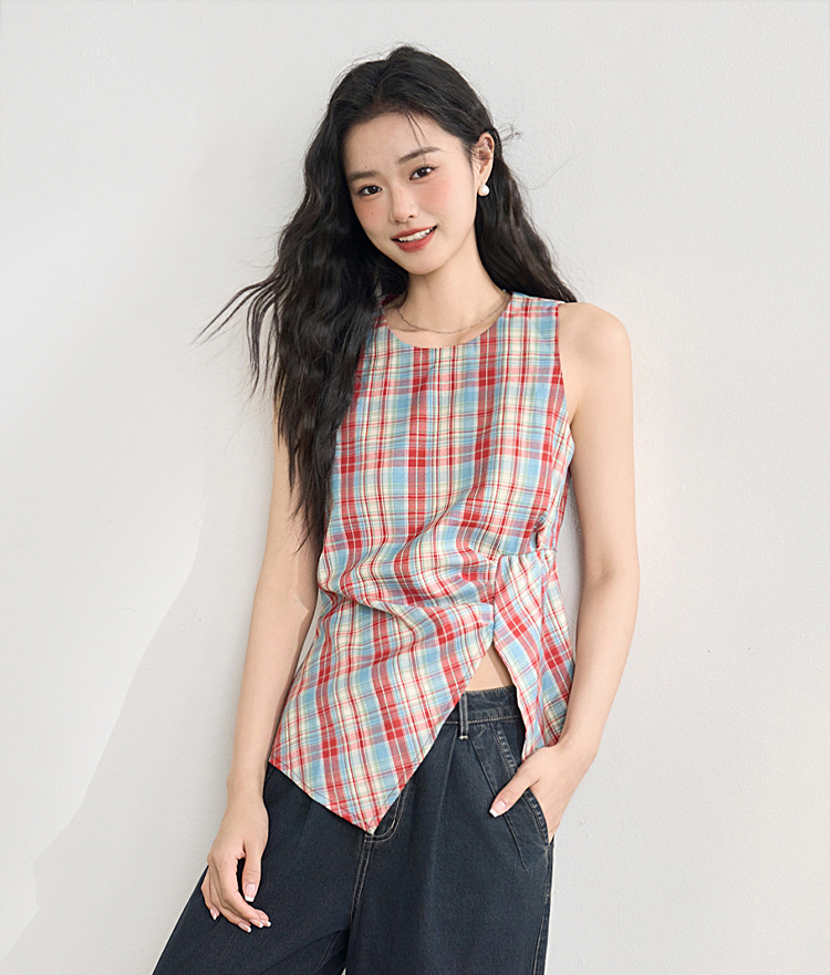 【复古多巴胺】不规则设计感彩色格子衬衣女夏季背心上衣V1050592