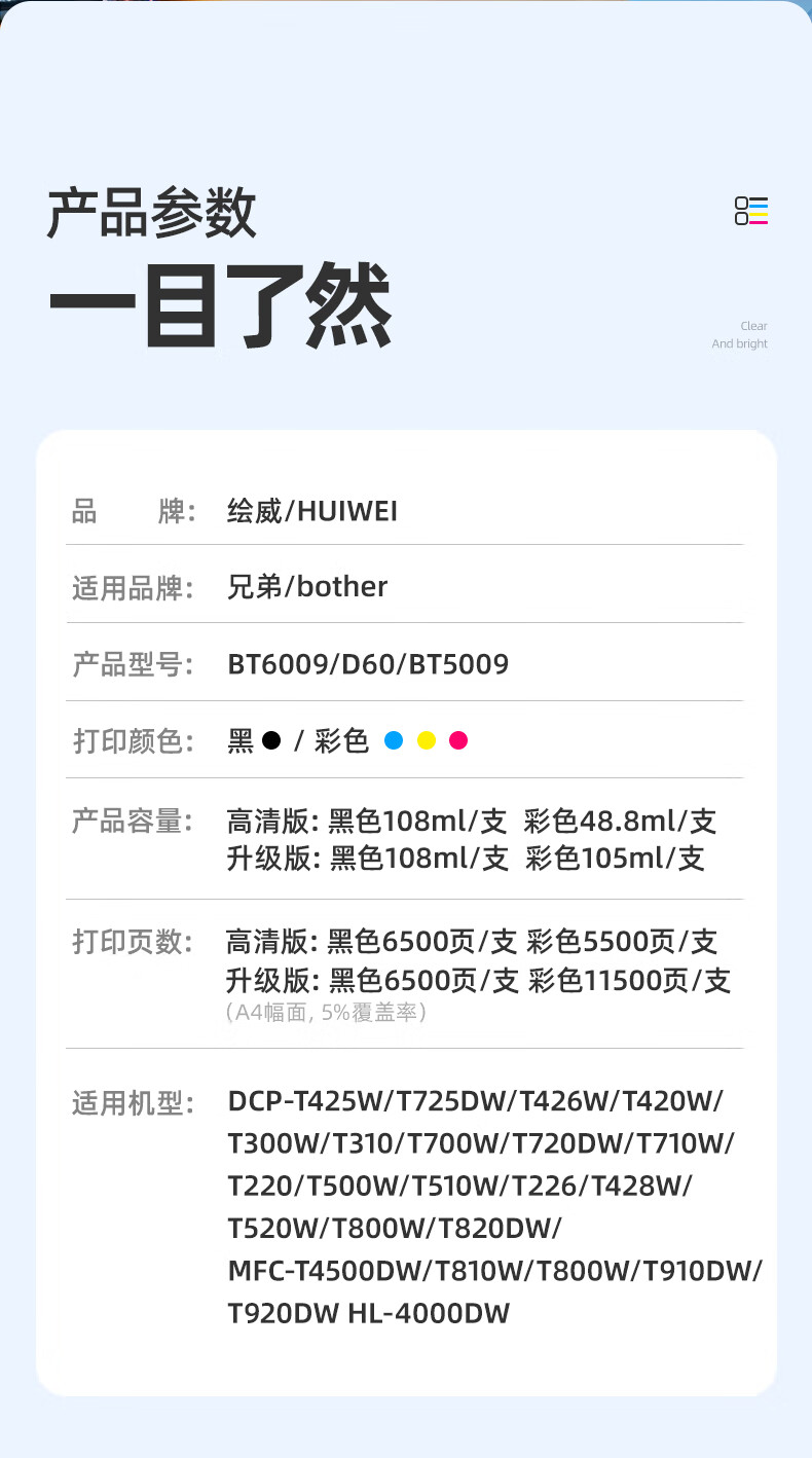 绘威BTD60BK/5009墨水 适用兄弟DCP-T425W T725DW T426W 420W T310 720DW 710W T220 brother打印机墨水 四色