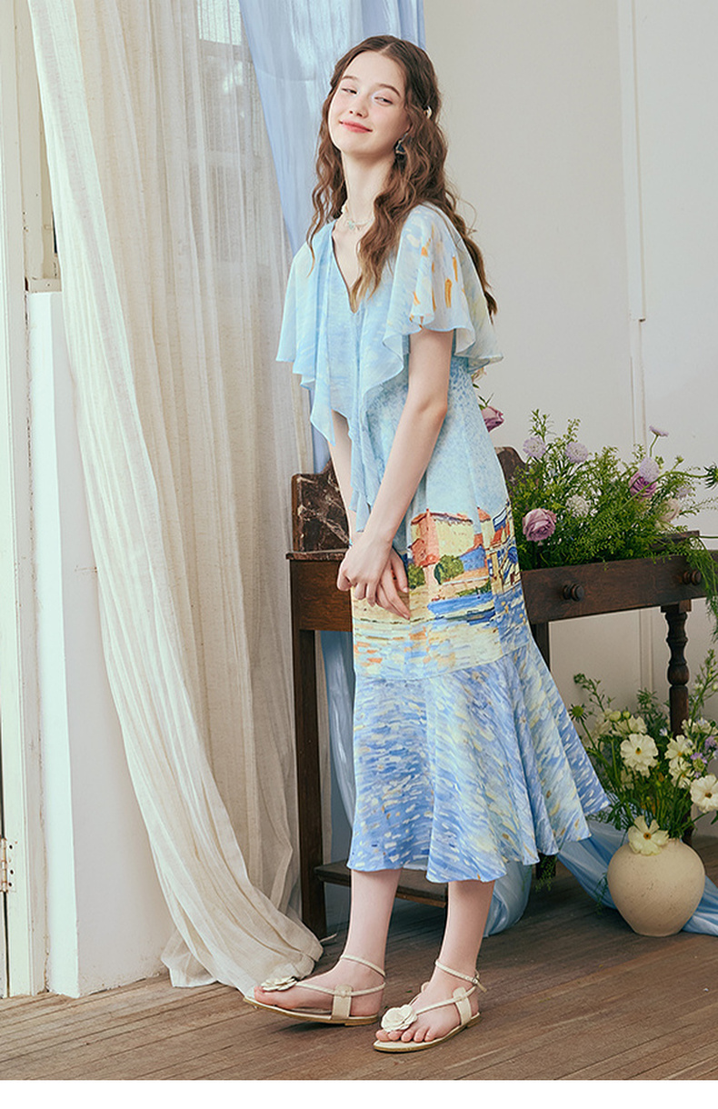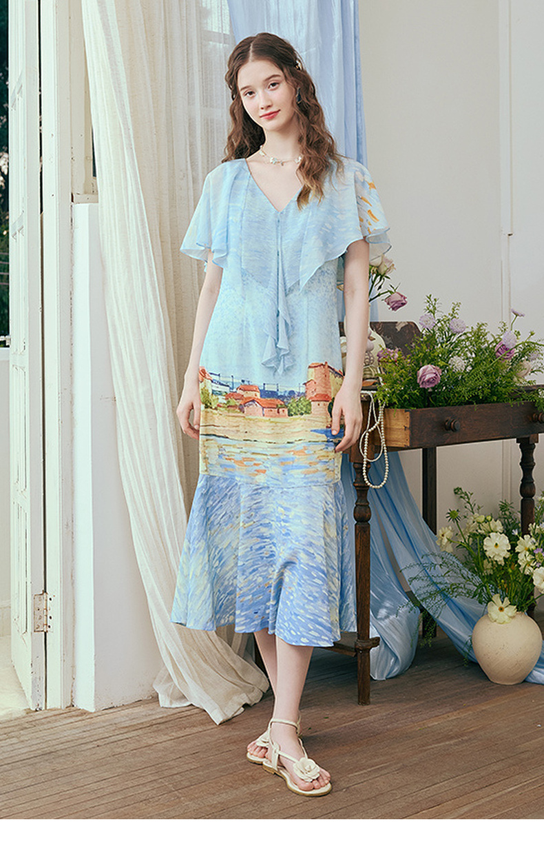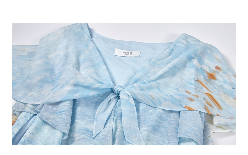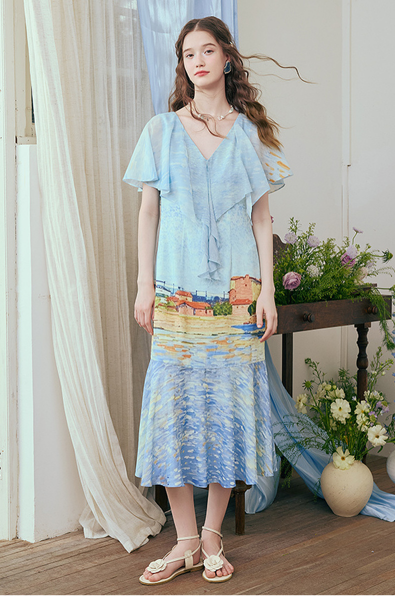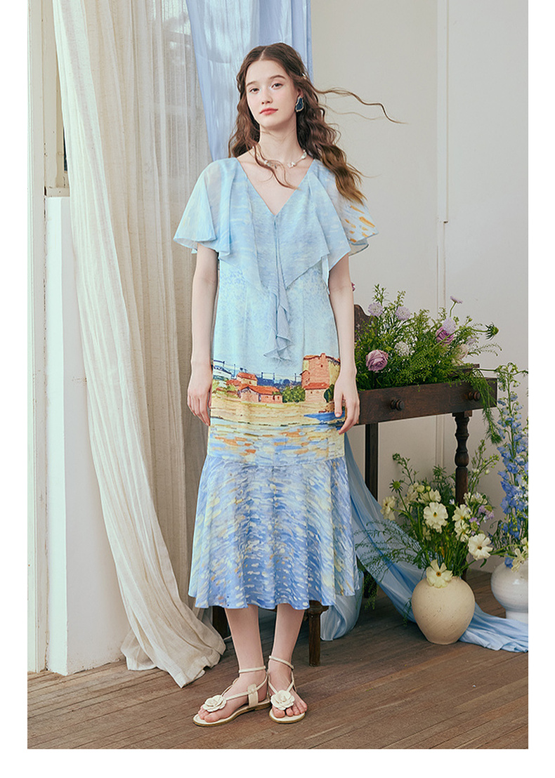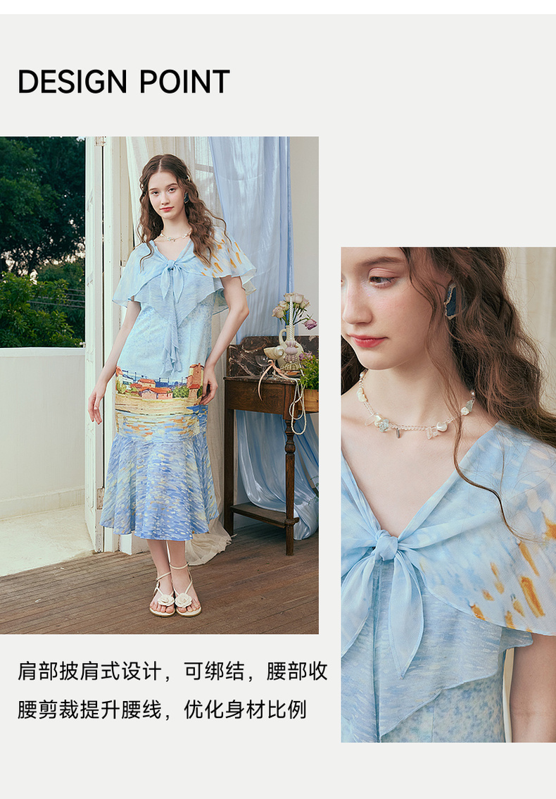 两三事 听潮踏浪 2025夏季新款仙女风披肩式绑带领印花连衣裙长裙