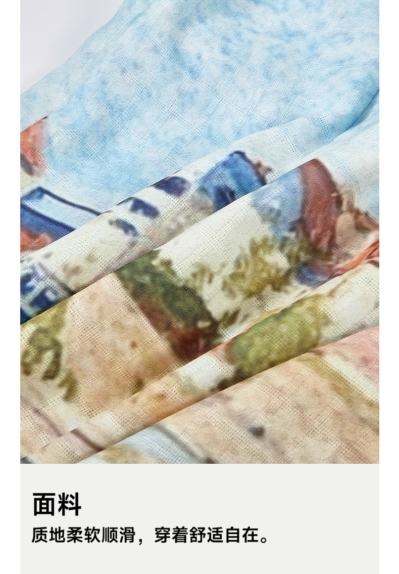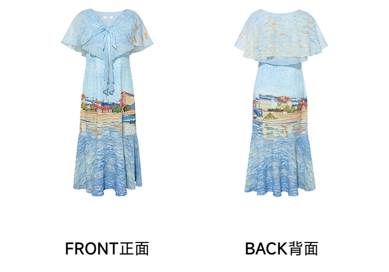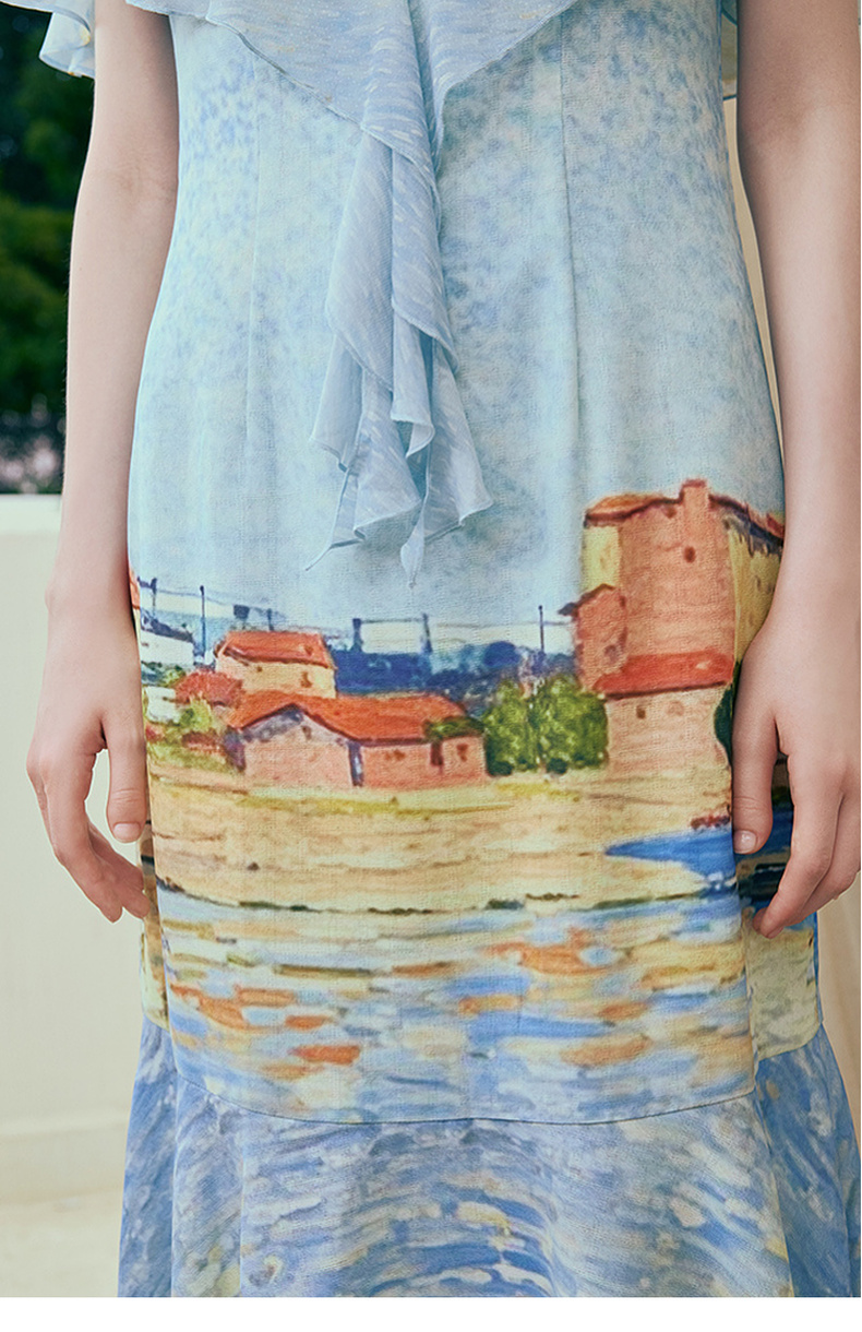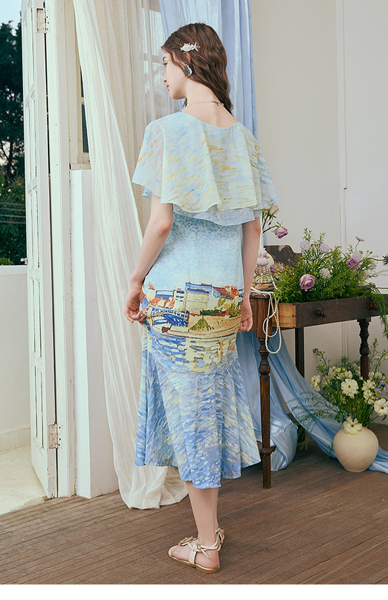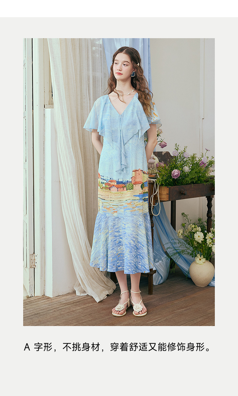 两三事 听潮踏浪 2025夏季新款仙女风披肩式绑带领印花连衣裙长裙